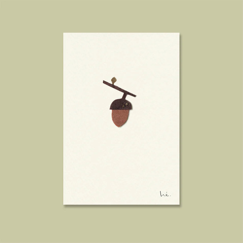 This postcard contains the pigment ink print of a paper cut acorn, part of the nature series.