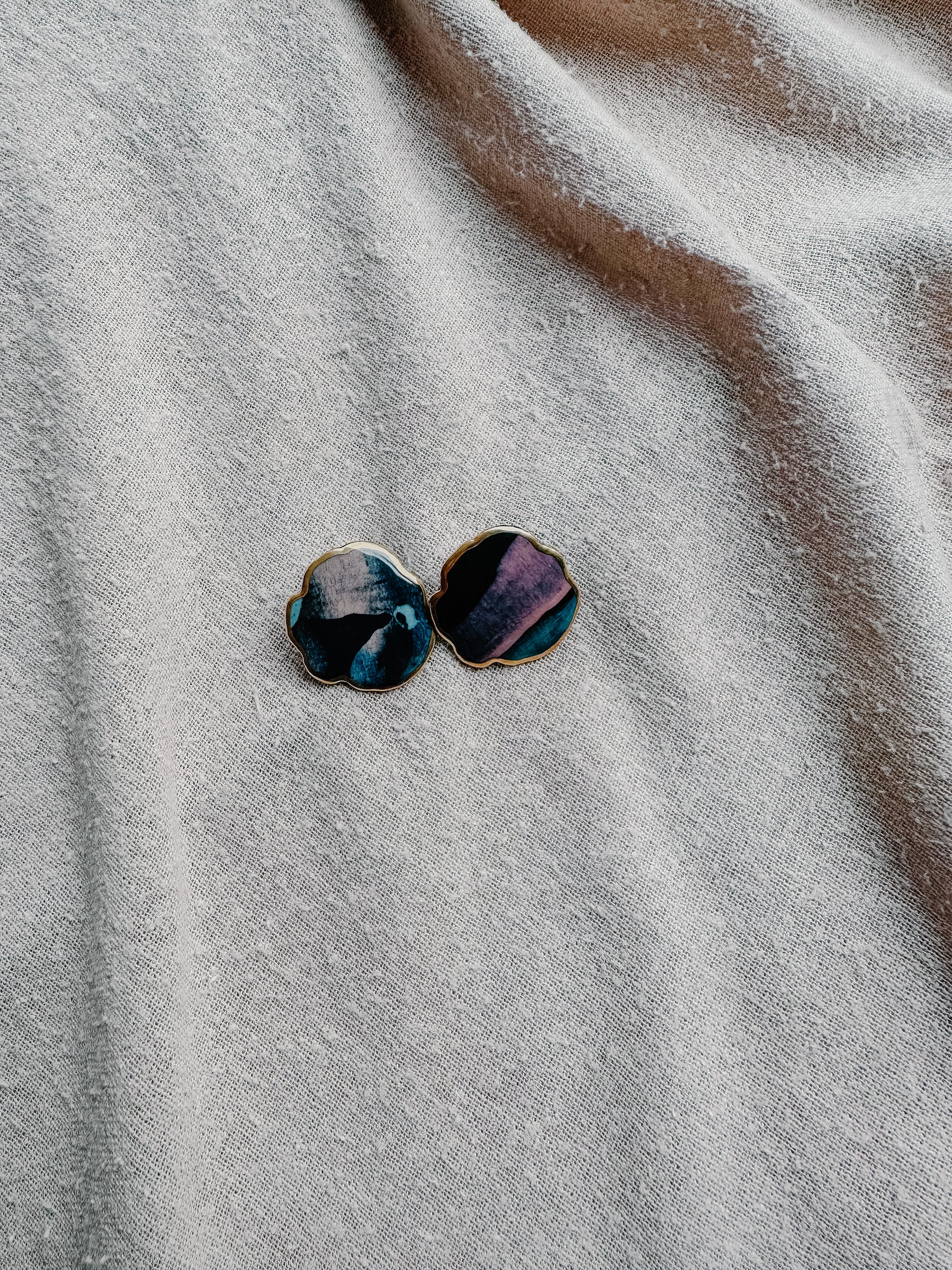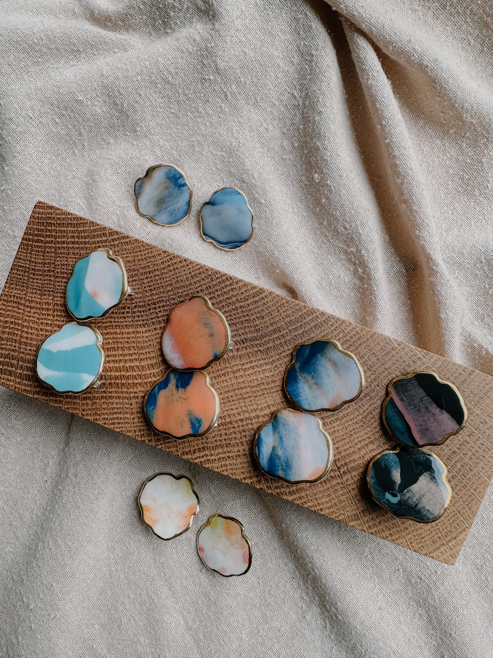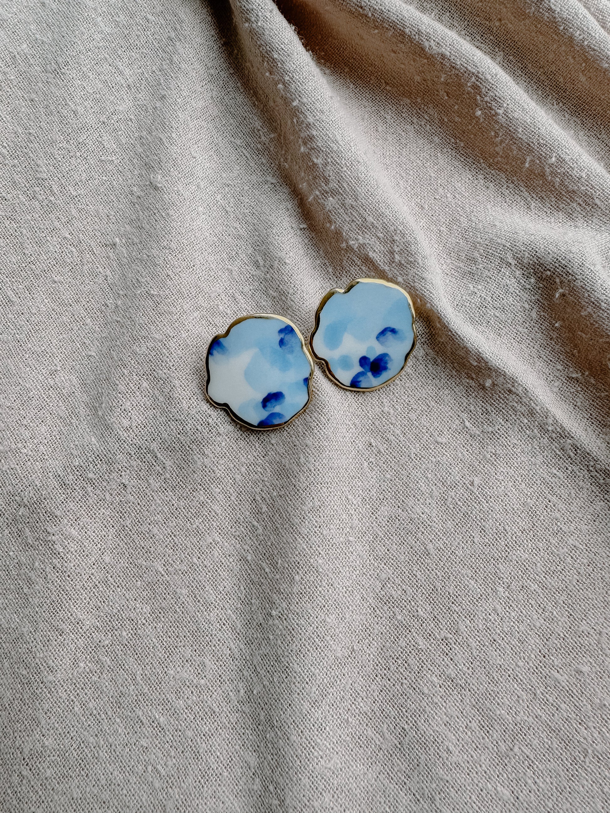 Diana Cojocaru’s statement earrings are hand-sculpted in porcelain, hand-painted using ceramic watercolors, fired in the kiln, and detailed with 24k gold or platinum. Earring post and clutch are made from sterling silver. Each piece is light and comfortable to wear.