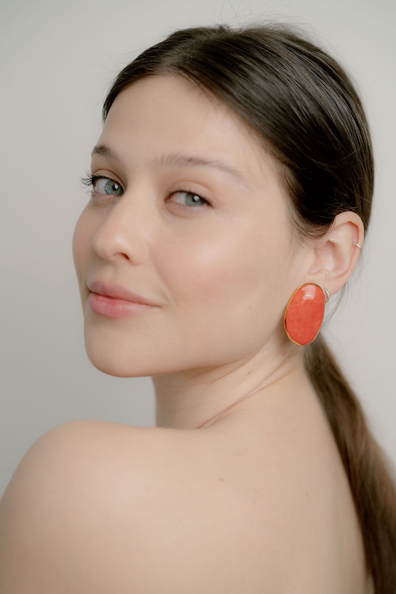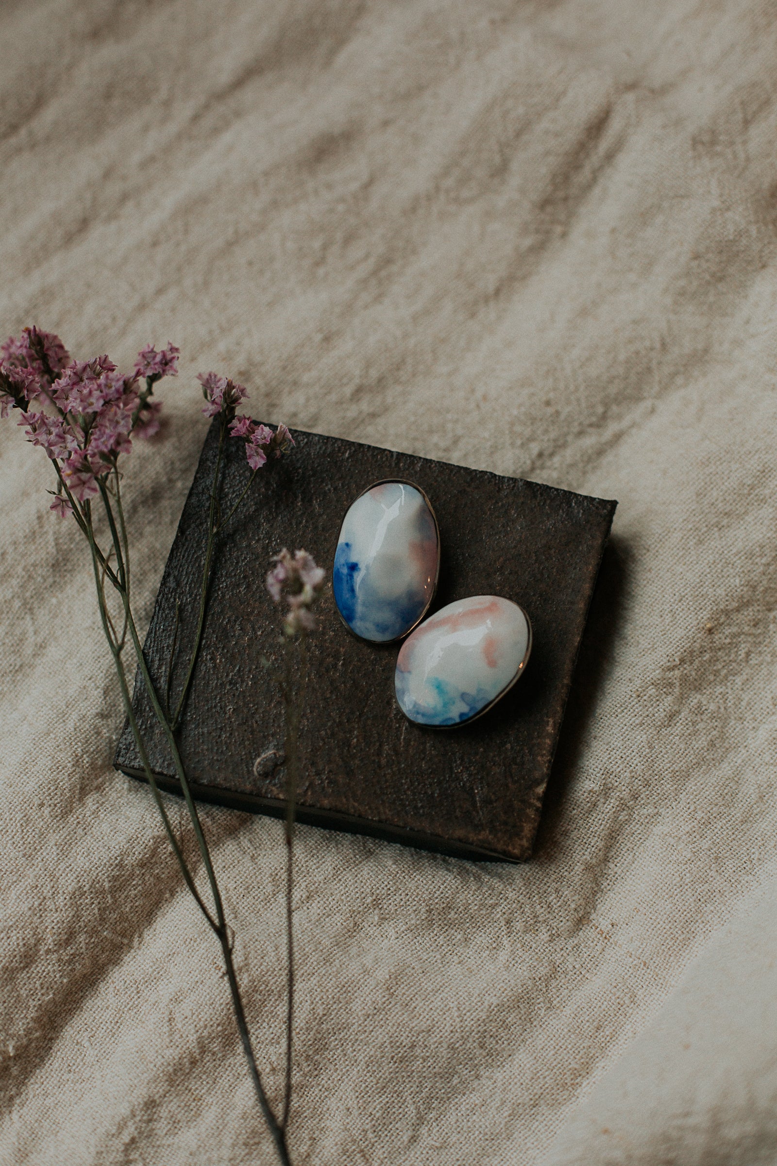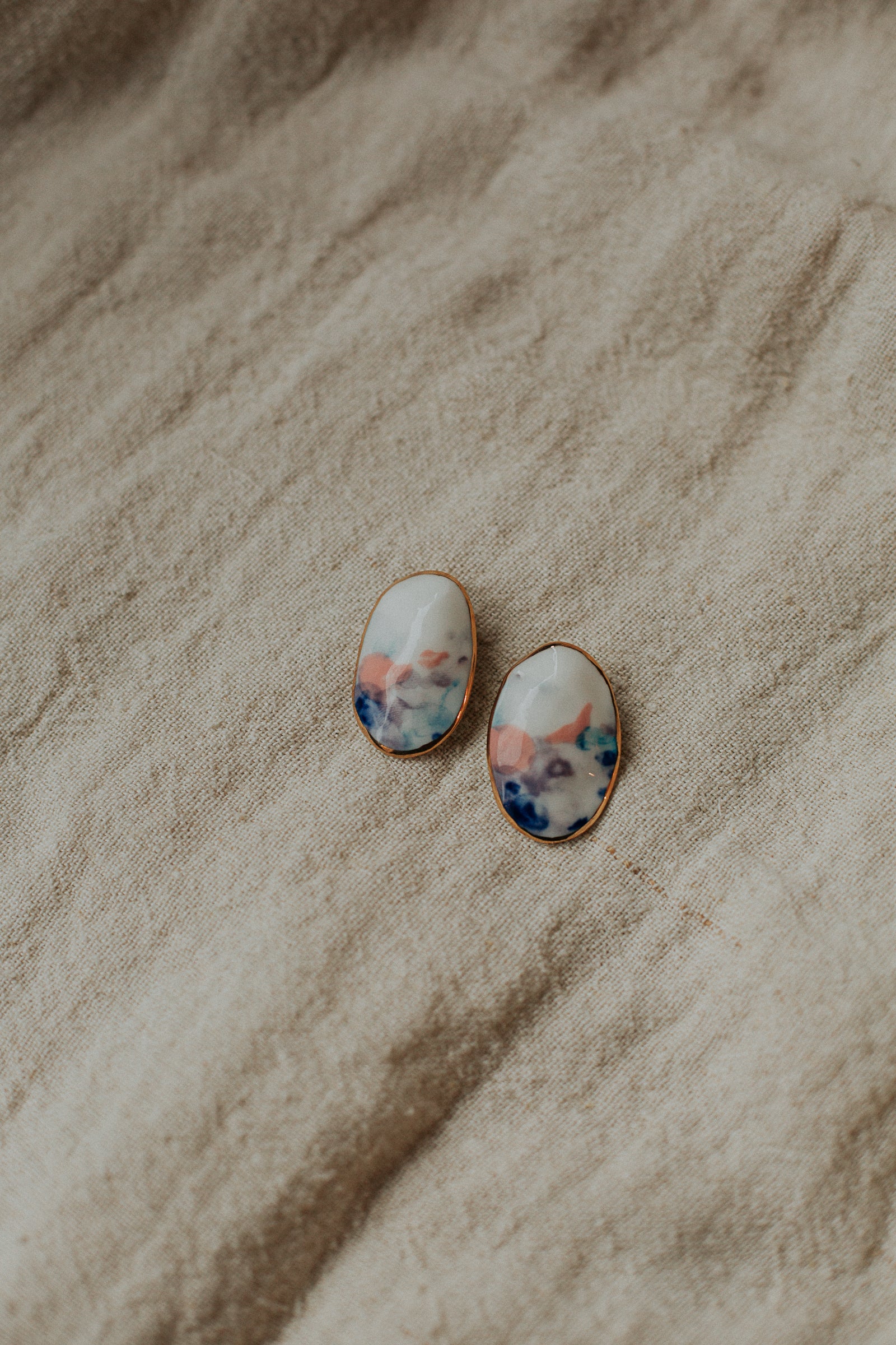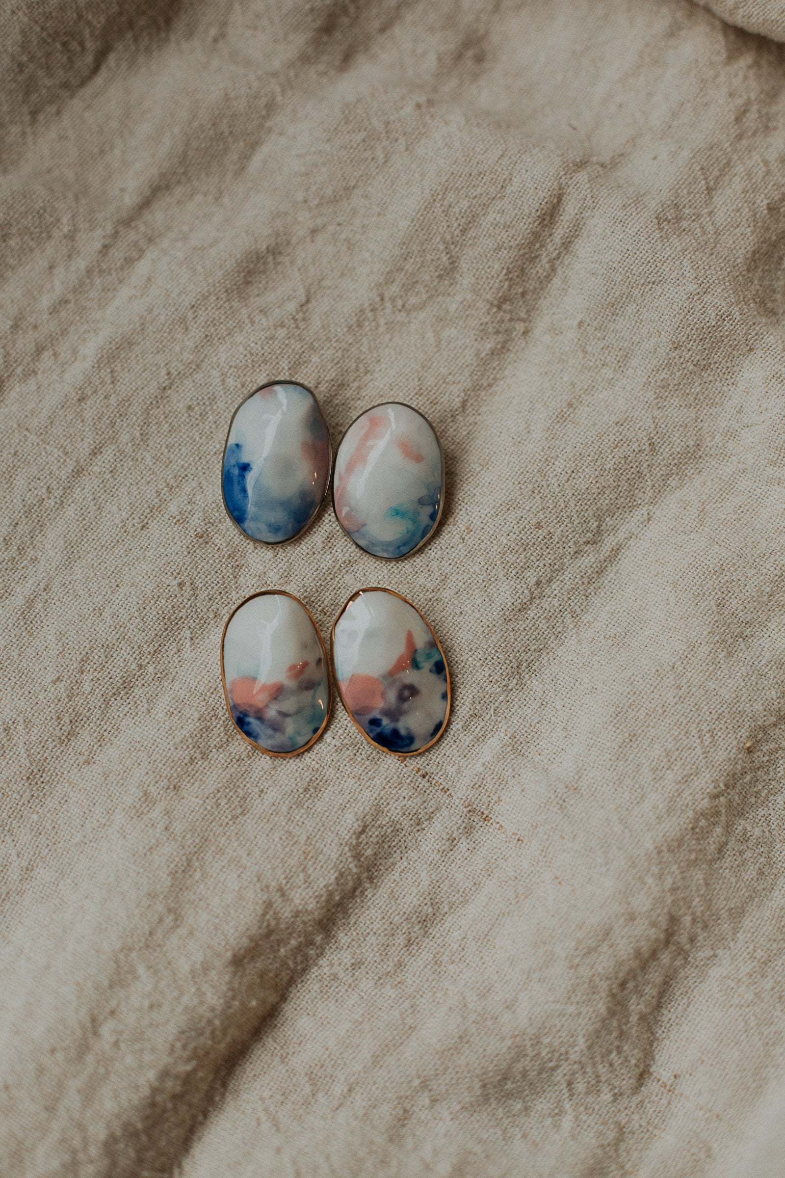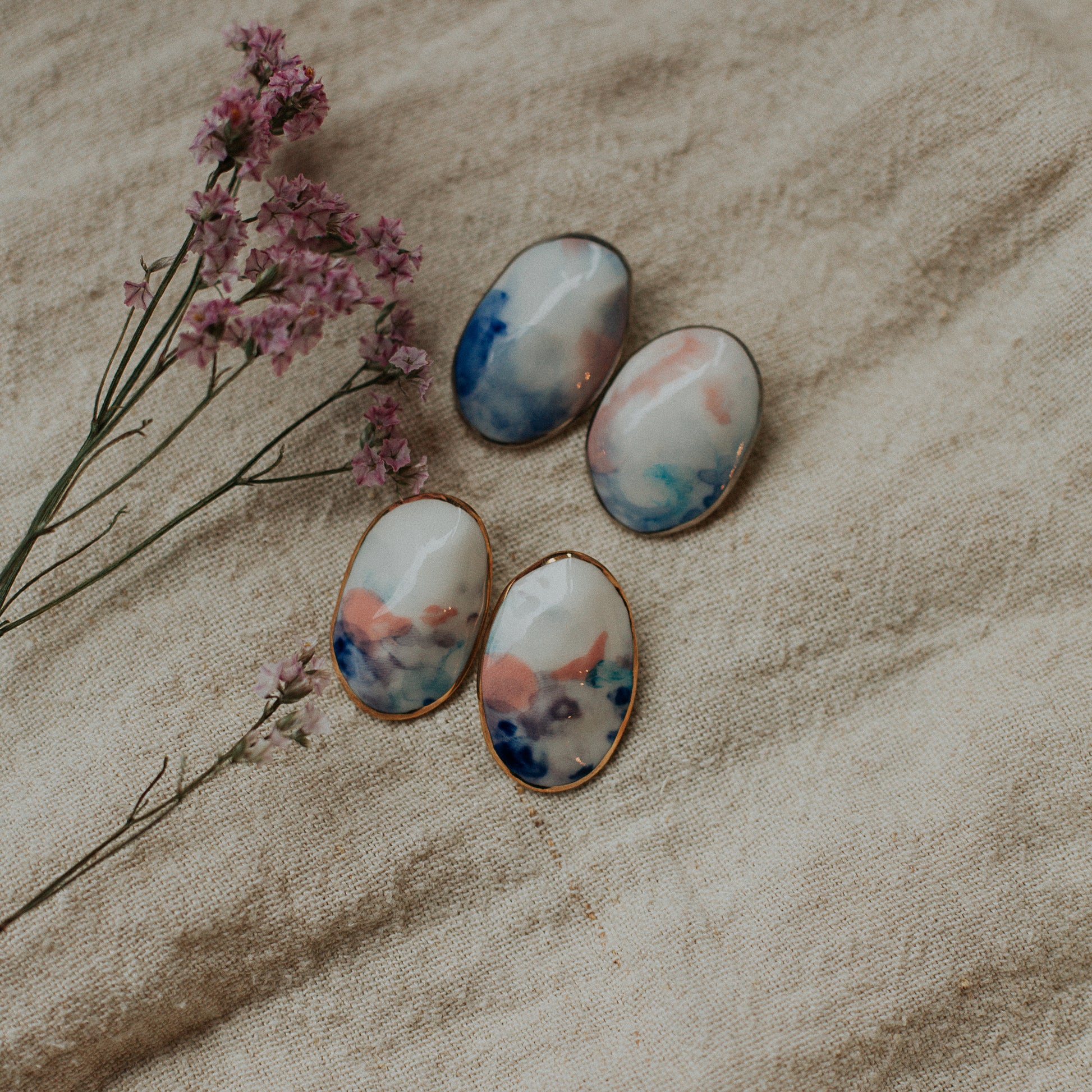 Diana Cojocaru’s statement earrings are hand-sculpted in porcelain, hand-painted using ceramic watercolors, fired in the kiln, and detailed with 24k gold or platinum. Earring post and clutch are made from sterling silver. Each piece is light and comfortable to wear.