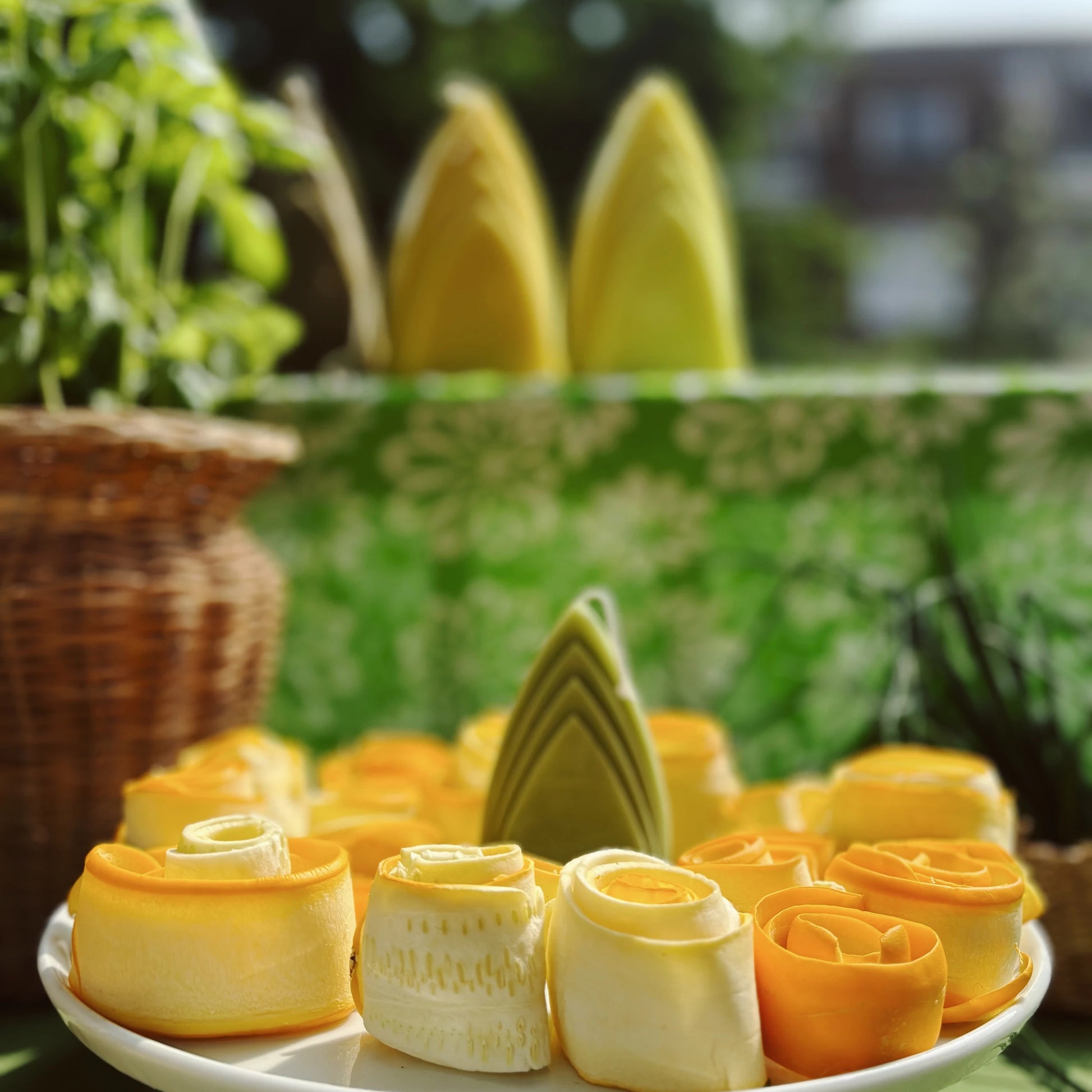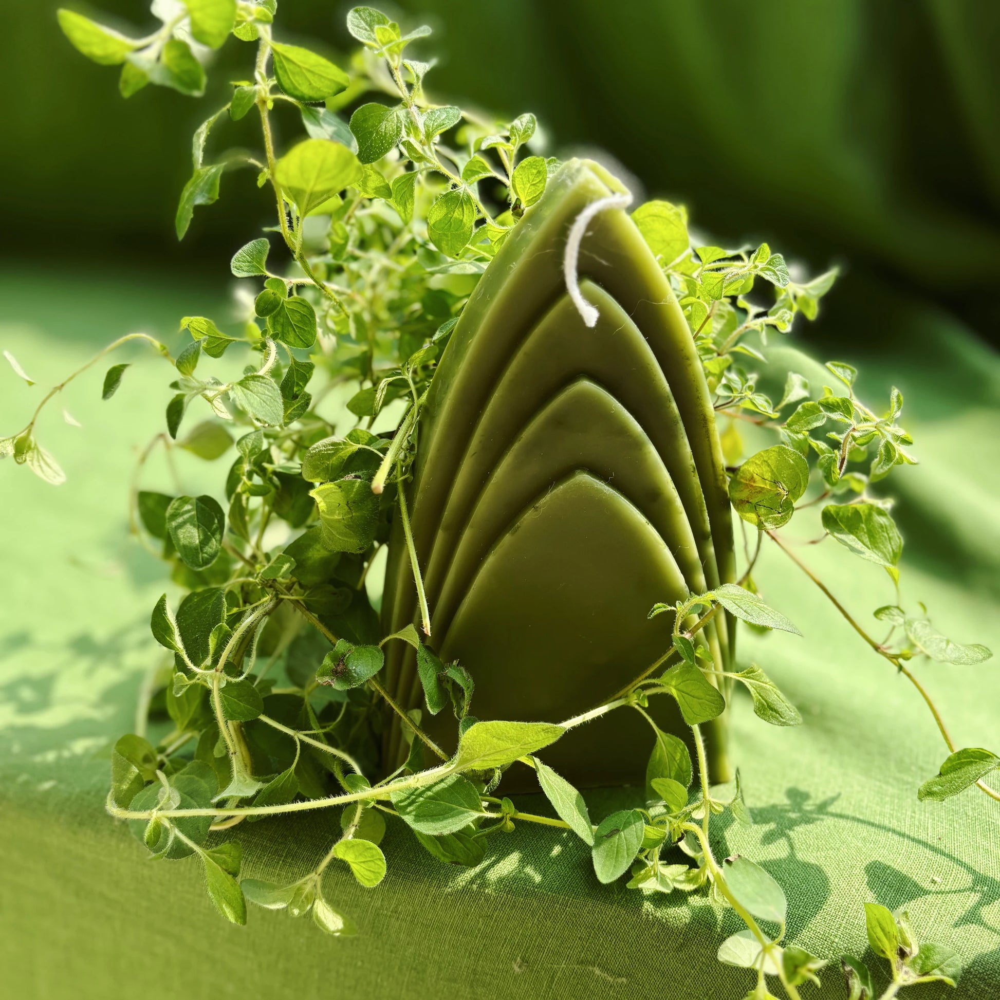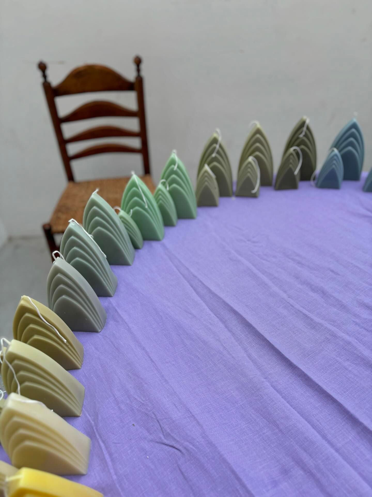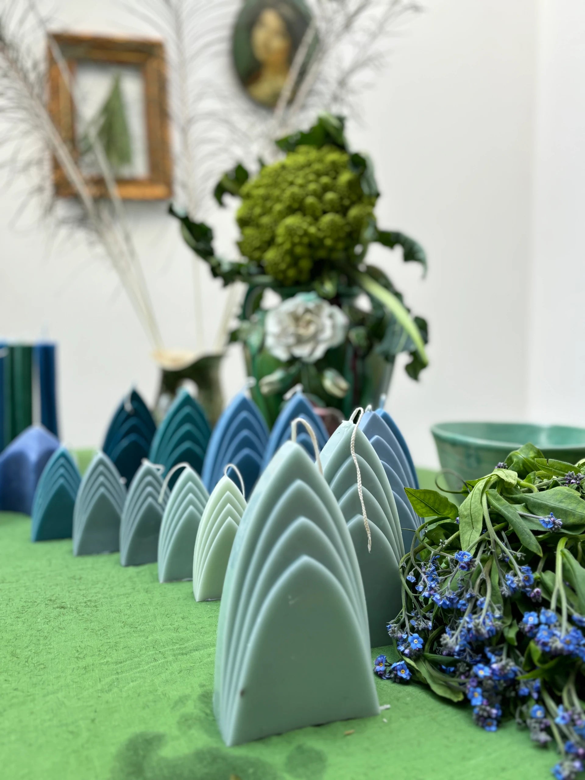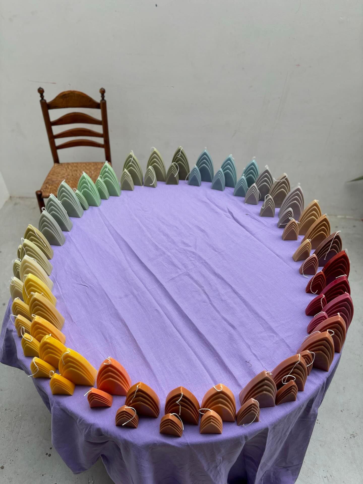 The arch candles are made of pure beeswax. The colors come from pieces of wax crayons (remember those Stockmar wax crayons that Små Spor sell or the Copito wax crayons that we sell?) that Sanne combines just right to make any color on the palette come through. The burn-time for the big arches is 32 hours (5 evenings), while for the small arches it is about 8-ish hours (2 dinnertimes). As with our other beeswax candles, we strongly advise you to collect any leftover wax for arts and crafts.