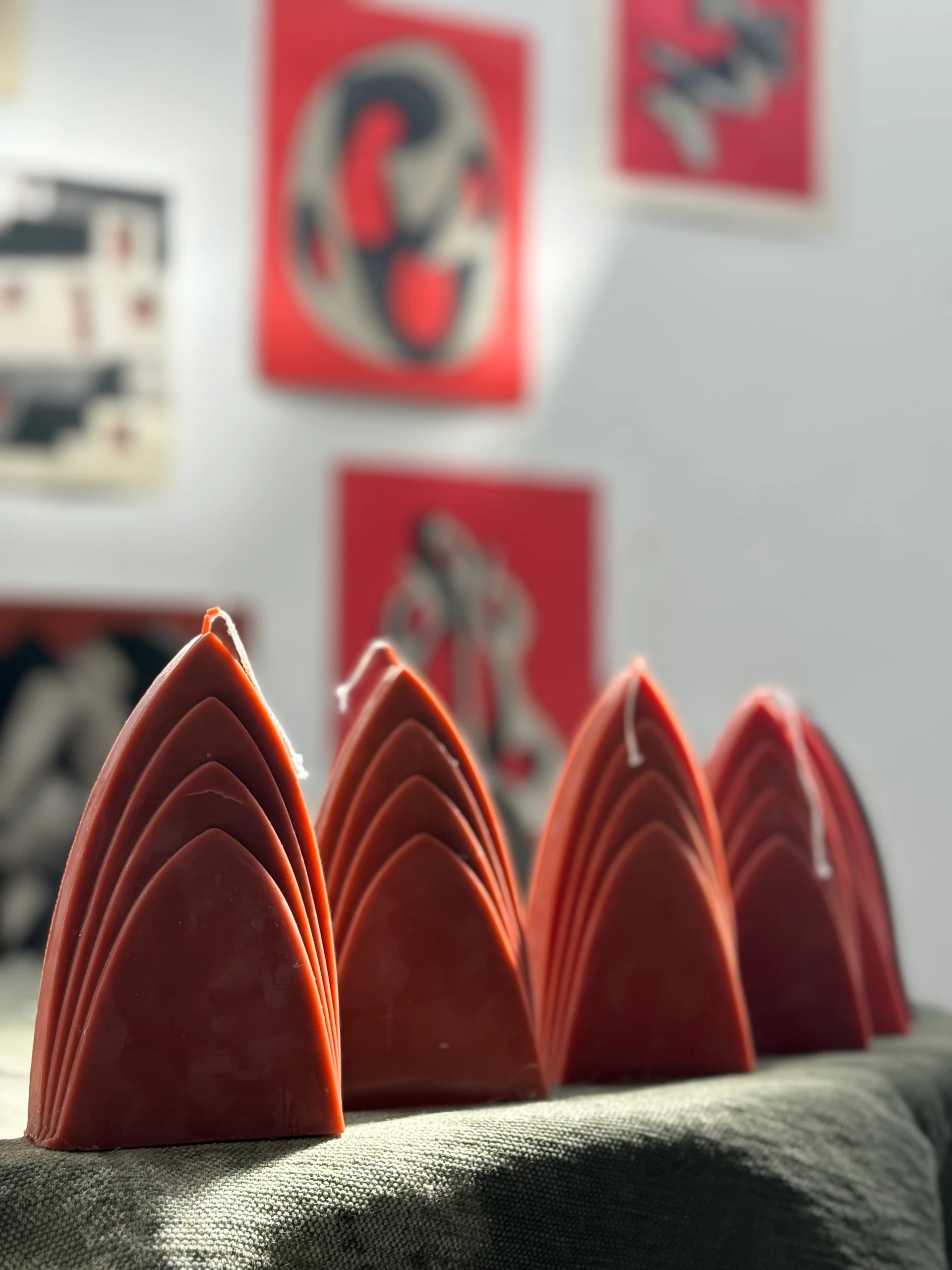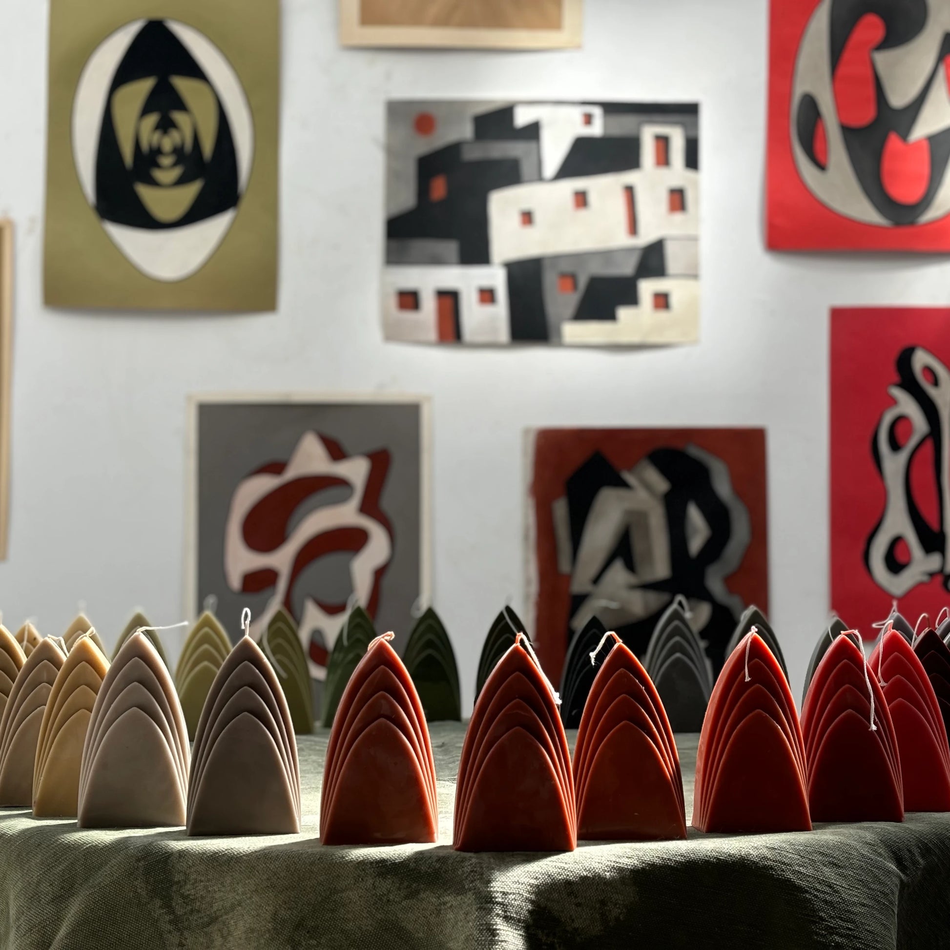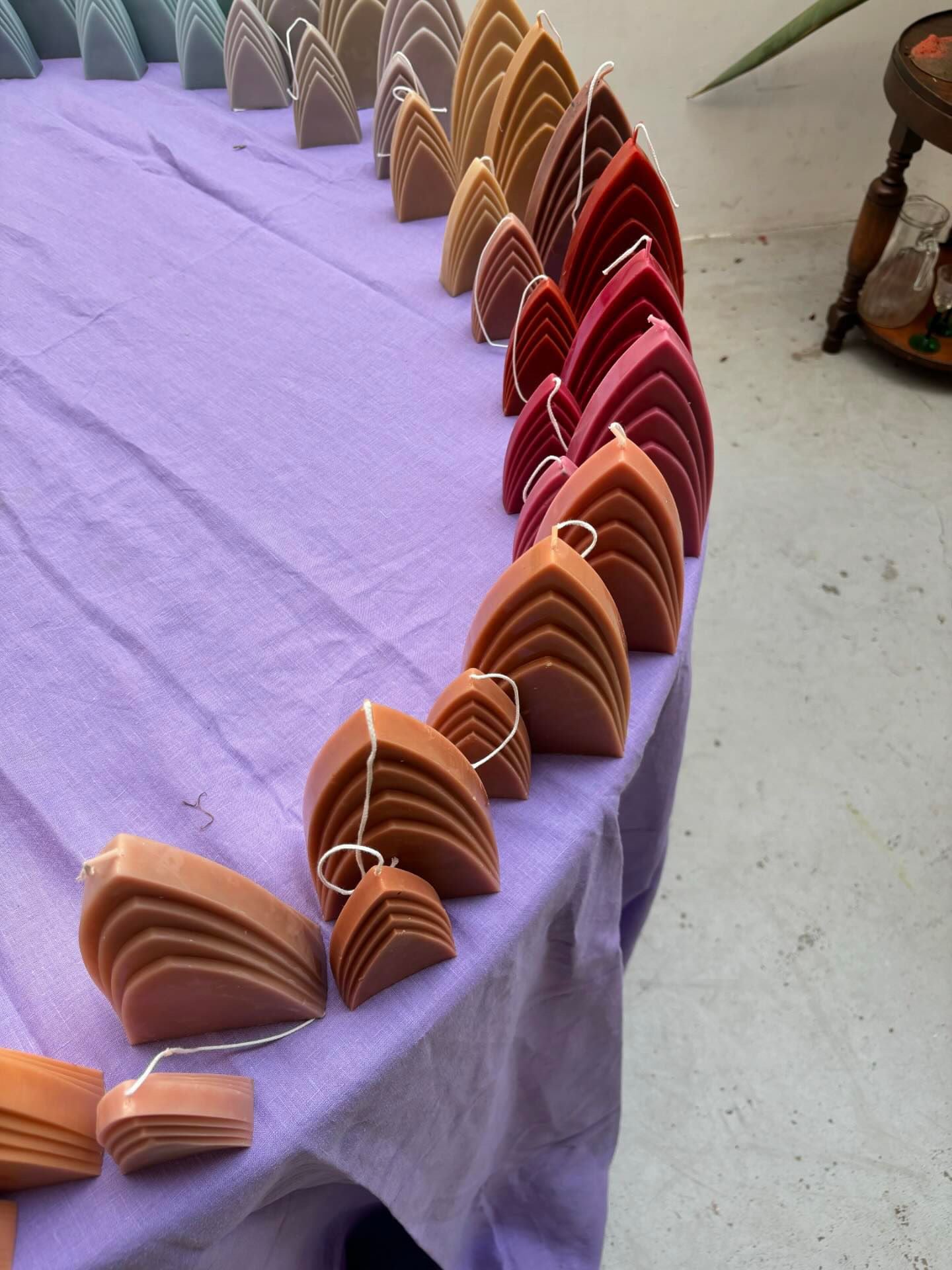The arch candles are made of pure beeswax. The colors come from pieces of wax crayons (remember those Stockmar wax crayons that Små Spor sell or the Copito wax crayons that we sell?) that Sanne combines just right to make any color on the palette come through. The burn-time for the big arches is 32 hours (5 evenings), while for the small arches it is about 8-ish hours (2 dinnertimes). As with our other beeswax candles, we strongly advise you to collect any leftover wax for arts and crafts.