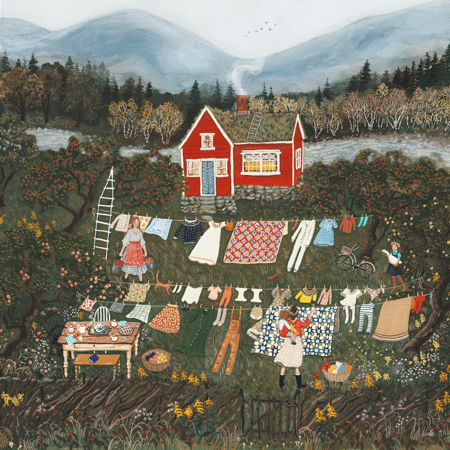 The Brambly Hedge postcard is a 12x12cm reproduction of the original gouache painting, printed with archival inks on cold-pressed watercolor paper to create a museum-quality print, resistant to fading and yellowing. Fresh laundry drying in the wind. An evening storm brewing in the distance, over the mountains.
