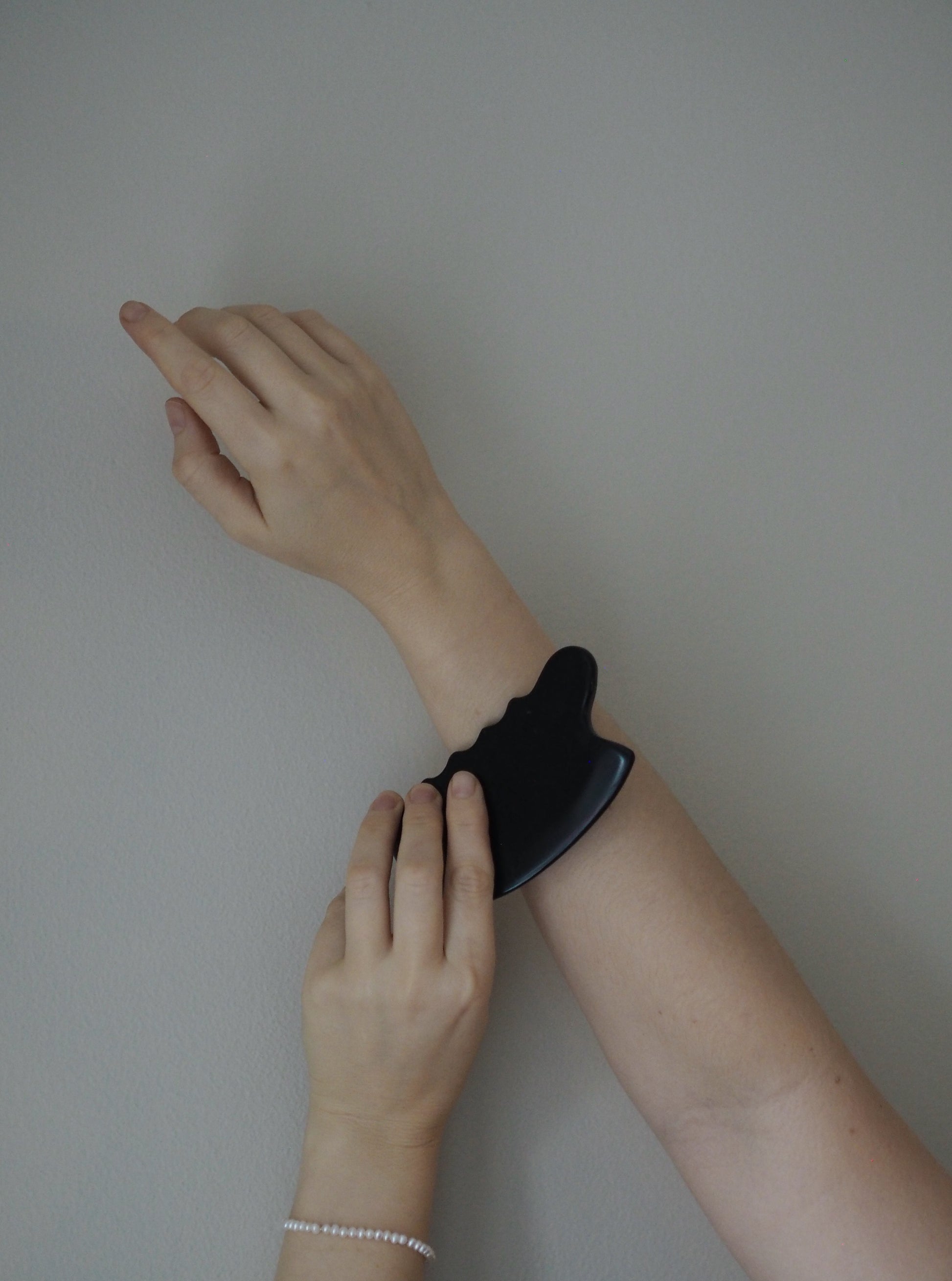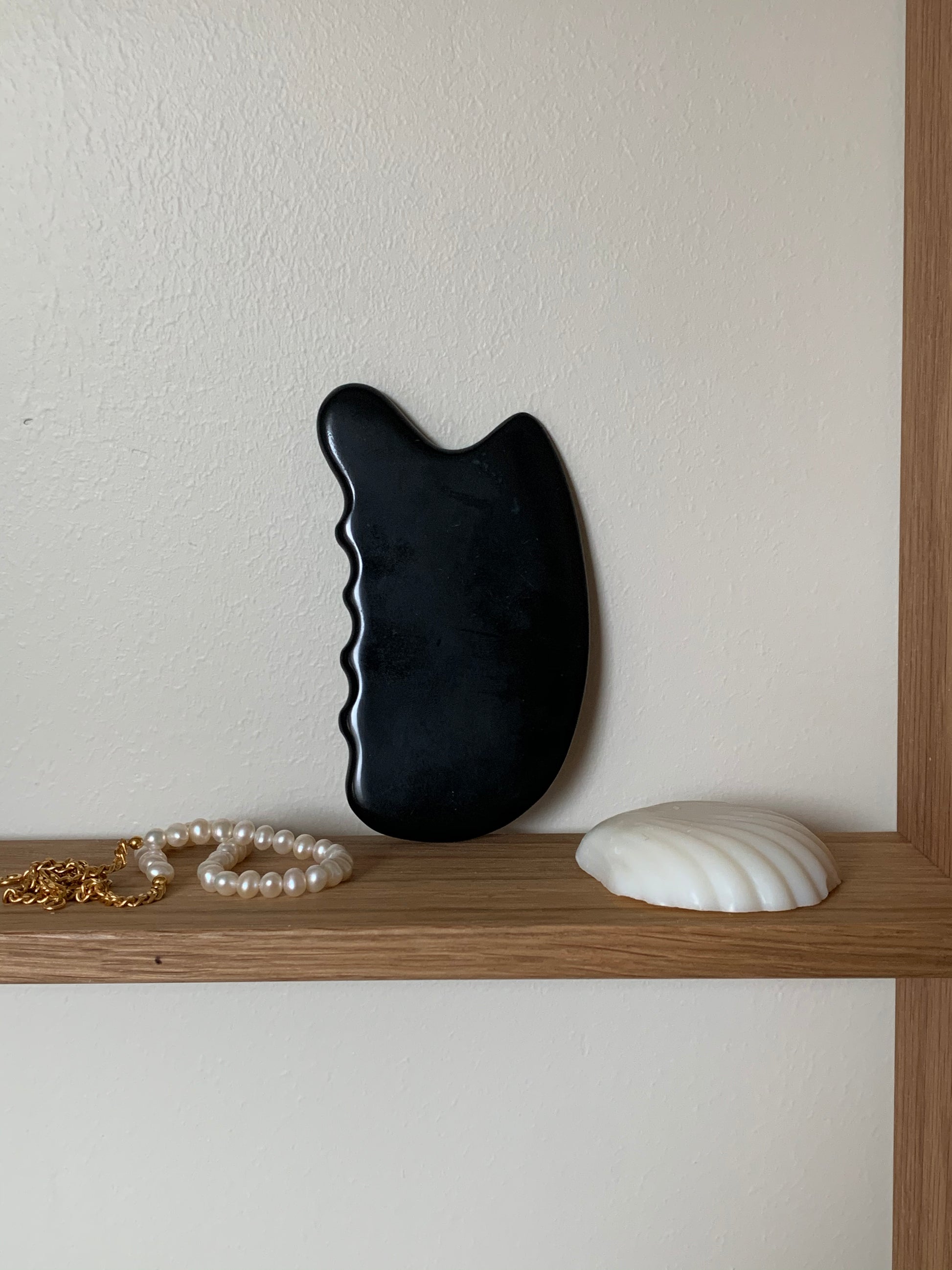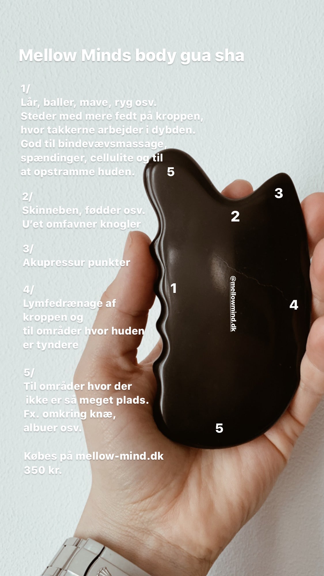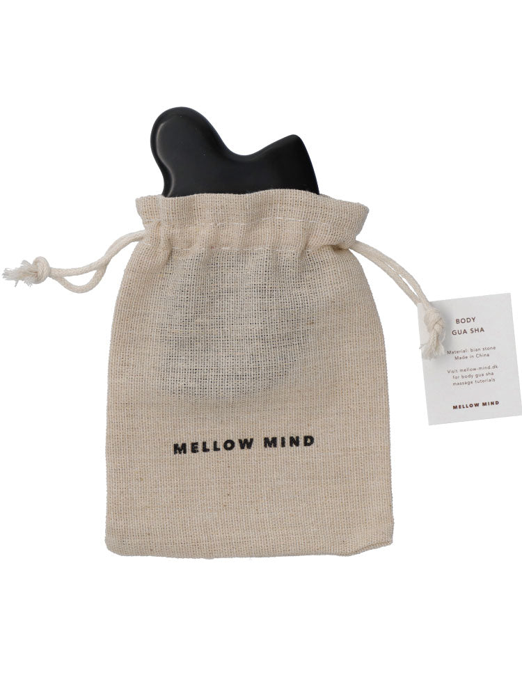 The gua sha is an ancient Chinese tool traditionally made of the bian stone, and used to stimulate the lymph glands and increase blood flow. Mellow Mind's body gua sha helps tighten the skin, works with the connective tissue, and loosens muscle tension.