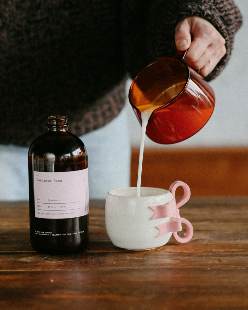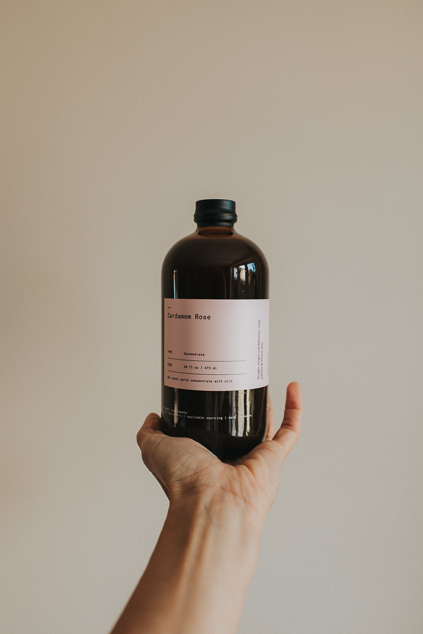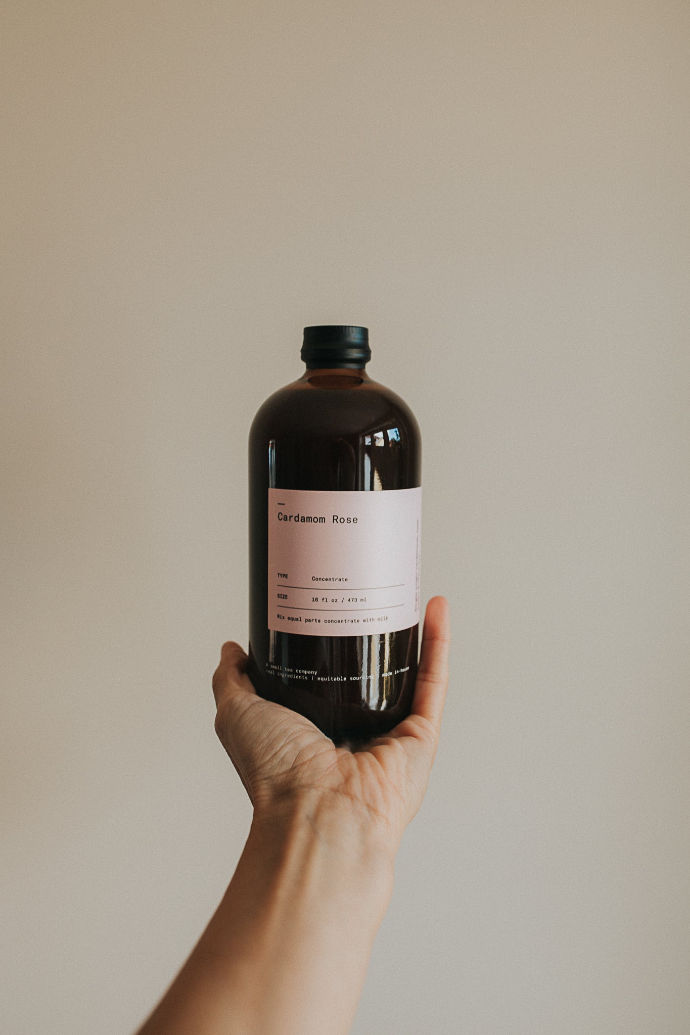 brew: by mixing equal parts concentrate and your favorite (plant-based) milk. Heat, steam or pour over ice and consider sprinkling with the cardamom rose dust.