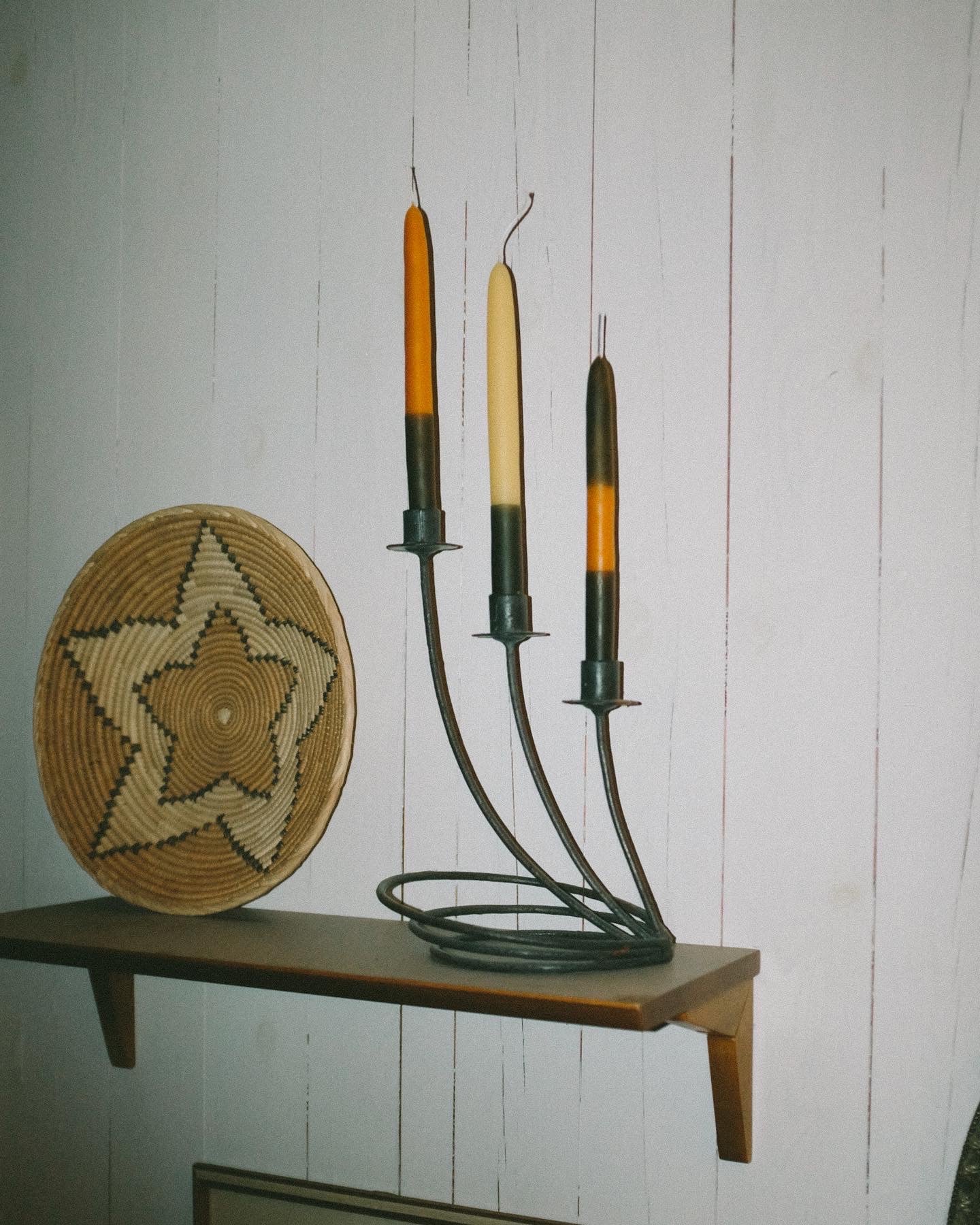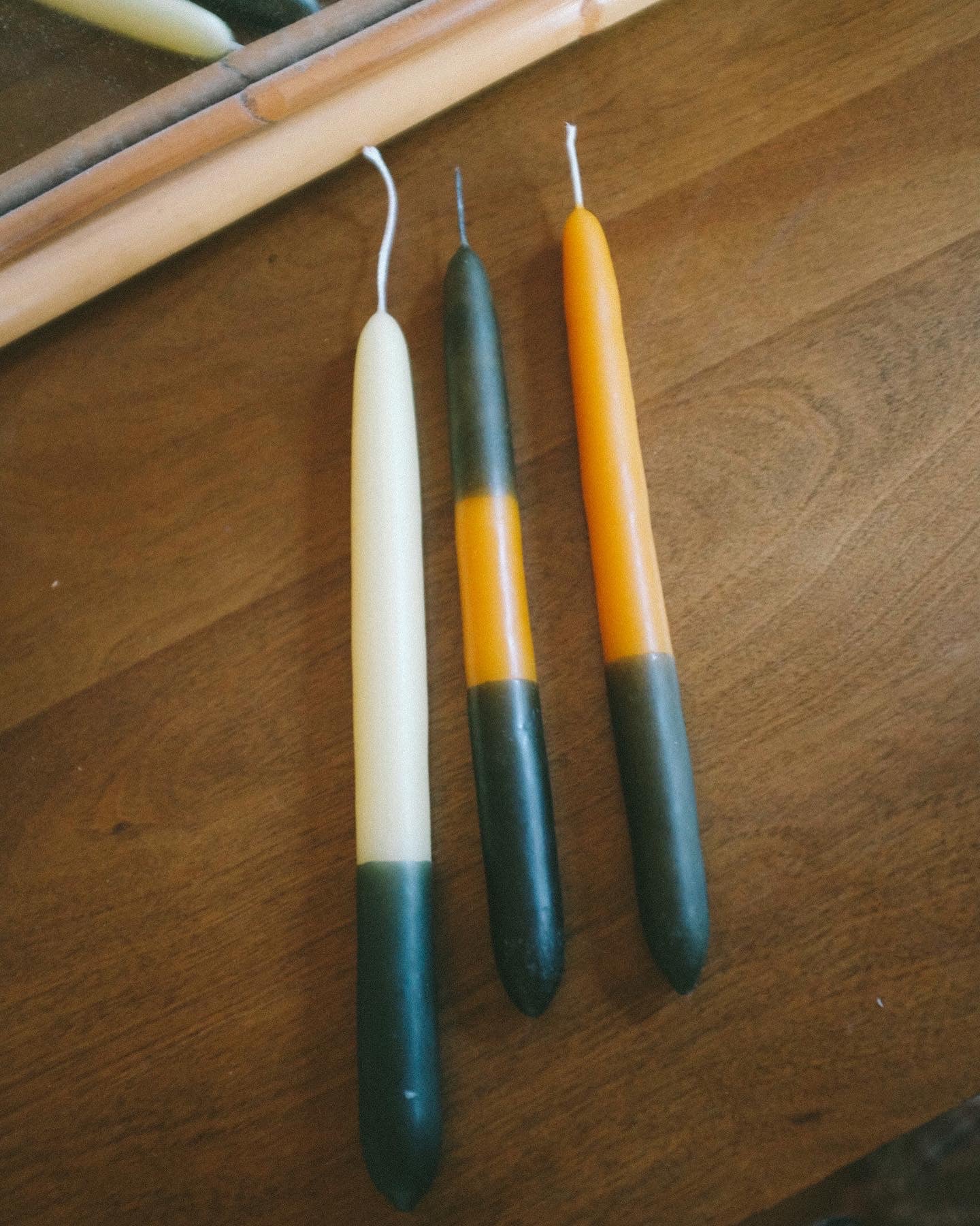 These candles are made using the traditional hand dipping method which has been applied as a form of candle making for thousands of years. The are different to the piano tapered ones because of the darker beeswax used. They are over-dipped with indigo (plant) infused wax at one or both ends. Each candle measures approximately 2.5-3 cm wide and is 25 cm tall, and burns for about 6-8 hours. Trim the wick (to about 1 cm) if you would like the candle to burn slowly. Do not leave the burning candle in a drafty spot where it can burn unevenly and can be a hazard. Collect any leftover wax and reuse it to make playful candles or in other home-crafts.