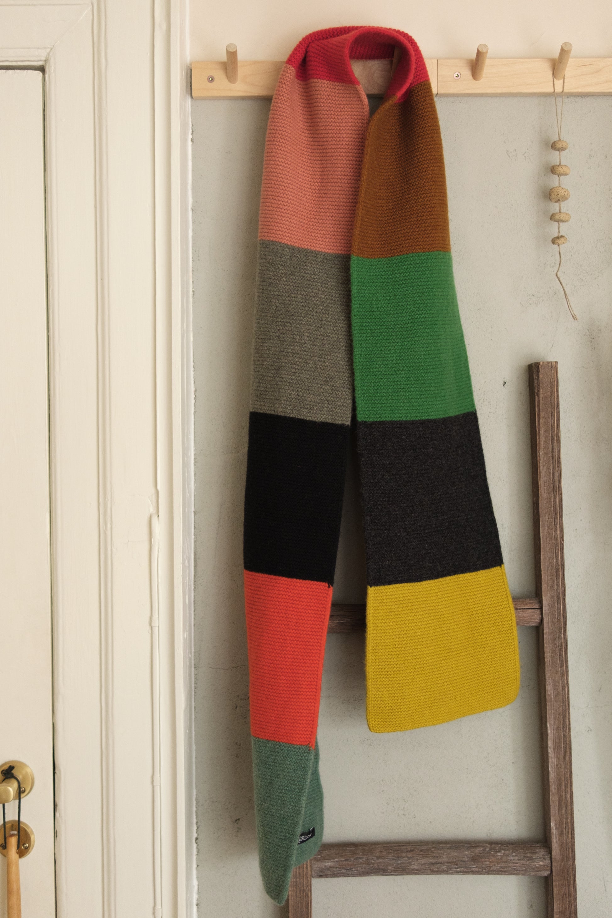 This colorblock garter stitch scarf in 10 blocks of color is made from the softest lambswool and measures 184 x 19 cm. This scarf is made in southwest Scotland using traditional techniques and hand finishing. This knitting mill was established over 100 years ago and are famous for producing the original Scottish ‘Tammy’ - a type of beret.