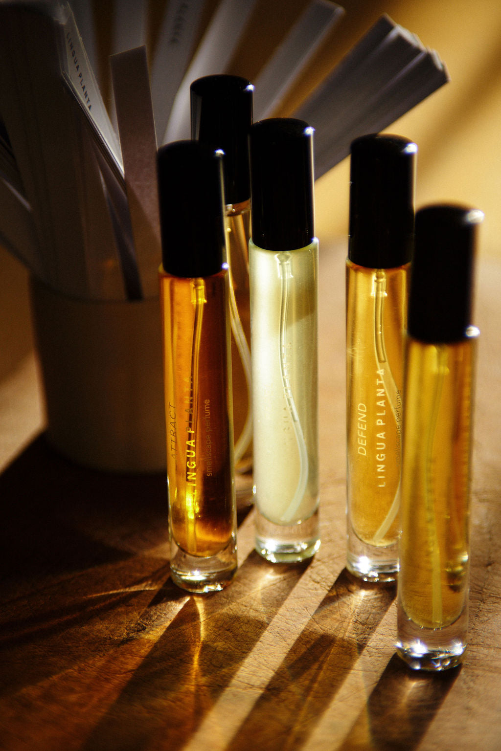 Lingua Planta is the language of scent, through and through. Its founder, Merle Bergers, experienced the the inter-connectedness of plants and trees, insects and bigger animals firsthand by growing up in a small forest in the east of the Netherlands. During her studies at the Design Academy Eindhoven she grew more and more fascinated by the possible reality of plant communication. Nourished through books by the likes of forester ecologist Peter Wohlleben and writer/biologist Robin Wall Kimmerer she went on a journey to dig deep into the matter of plants fragrant messages. Inspired by the volatiles plants use to communicate, Lingua Planta has its roots deep down in scientific research but found an aesthetic translation in perfumes. Lingua Planta is based in de Bilt, Utrecht, the Netherlands.