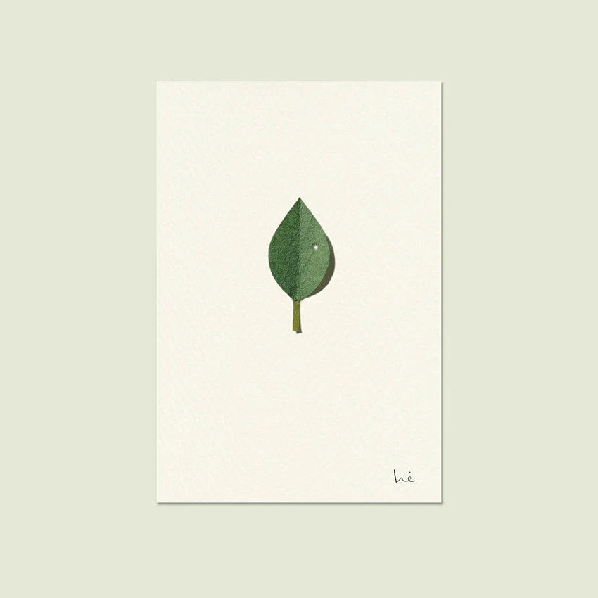 This postcard contains pigment ink prints of paper cut illustrations of a green leaf, an expression of "natsu" (summer), an embodiment of nature.