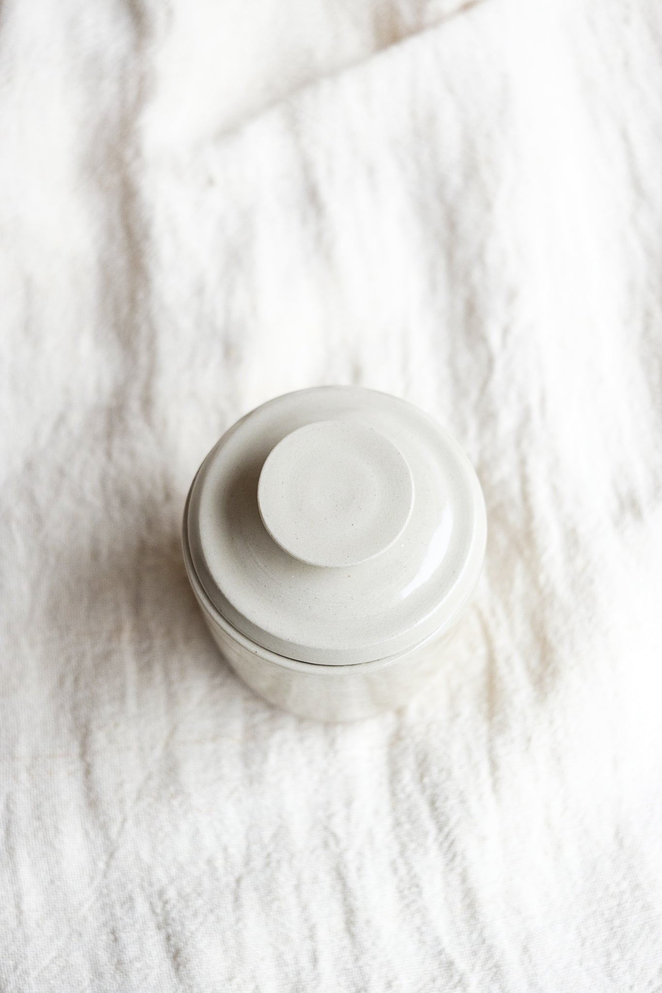 There is definitely wabi-sabi in this French butter dish. It follows traditional clean lines, yet surprises with its intentionally uneven circle of the inside bell. The French butter dish, or butter crock, is special in the way it maintains the freshness and spreadable consistency of the butter by sealing it with a layer of water. Fill the lid with butter. Pour a little fresh water into the base. Place the cup containing the butter into the base, and voilà! the water creates a seal to keep the air away from the butter so that refrigeration is not needed. Make sure to refresh the water regularly and the butter will hold well on the kitchen counter for about a month.