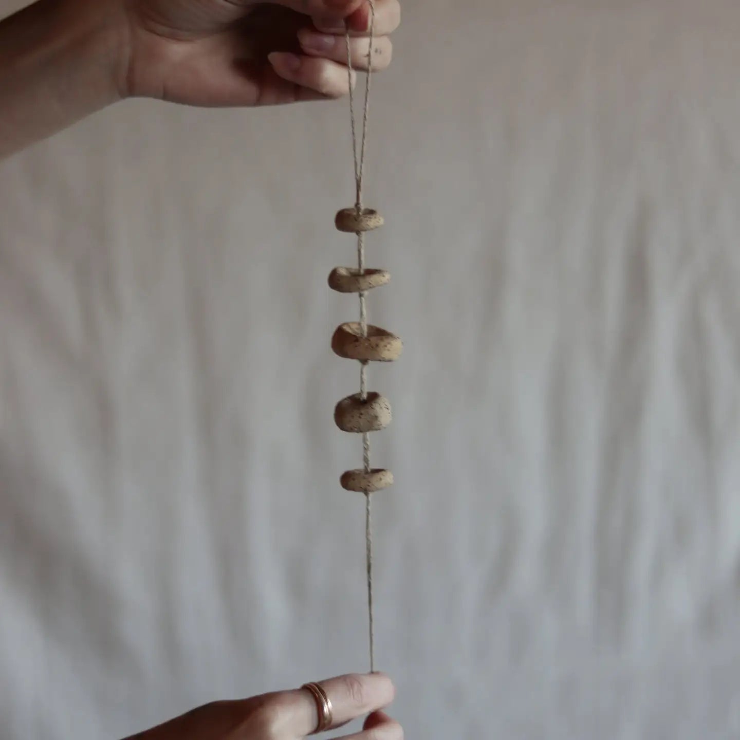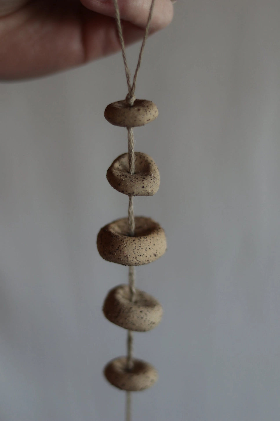 This gathered earth ceramic wall hanging, is made from the same clay Dina and Conrad use for their pottery. Some gathered earth materials have been mixed into the clay. It hangs on 100% linen cord, one of the oldest fibres known to ever be used by mankind, bringing you back to a time when the art of creation was a slow and ritualistic process. Total length is 12 inch / 30.5 cm from the top of the string to the bottom. Hang it from the ceiling, hang it on the wall or by the curtain rod by your favorite window. It brings magic to a home, this ceramic piece.