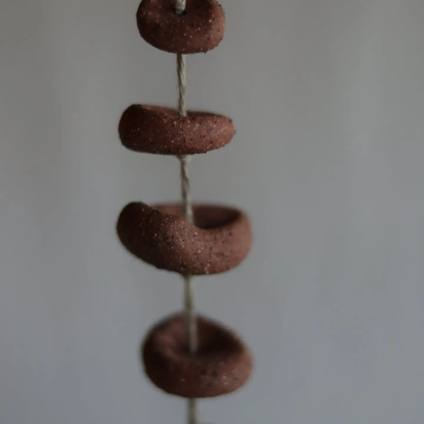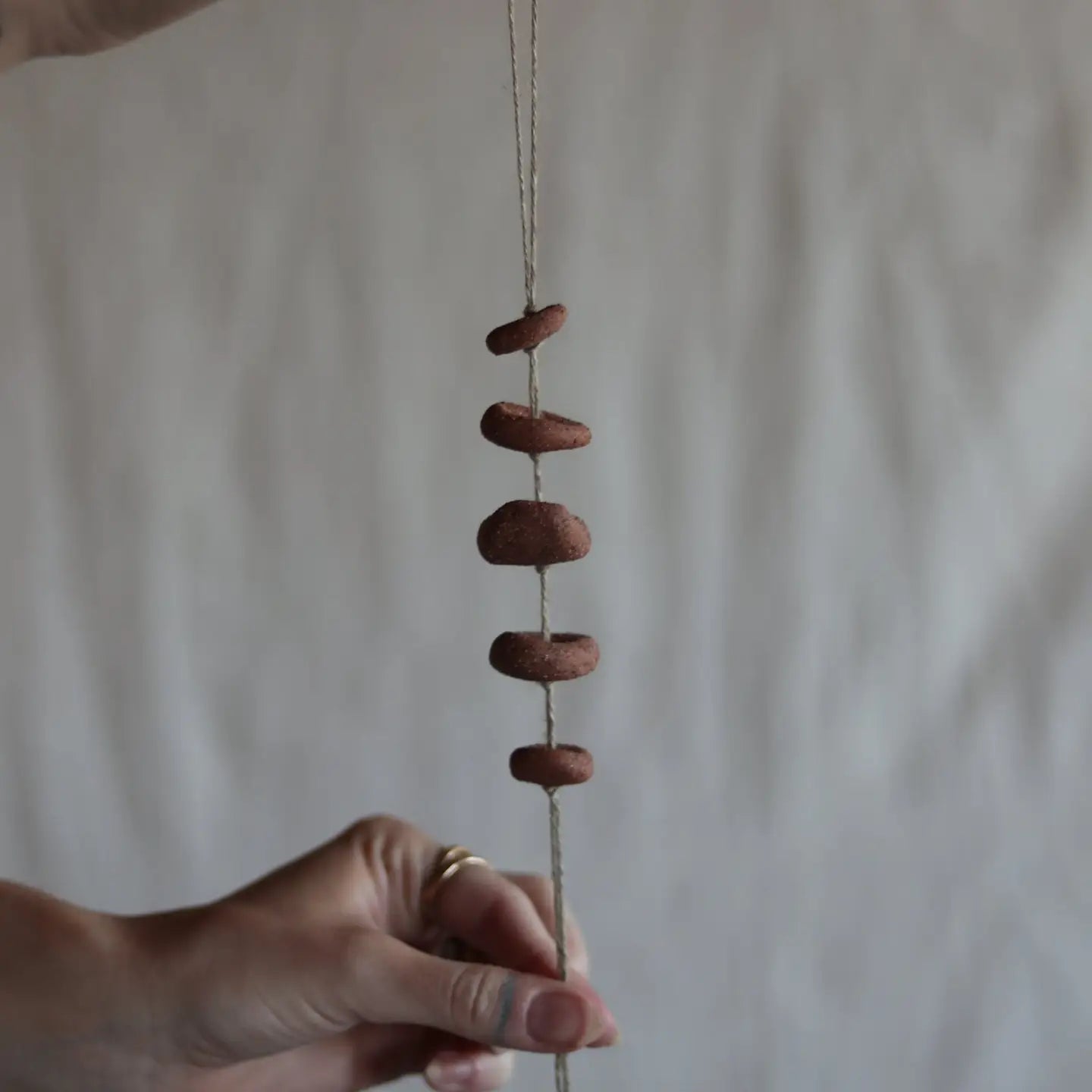 This gathered red earth ceramic wall hanging, is made from the same clay Dina and Conrad use for their pottery. Some gathered earth materials have been mixed into the clay. It hangs on 100% linen cord, one of the oldest fibres known to ever be used by mankind, bringing you back to a time when the art of creation was a slow and ritualistic process. Total length is 12 inch / 30.5 cm from the top of the string to the bottom. Hang it from the ceiling, hang it on the wall or by the curtain rod by your favorite window. It brings magic to a home, this ceramic piece.