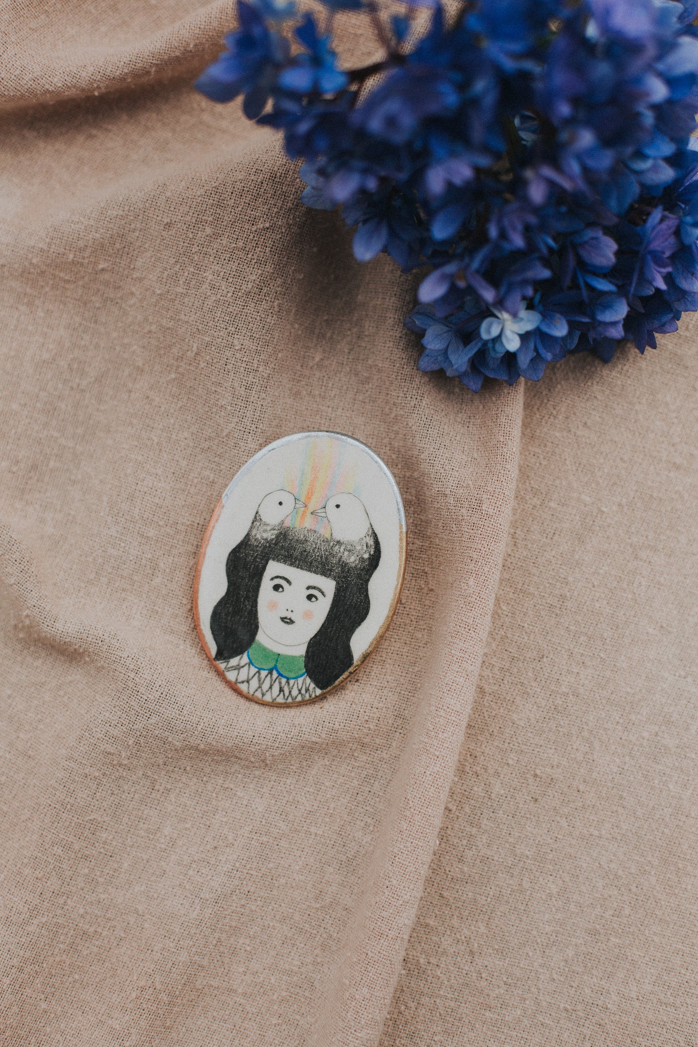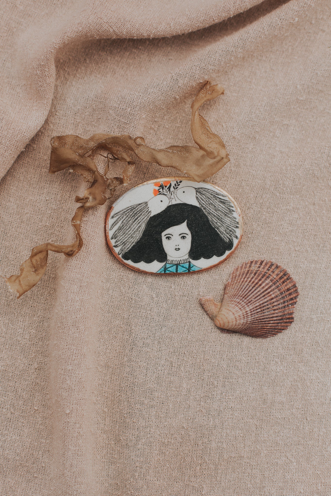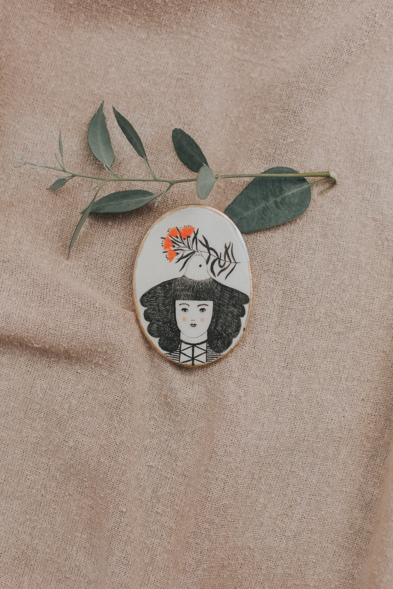 Orka is a ceramic artist from Romania who makes sculptures, art pieces and jewellery. She paints, draws, and uses pressed flowers on her handmade ceramic statement brooches. She developed an own clay formula to have a strong, resistant ceramic-like surface on which to draw. Her fascination with Surrealism, is hinted at in her work through a variety of mediums and techniques.
