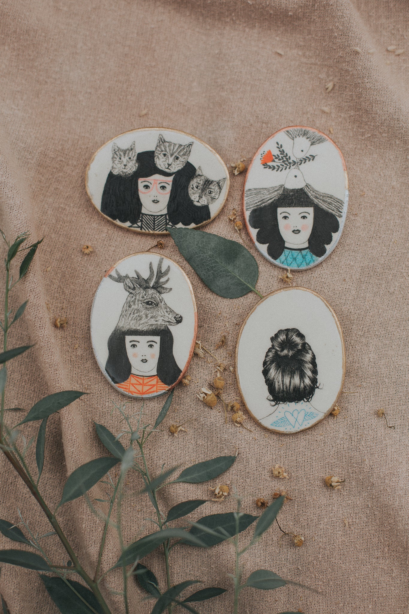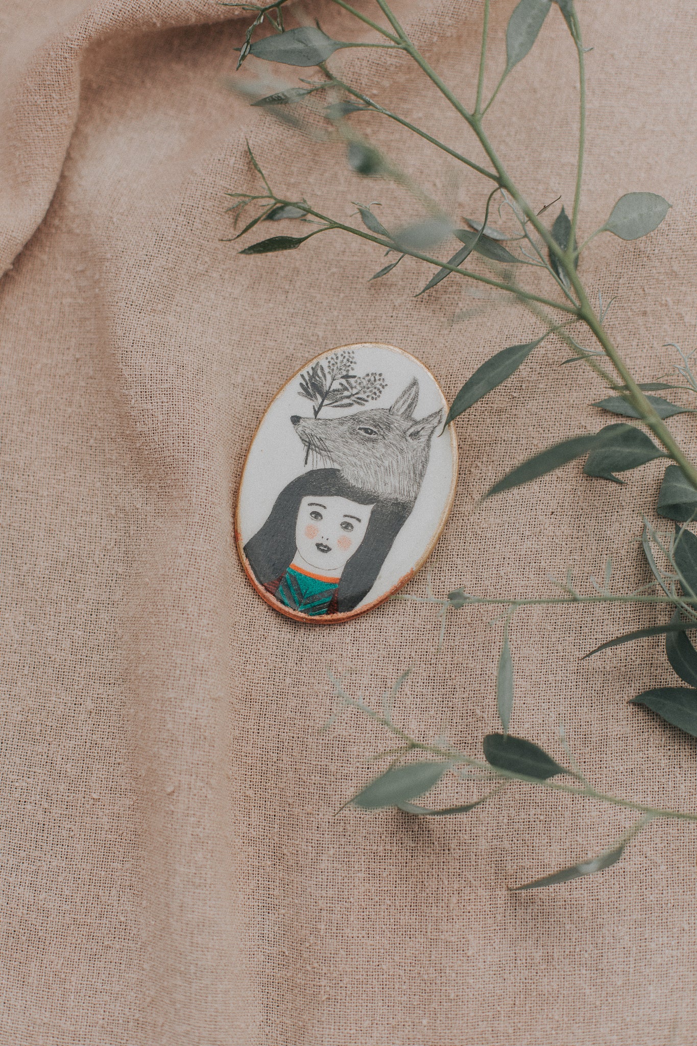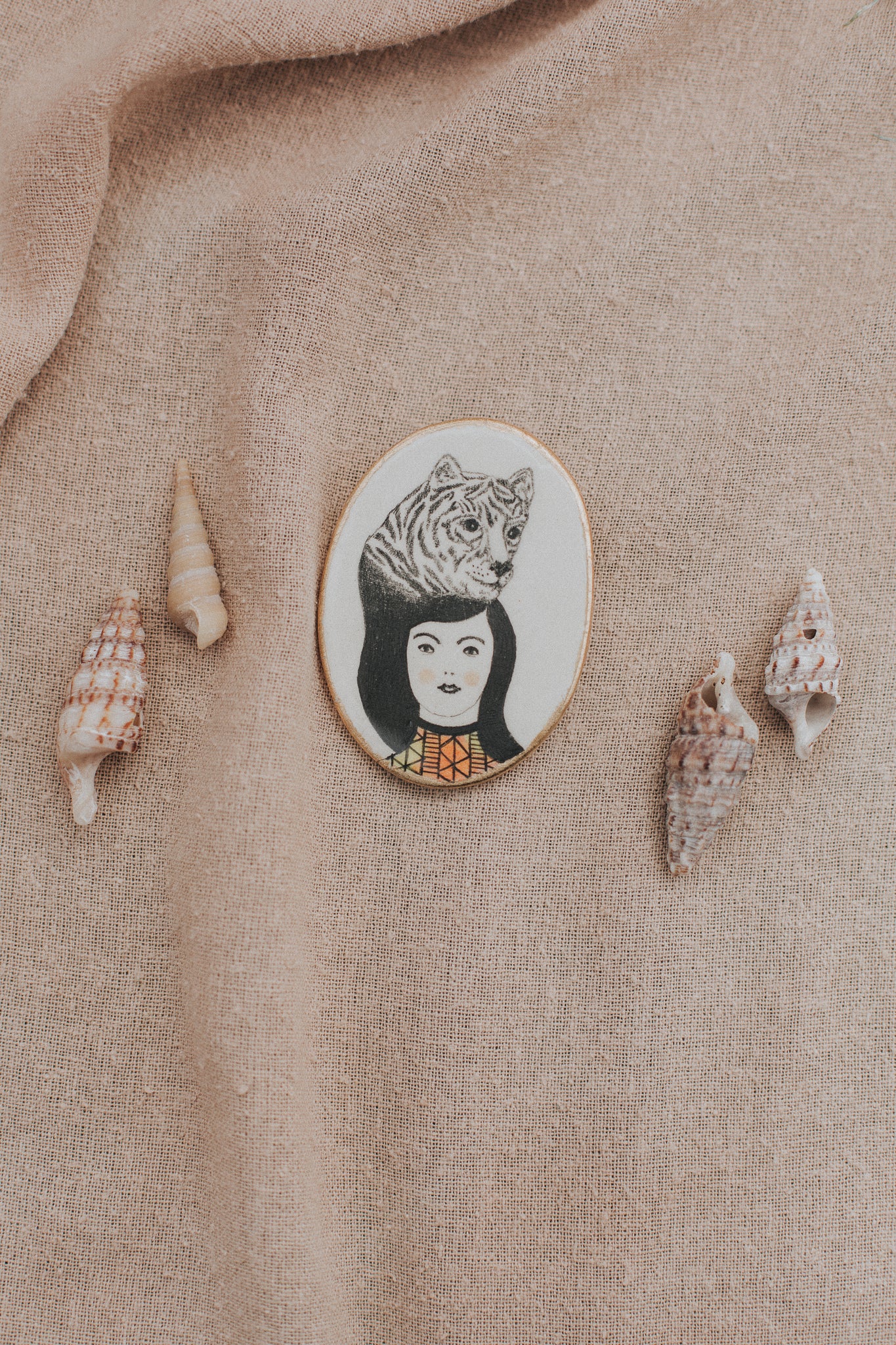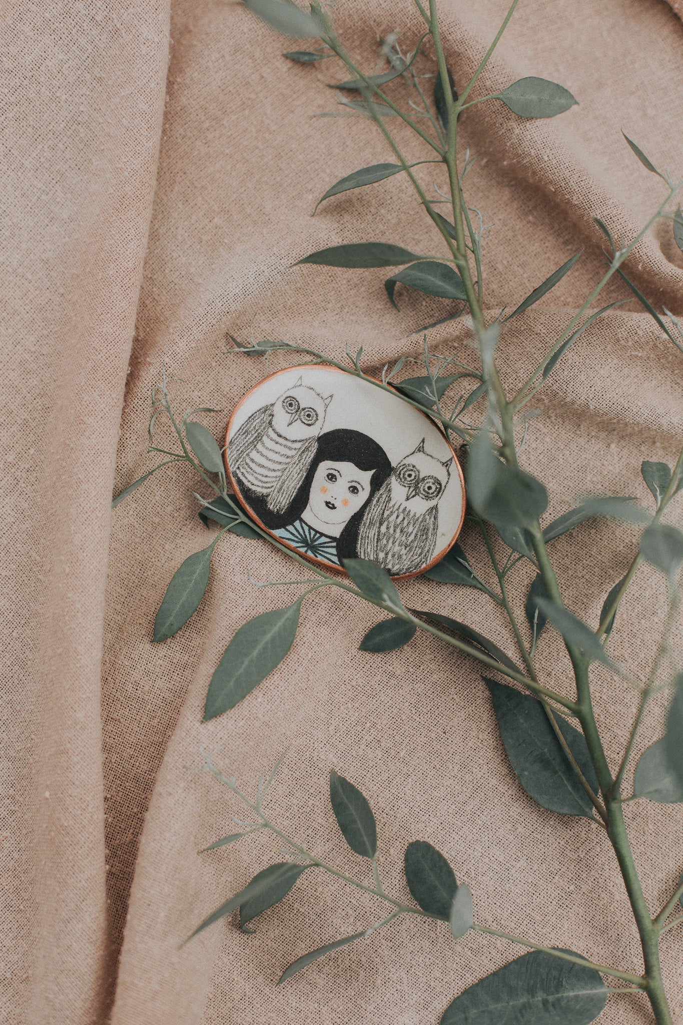 Orka is a ceramic artist from Romania who makes sculptures, art pieces and jewellery. She paints, draws, and uses pressed flowers on her handmade ceramic statement brooches. She developed an own clay formula to have a strong, resistant ceramic-like surface on which to draw. Her fascination with Surrealism, is hinted at in her work through a variety of mediums and techniques.