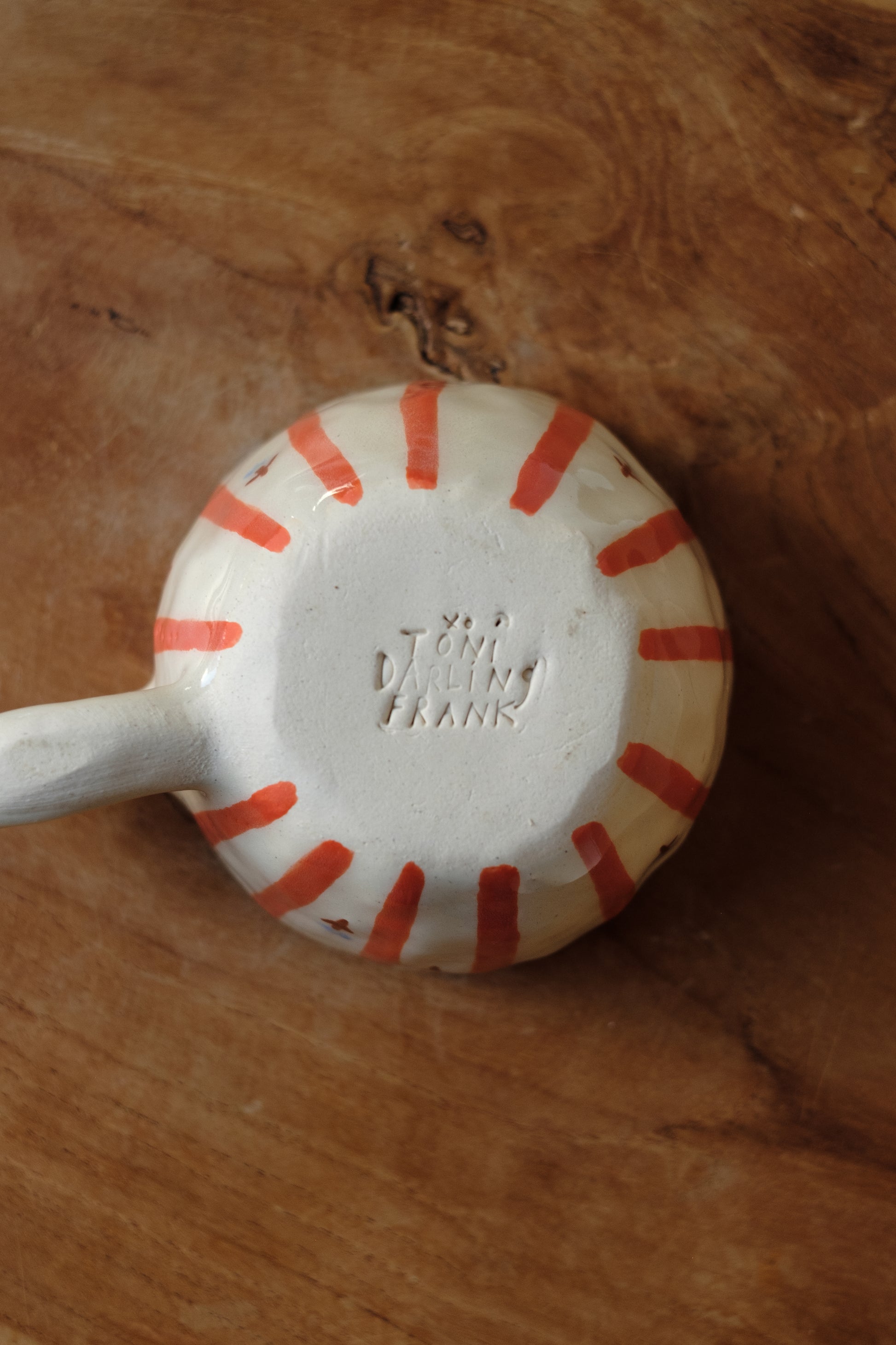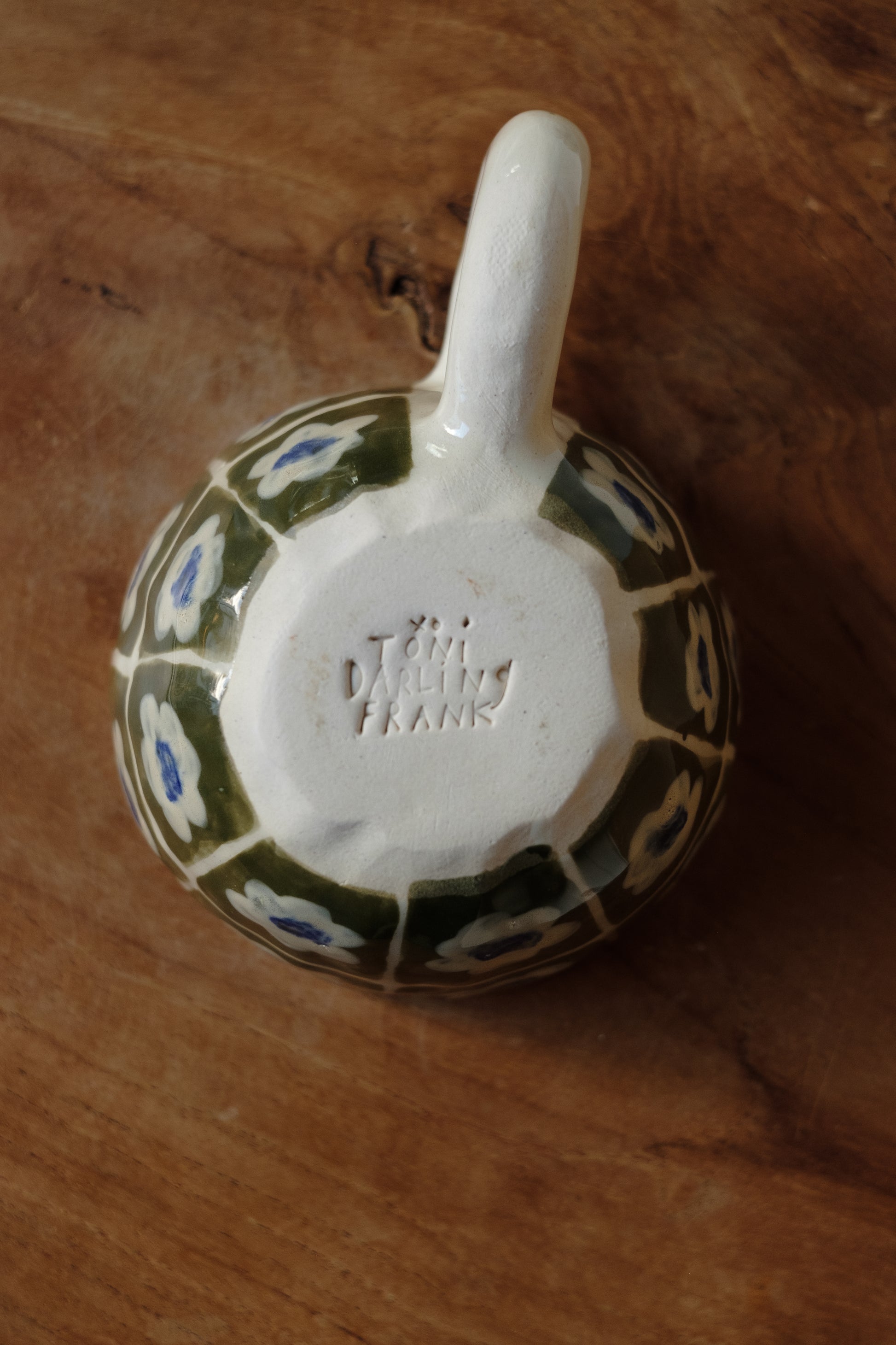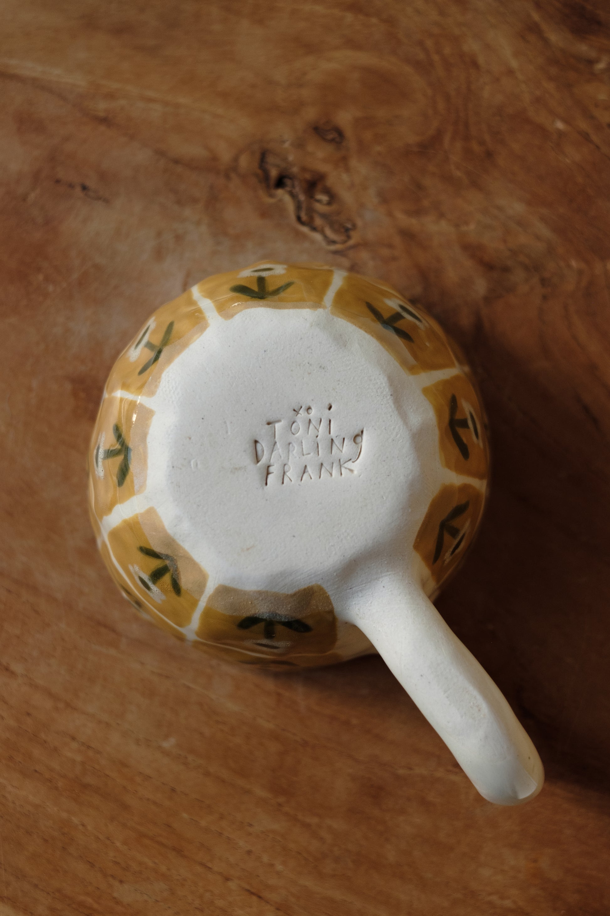 Toni Darling Frank is a Toronto-based artist who has long caught our eye. Her work primarily involves working with and drawing on clay. Her background in textile and pattern design is reflected in her bold, vibrant color combinations and intricate, quilt-like patterns. Toni designs unique pieces that are both playful and usable, an unmistakable example of functional art.