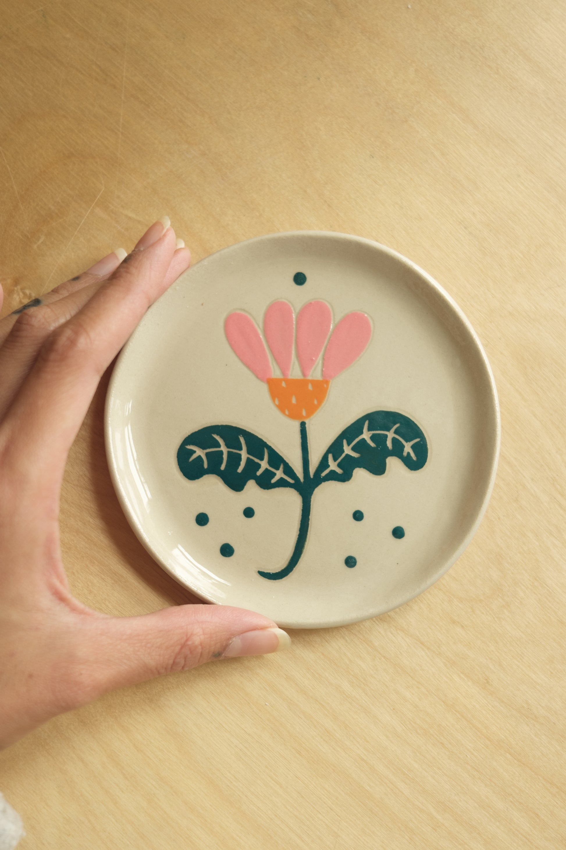 This mini plate depicts a blooming flower, which to me, looked a lot like an inverted pink echinacea flower. Could it be that I am seeing these flowers now since I am going through a phase where I am highly obsessed with their fascinating, almost disproportionate appearance? Maybe. In any case, I really loved Alexandra's depiction of this bloom as soon as I saw it. This plate is handmade and hand-drawn and so dimensions and colors may vary slightly from what they look like on screen. Allow your imagination to decide what you may use them for. Isn't it wonderful to be able to dream? Here are a few ideas: jewelry, nuts, beads, seeds, salt, spices, pieces of candied ginger, your tea bag, spoon rest, a cookie, a cup of hot drink.