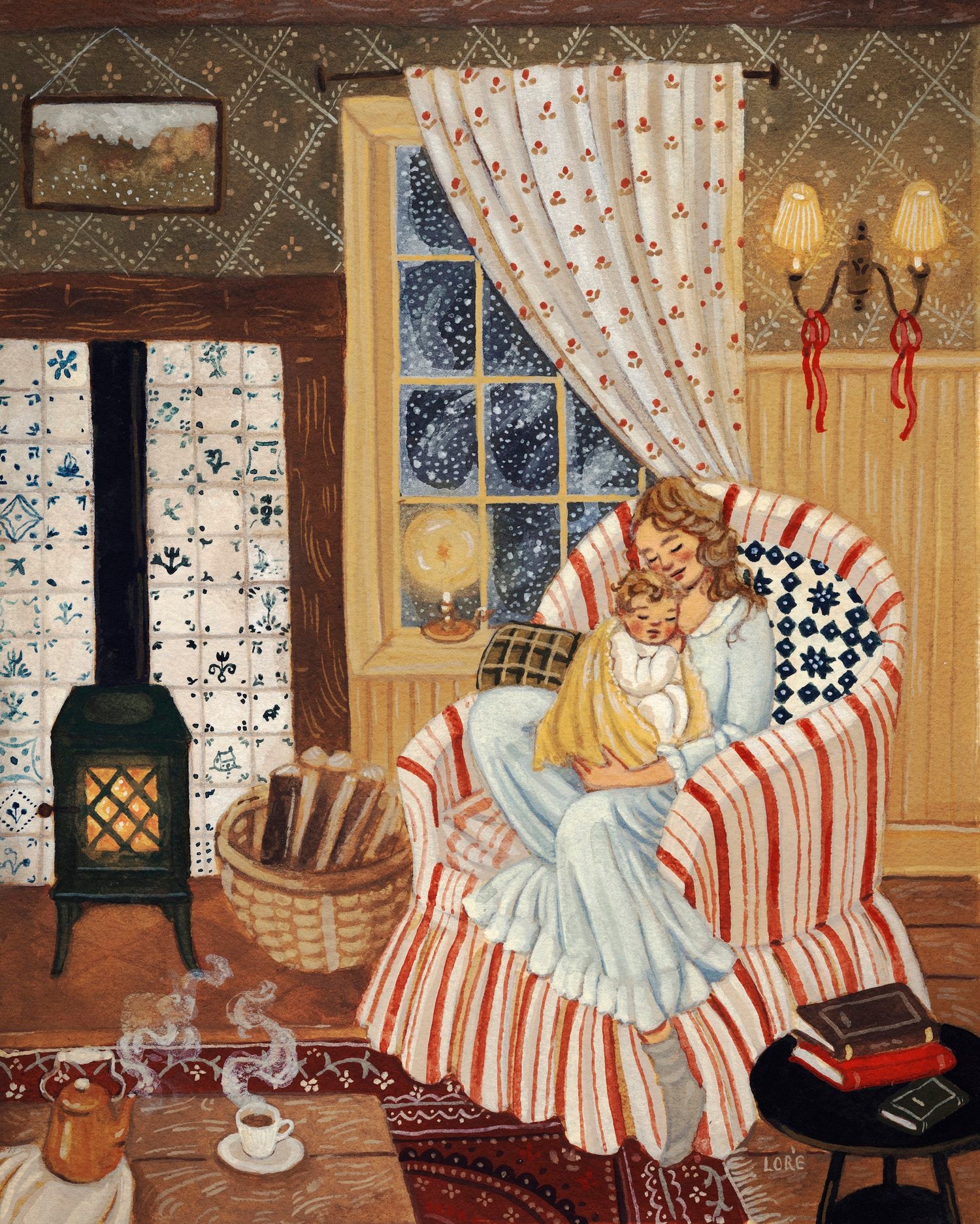 The Held print is a 25x20cm reproduction of the original gouache painting, printed with archival inks on cold-pressed watercolor paper to create a museum-quality print, resistant to fading and yellowing. Winter is unfolding outside, snowflakes dancing in the window. It is an early morning or a late night... what parent can really tell? There is hot tea on the table and a fire in the hearth. This mother is cradling her baby and surely hopes to sneak in five more minutes of peaceful sleep. Just listen to the snowflakes tapping on the glass and the fire crackling.