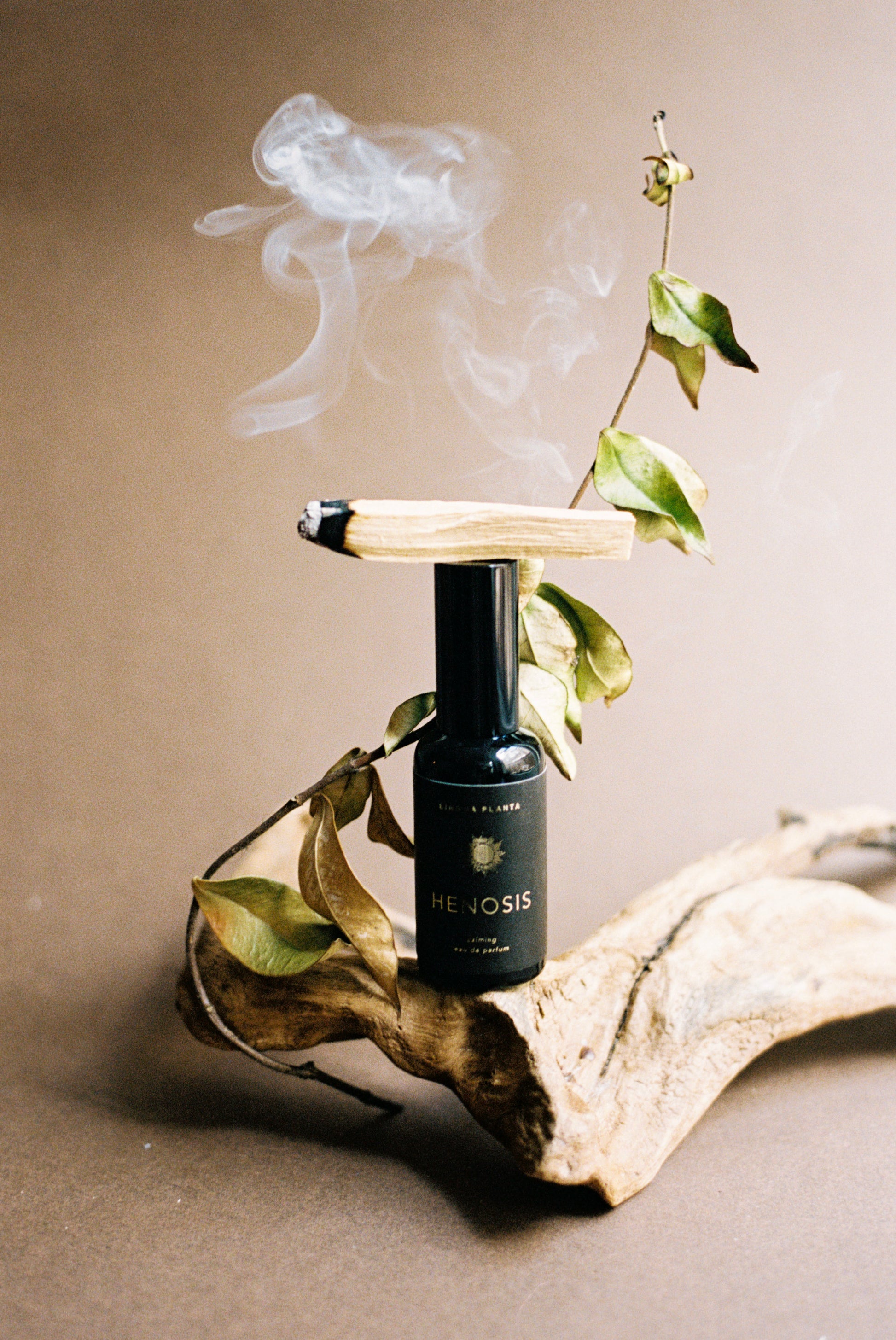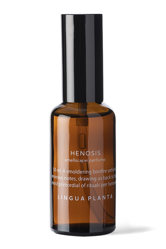 Henosis: a powerful, smoky scent where the odour of a smoldering forest fire is slowly wrapped in the soothing energy of cedarwood and frankincence.