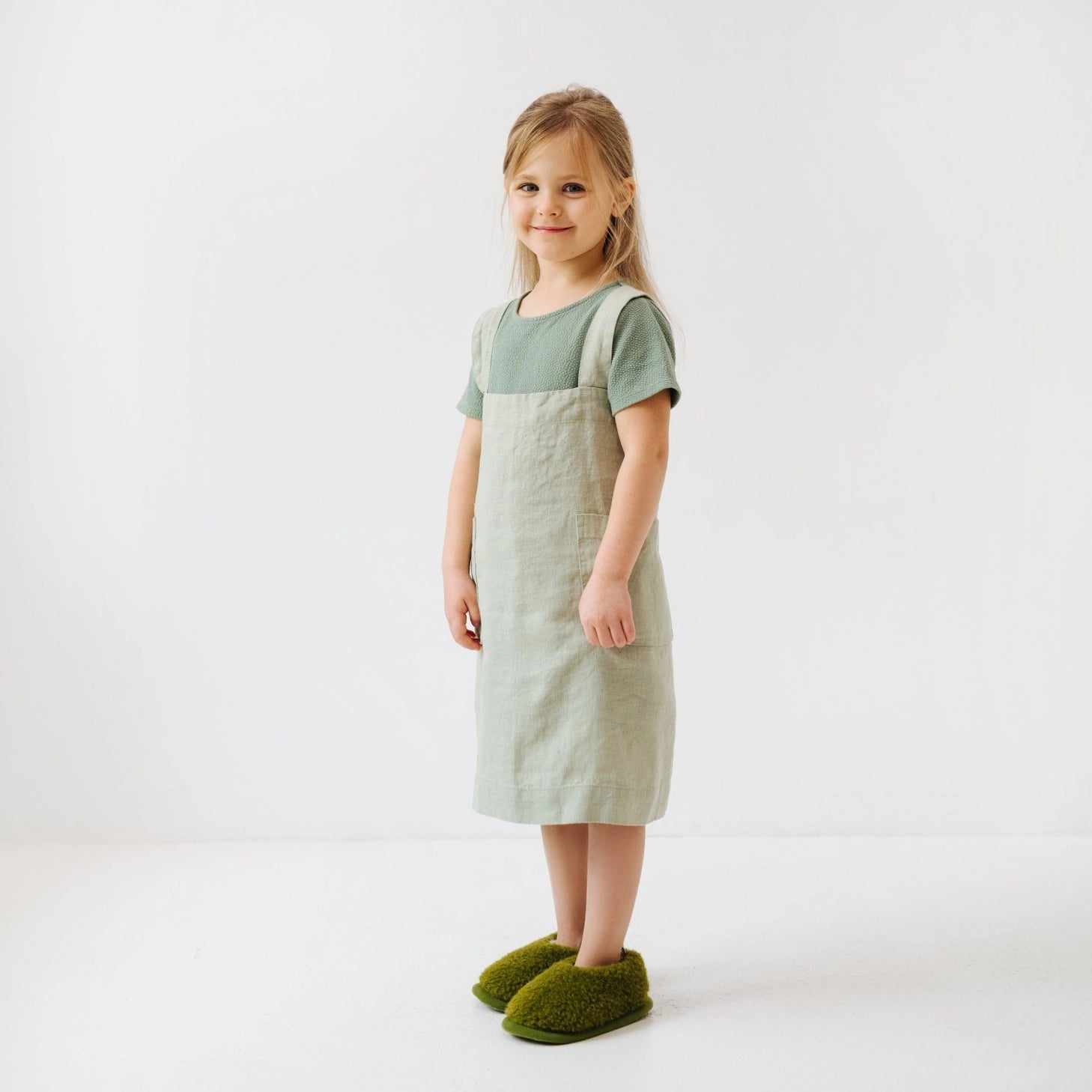 This kids linen pinafore apron is suitable for both arts and crafts, cooking as well as for helping out with chores around the house. It is stone washed for extra softness and easy to slip on and off, comfortable with no ties. Made of 100% European linen that is durable, and features two side pockets for your littles to keep treasures in.