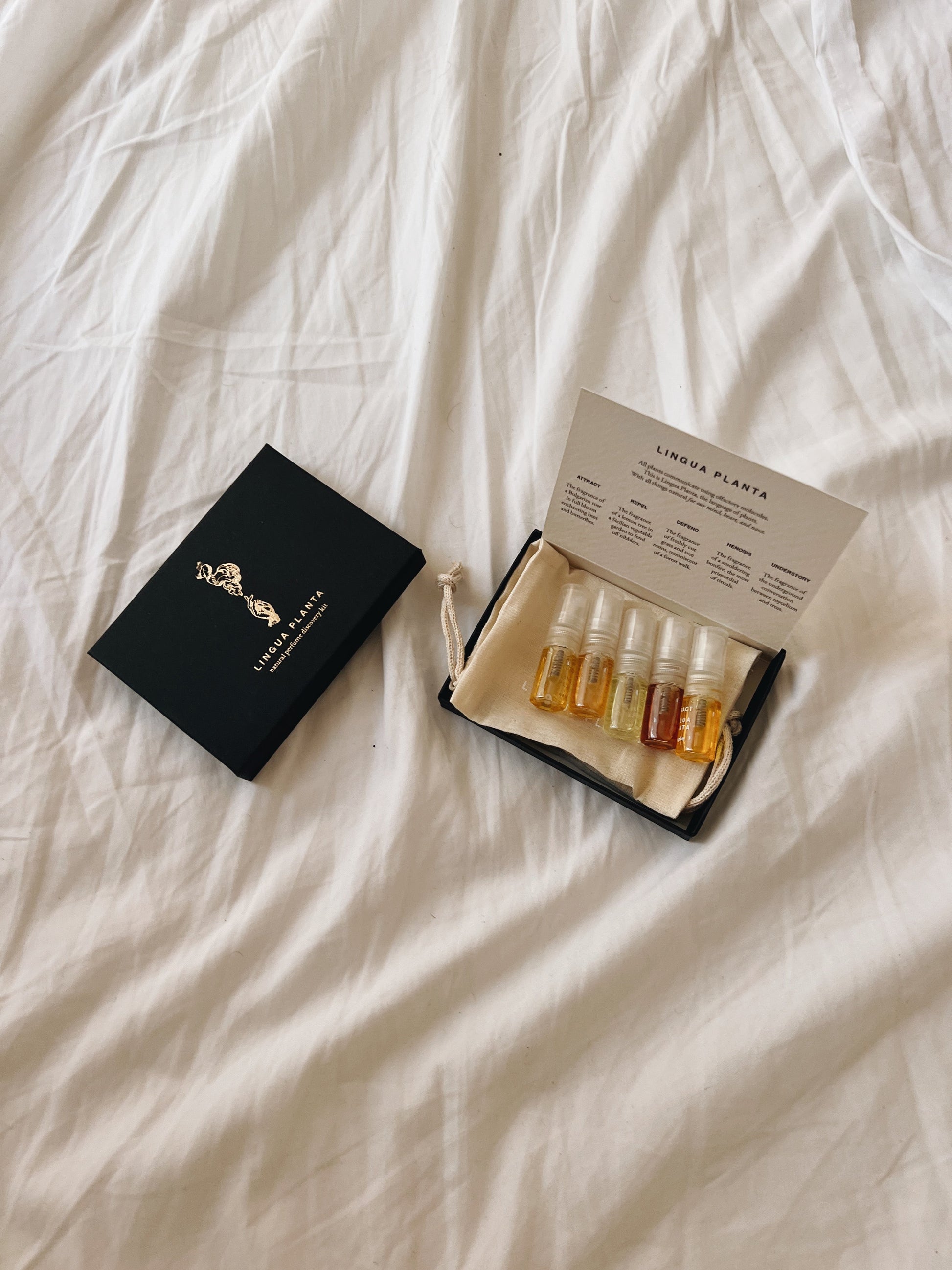 Get to know Lingua Planta's creations with this sample set of 5 x 2 ml perfume spray bottles, including: Defend, Repel, Attract, Henosis, and Understory.