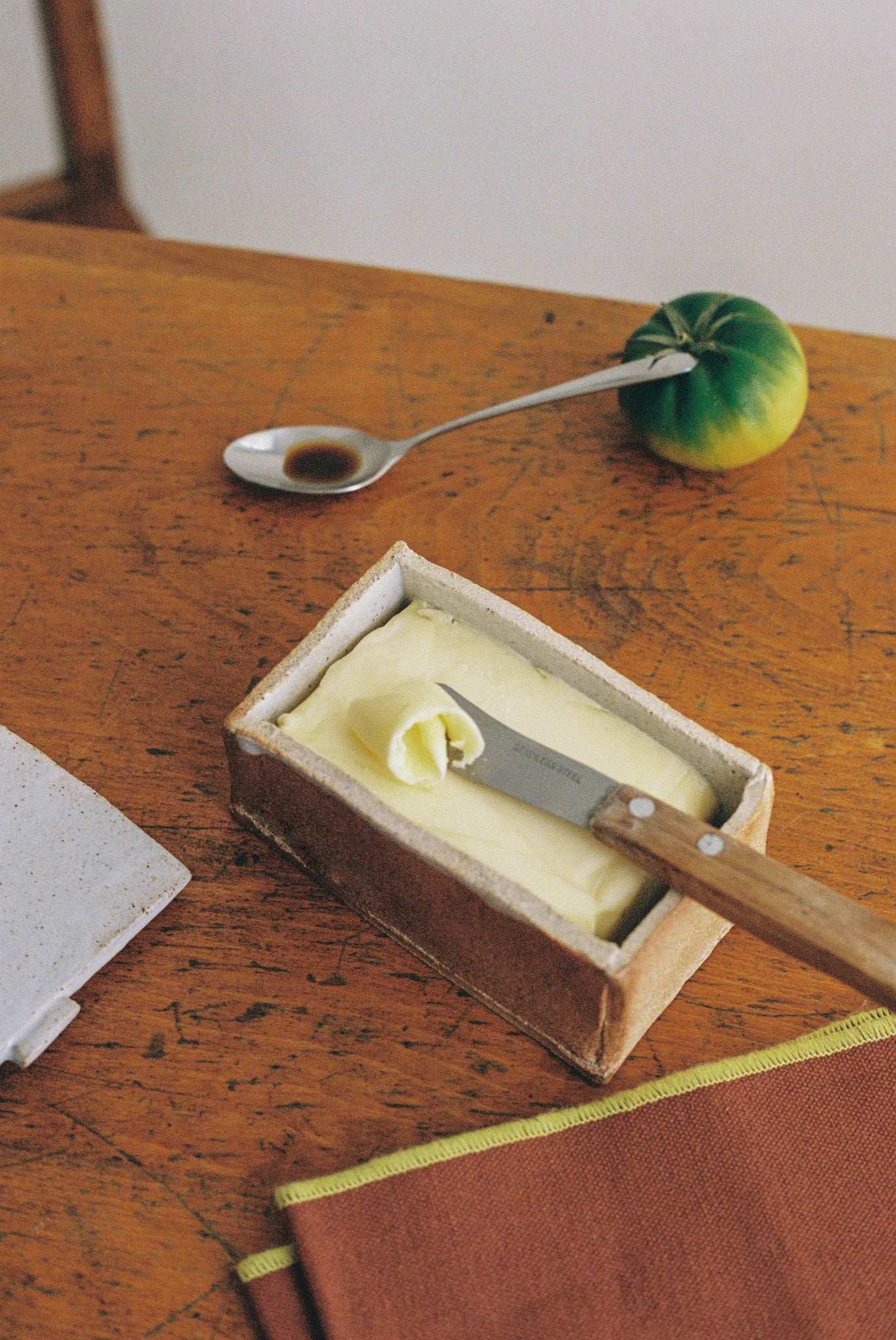 Manteca, the stoneware butter dish is like a brick, one that holds your butter brick :). Do not let it fool you. It can hold treasures, too. It is chalk glazed and unglazed –naturally marked by pine ashes while wood-firing in the backyard. Both the stoneware and the glazes that Estudio Vernís use are dishwasher friendly.