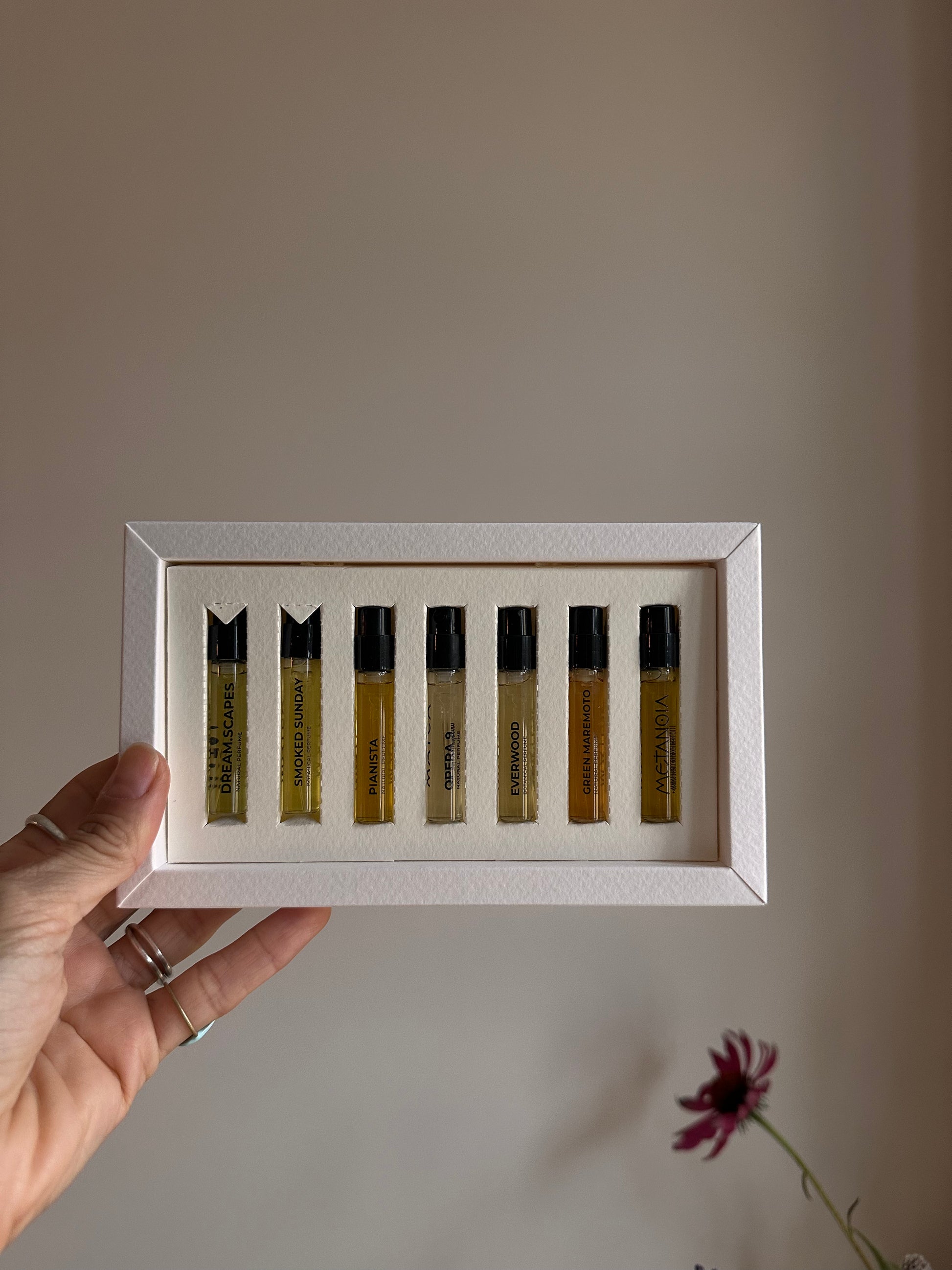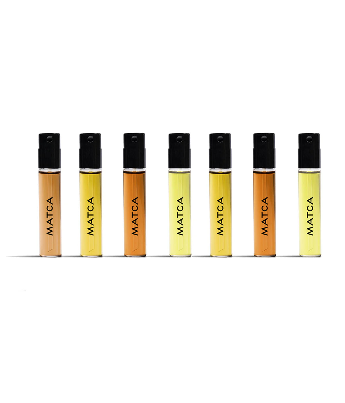 Many of you have indicated that you would like to explore MATCA's scents in the privacy of your own time. Together with Georgiana, we have created a set of 7 scents that are representative of our current in-store selection: opera 9 + pianista + green maremoto + metanoia + everwood + smoked sunday