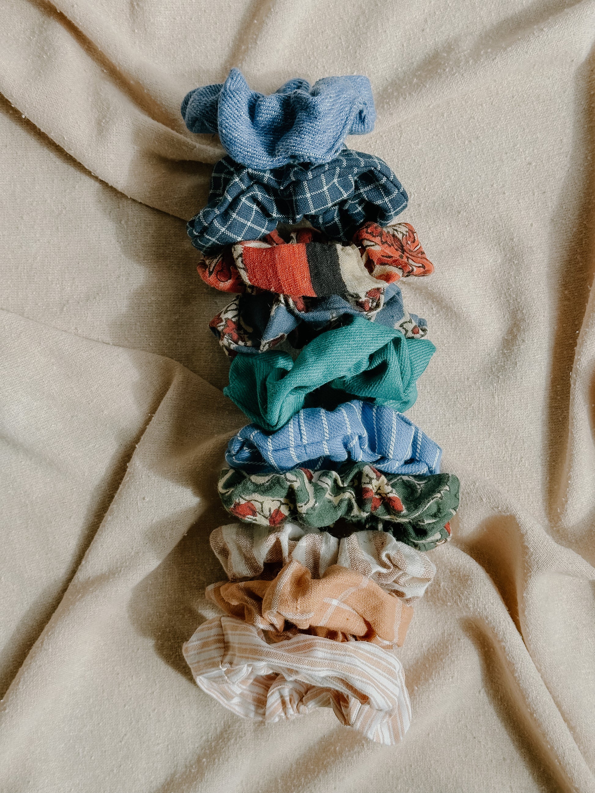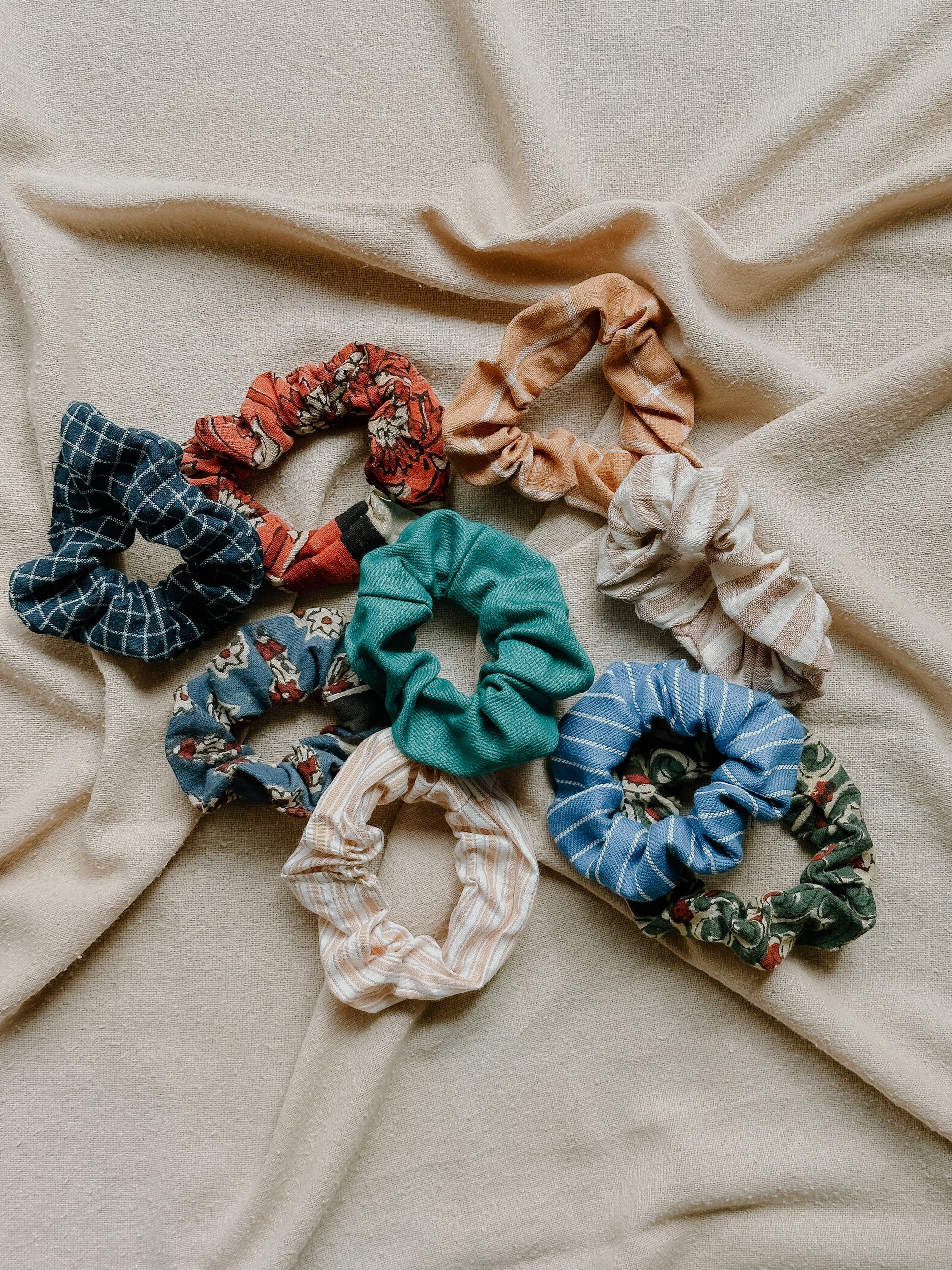 We make these scrunchies in-house to make use of leftover and waste fabrics from Grethe's design shop, K for Kinkeliane, where through shapes and textures she creates playful and modern clothing for adults and children. We all love the concept of making waste wearable and useful.