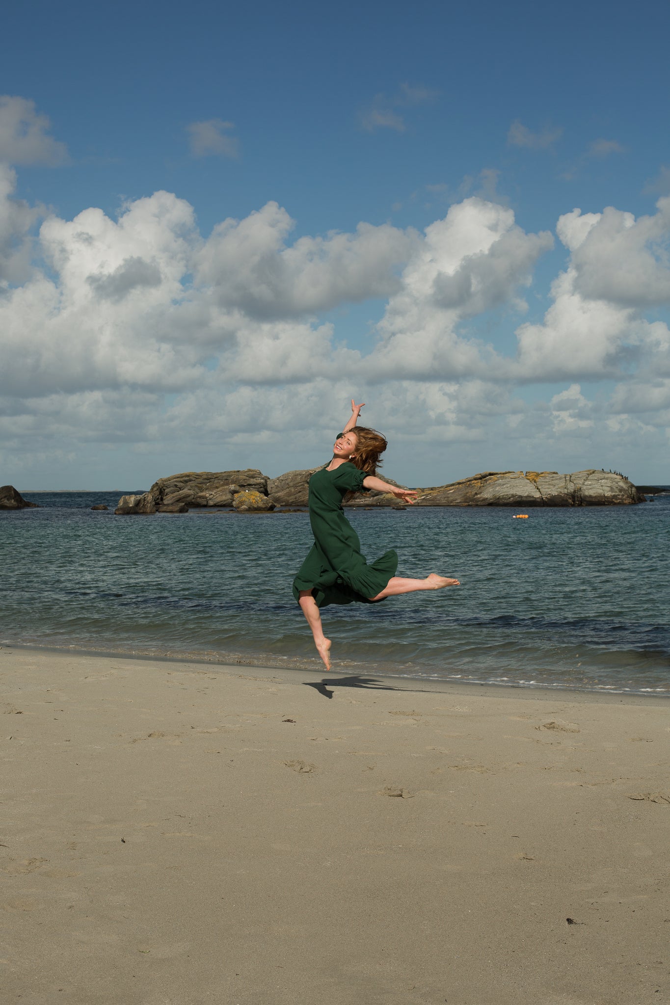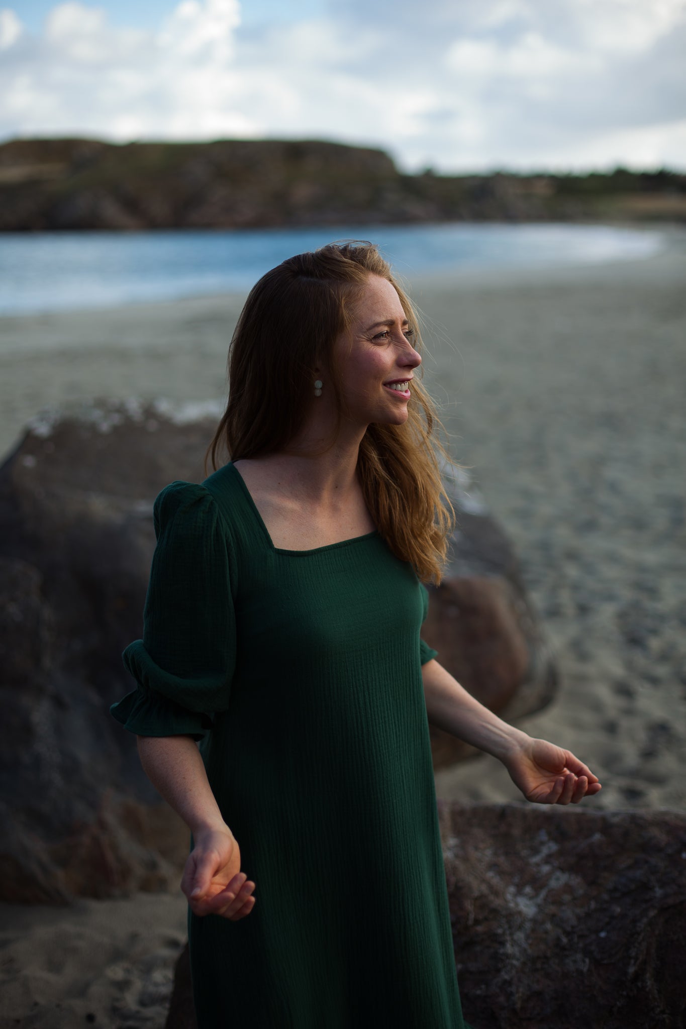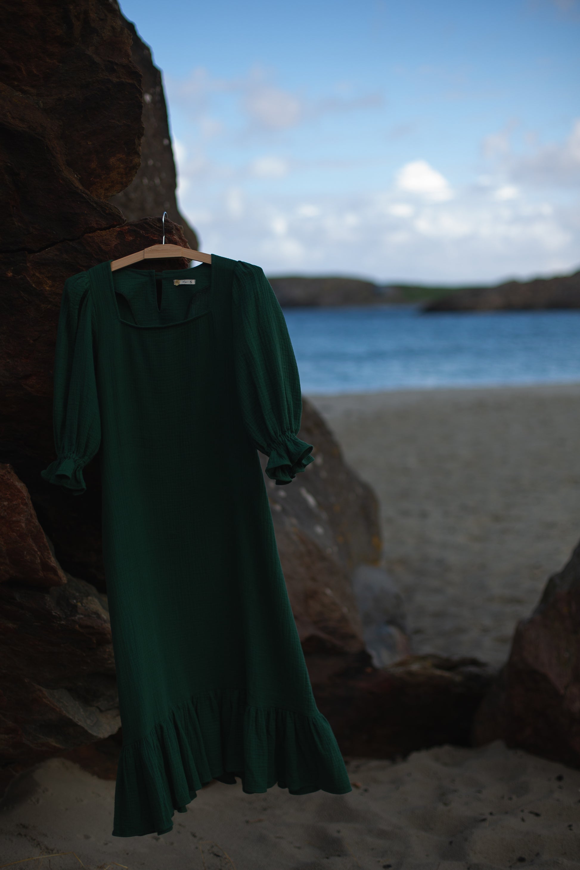 This Otilia has a ruffled skirt bottom, square neckline, and puffed three-quarter sleeves. Otilia is versatile, comfortable and it can be dressed up or down depending on your mood: you may go out for dinner in Rome or run in a field of flowers in Transylvania and it will feel just as good. It comes in linen, muslin, and hemp of various colors.