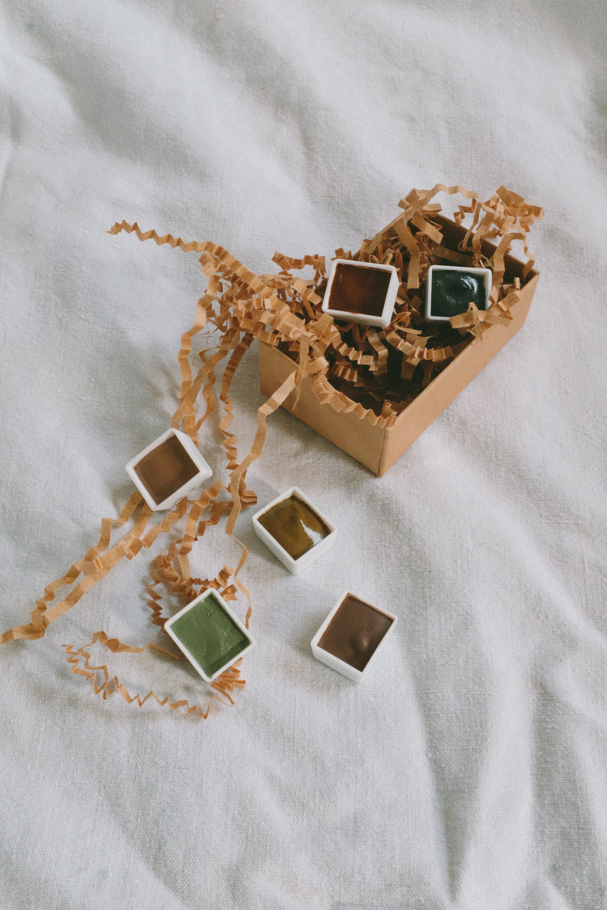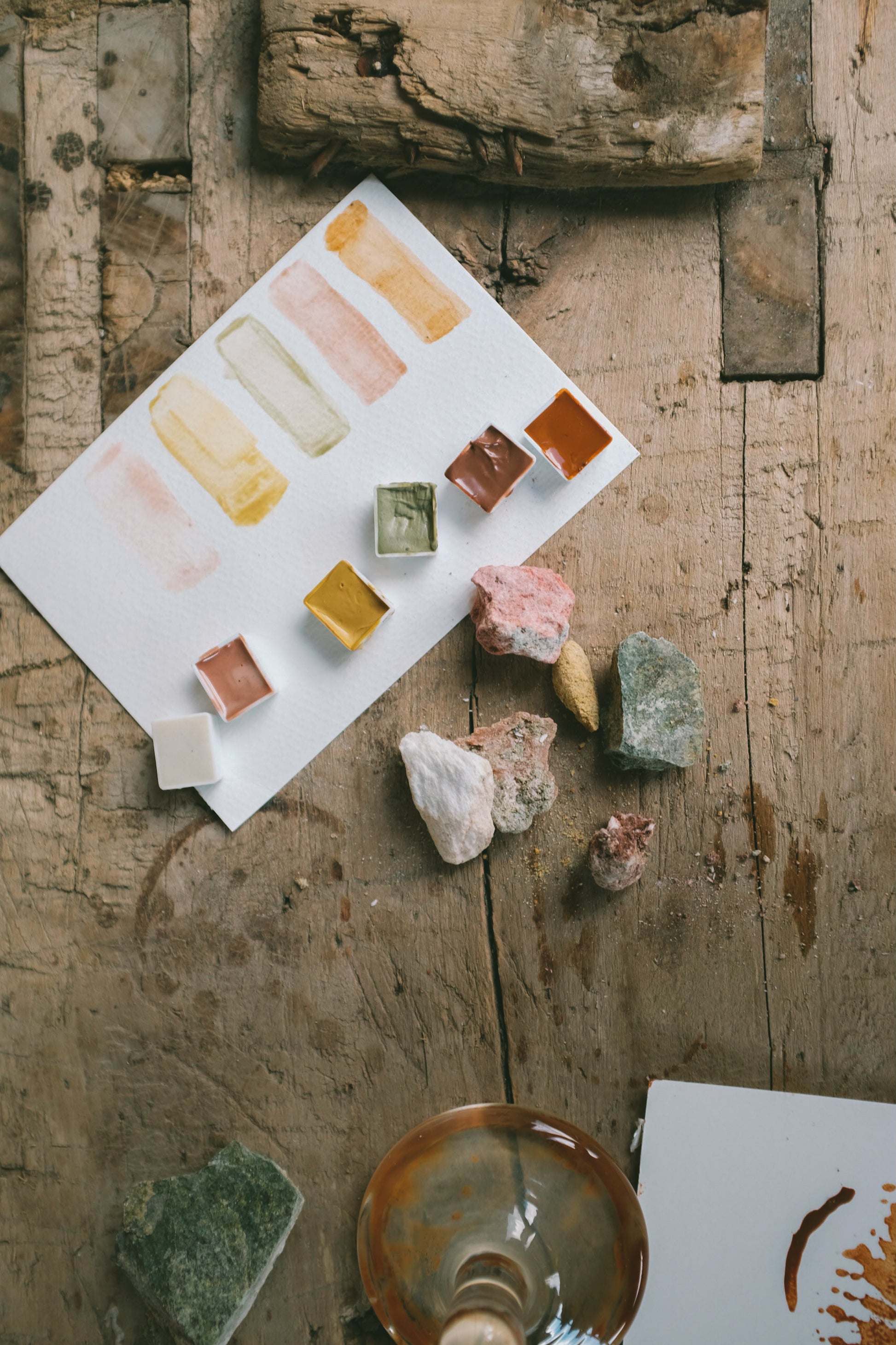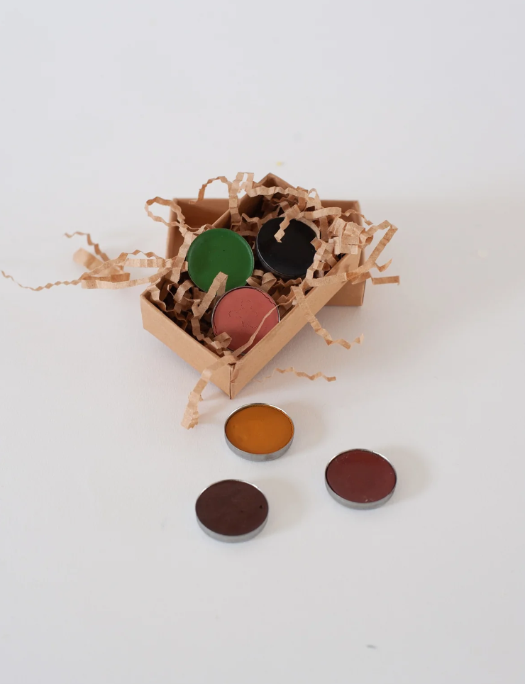 This natural watercolor paint palette includes 6 colors made from stones foraged in the Pallars Sobira district, in Spain. Clara from Copito processes the pigments by hand and mixes them with a natural binder (made from tree sap and vegetable glycerin) and clove oil which acts as a natural preservative.