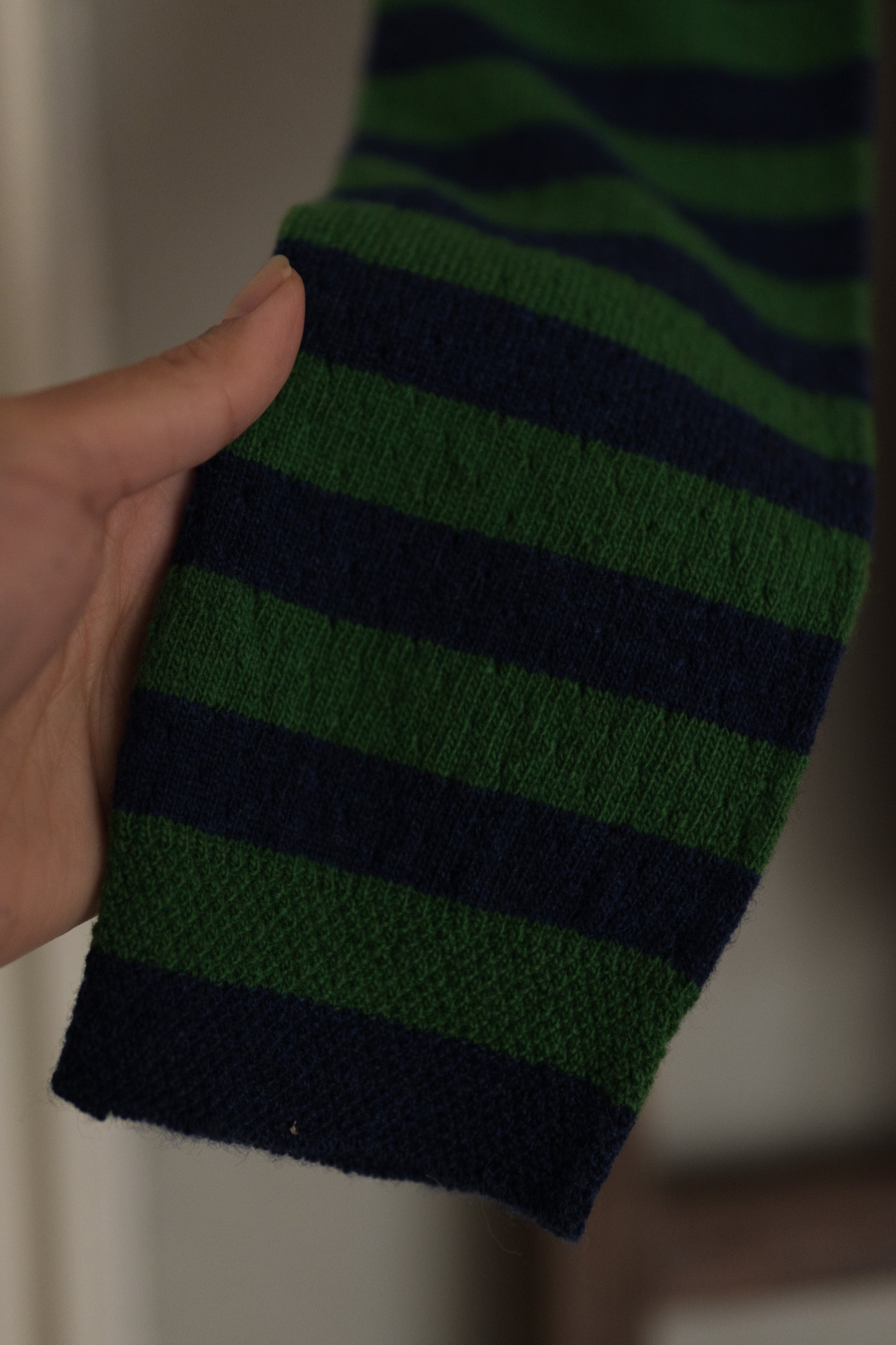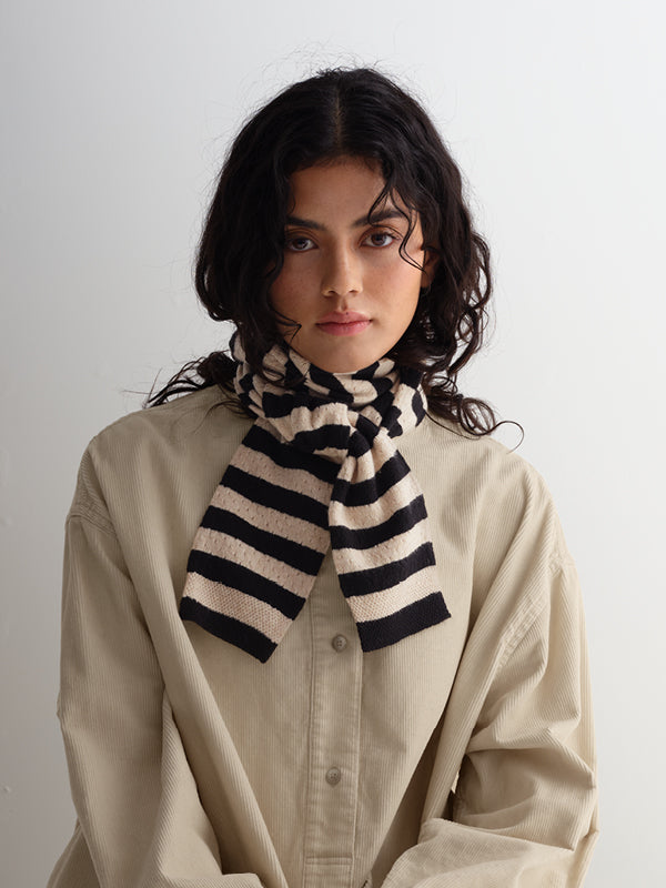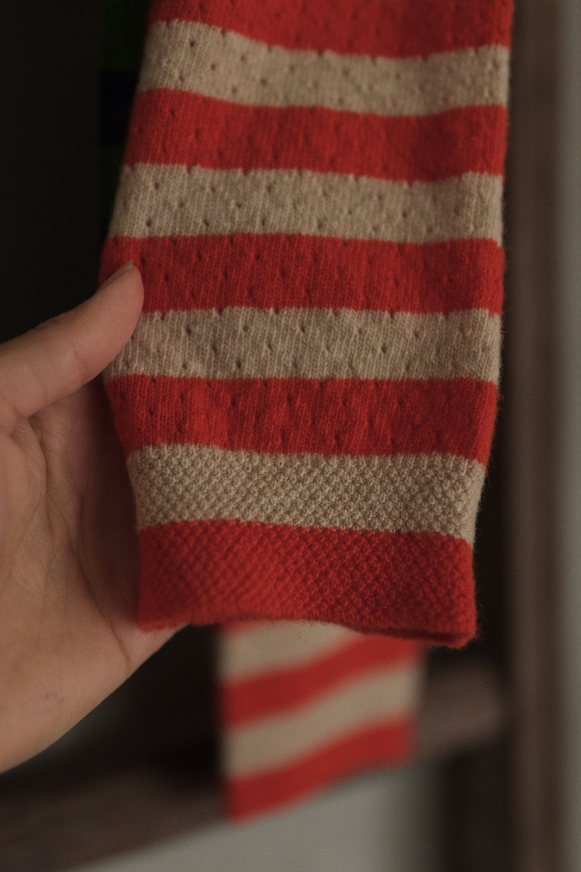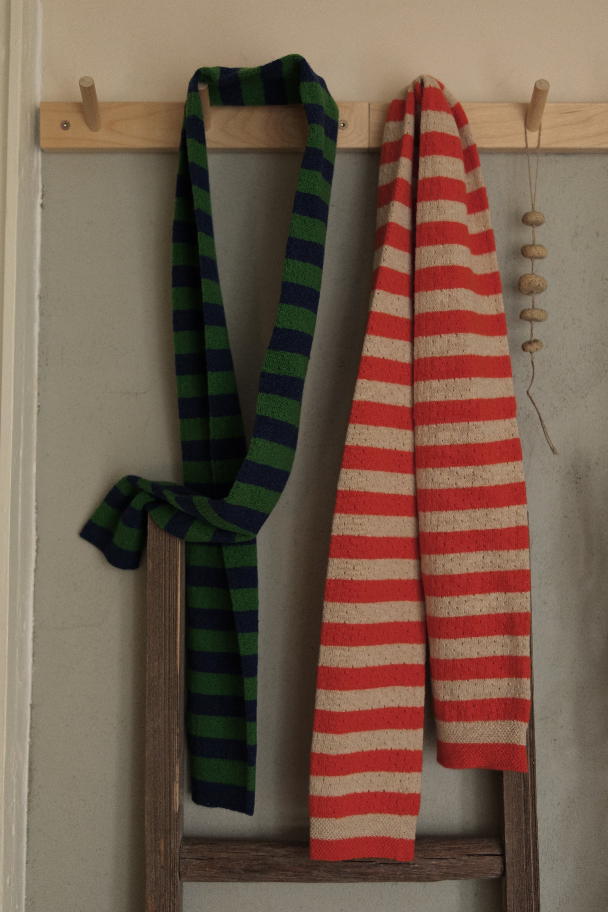 This pointelle stripe scarf is made from the softest lambswool and measures 130 x 10 cm. Knitted in Leicestershire, England, this is a small all-season double layered fine soft stripe scarf with an all over pointelle stitch. Wear tucked into a jacket, shirt, or coat for a pop of colour. Small enough to have in your bag for chilly moments.