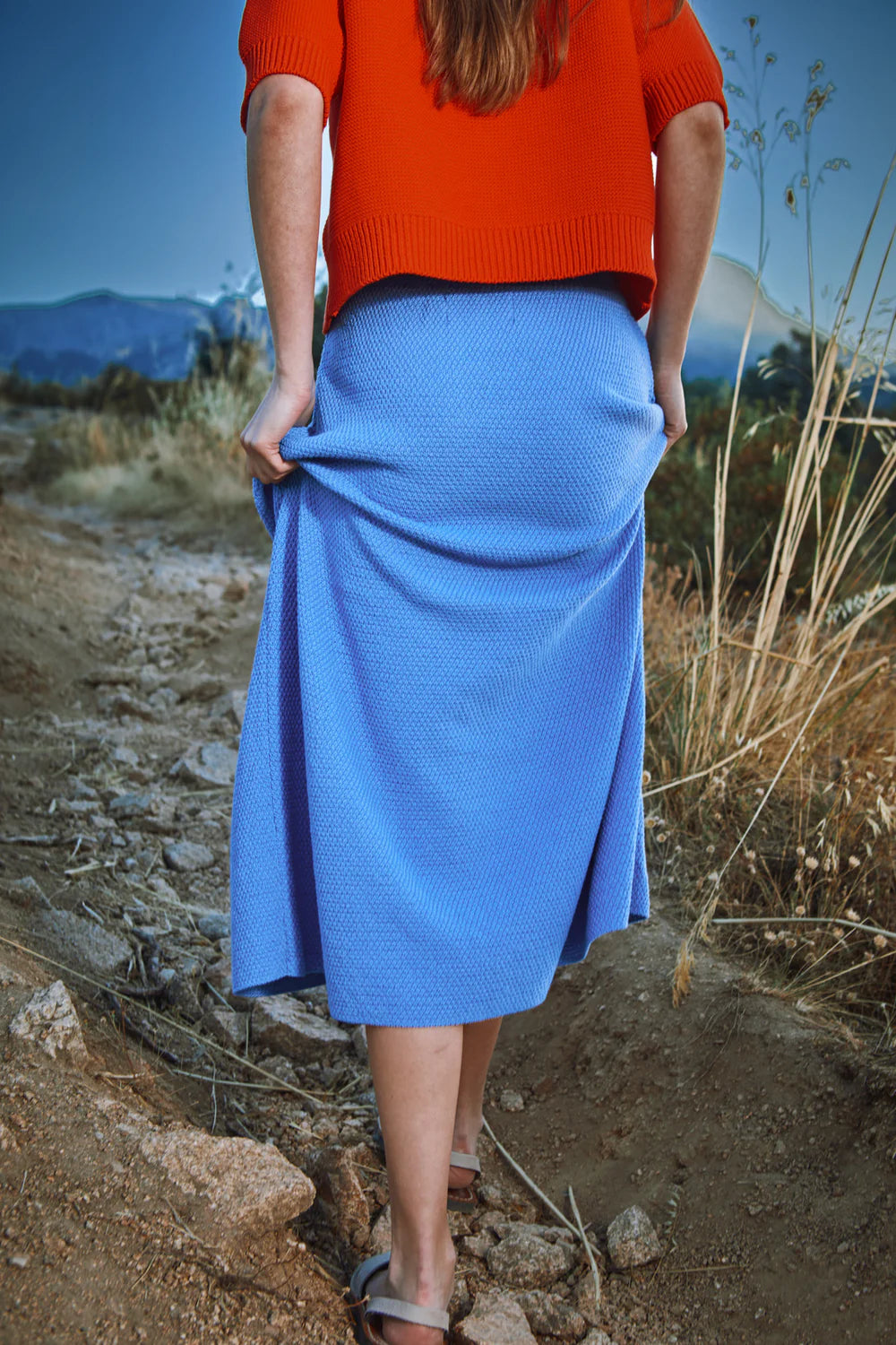 The Gilda skirt is knitted in a single thread of organic cotton. Its flared cut allows for effortless movement, while the textured stitch provides coverage without overheating. The elastic waistband ensures comfort without needing a belt making this style versatile—pair it with one of L'Envers' matching tops or keep it simple with a classic white t-shirt. This is a textured stitch, medium thickness, 100% organic cotton grown and spun in India and dyed in Portugal, this piece is pre-washed for a rich textured look that does not shrink in the wash! It is thick enough for perfect hold and no see-through.