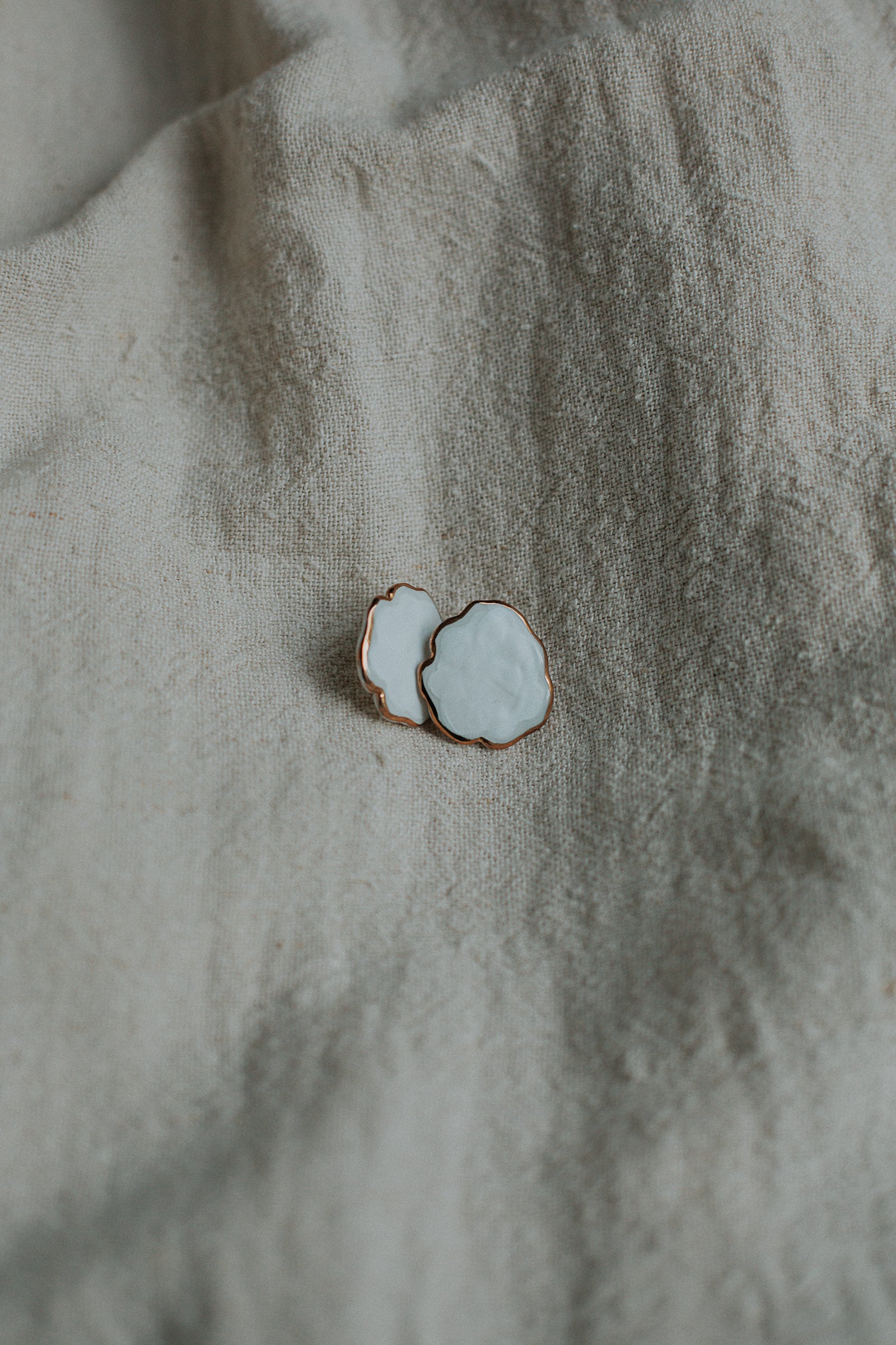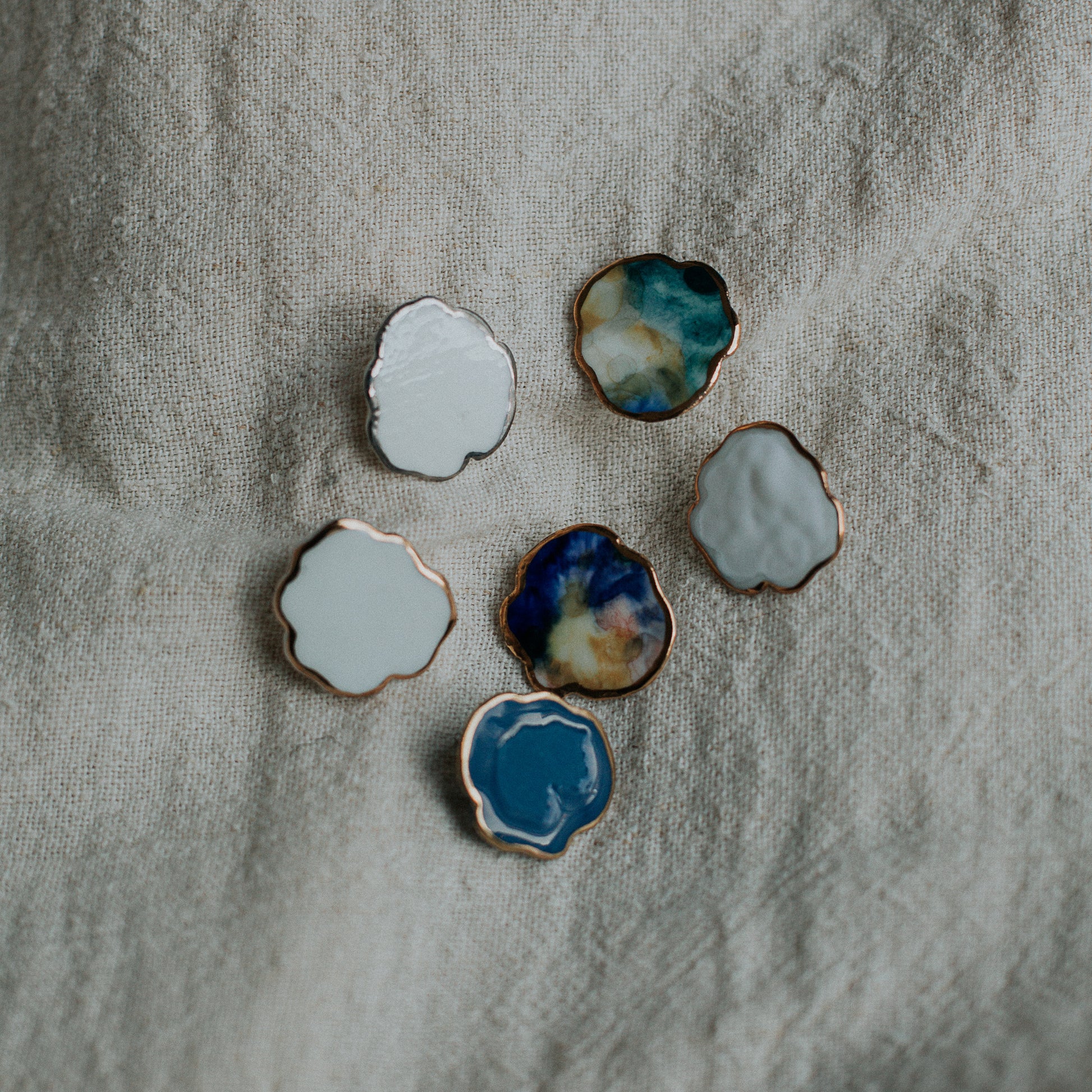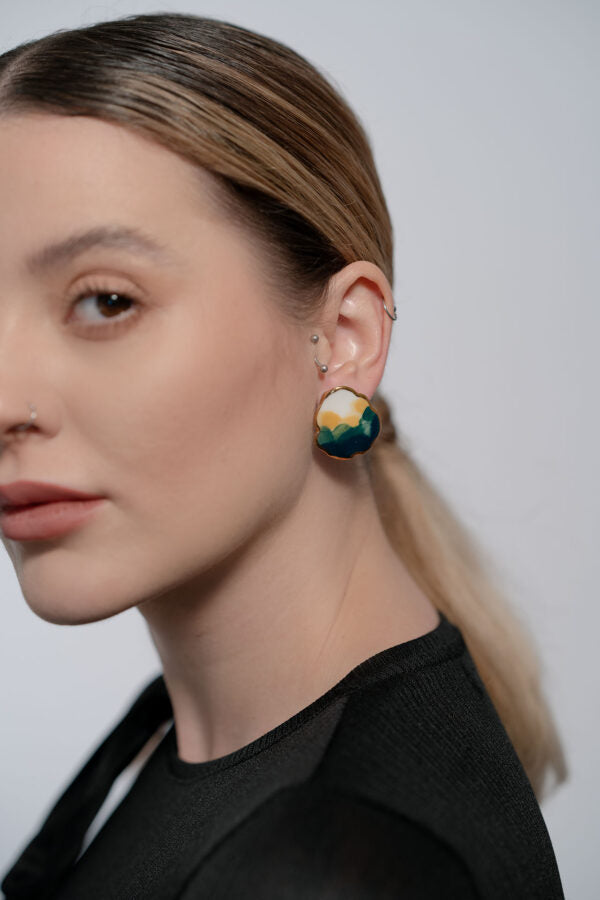 Diana Cojocaru’s statement earrings are hand-sculpted in porcelain, hand-painted using ceramic watercolors, fired in the kiln, and detailed with 24k gold or platinum. Earring post and clutch are made from sterling silver. Each piece is light and comfortable to wear.