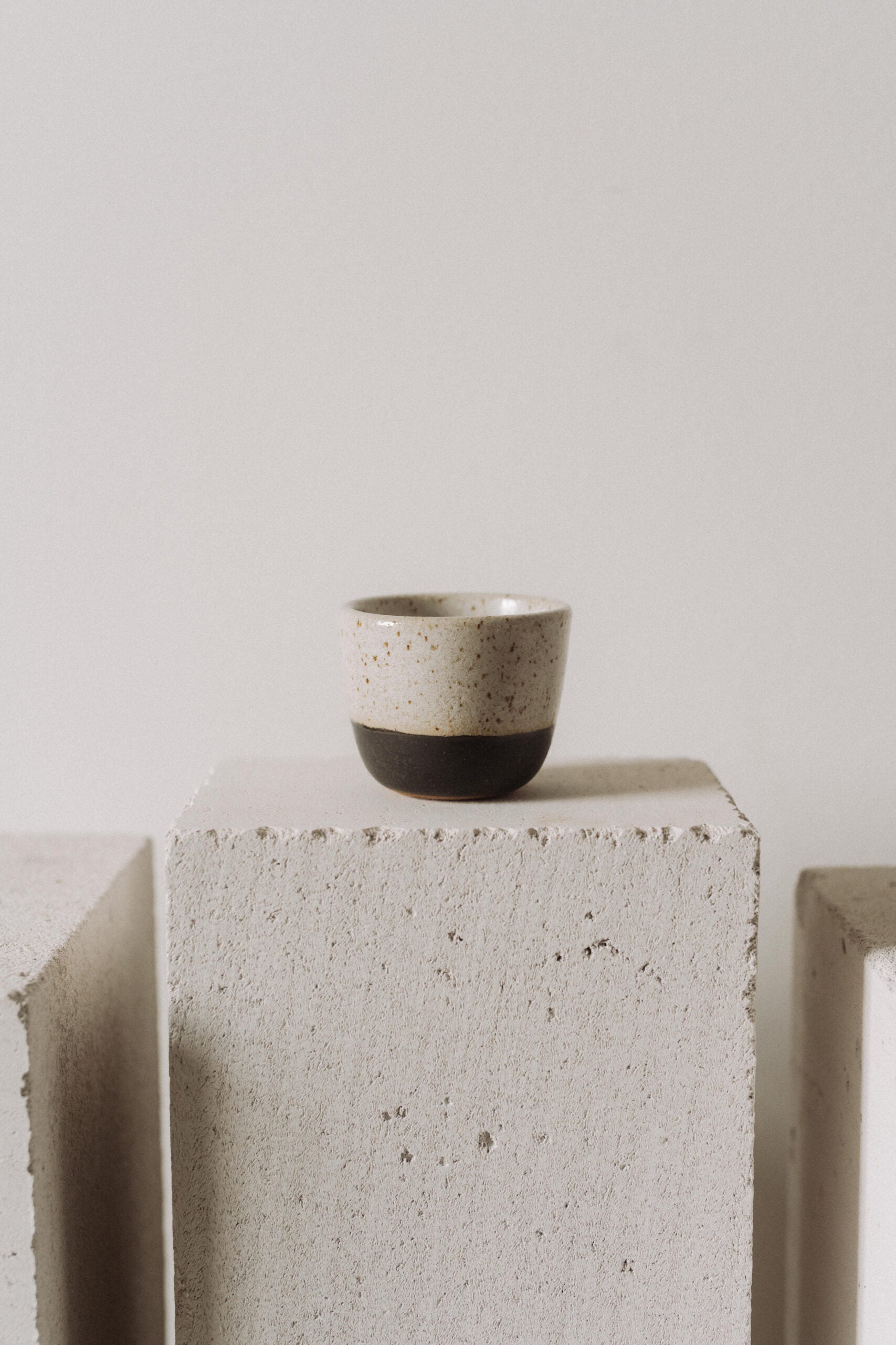 This medium-sized cup is made of beige stoneware with speckles. The glaze is black and white with beige effects and it creates different effects on each item so no two products are exactly alike. The bottom of the cup is unglazed. I also really love it for tea or for enjoying a cup of coffee, be it warm or cold. The cup has a capacity of 200 ml and is dishwasher safe. This being a handmade product, dimensions and colors may slightly differ from one item to another.
