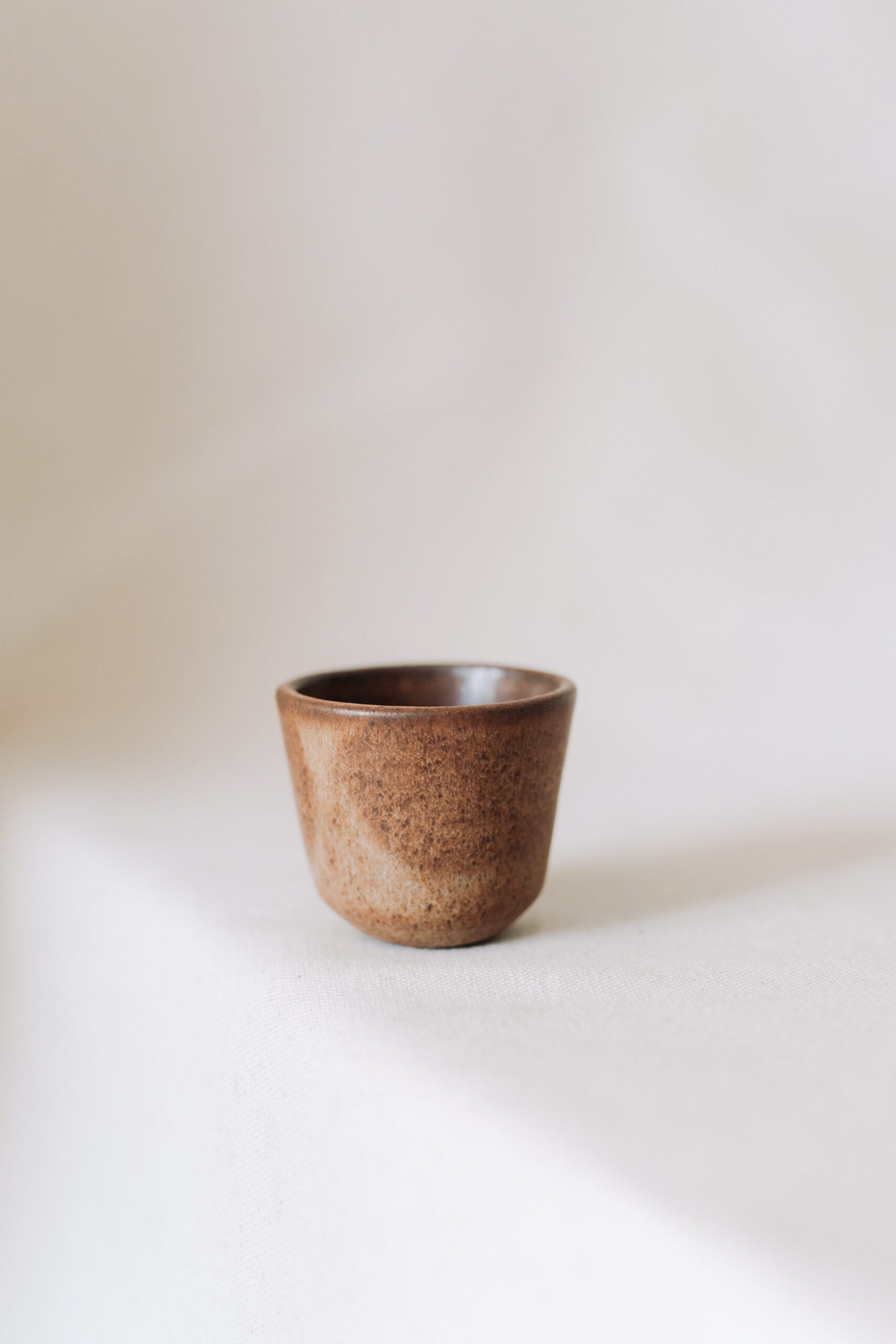 This ochre small tea cup is handcrafted out of black stoneware and glazed with an ecological glaze that gives it a varying shade between light and dark brown. The cup has a capacity of 60 ml and is dishwasher safe. This being a handmade product, dimensions and colors may slightly differ from one item to another.