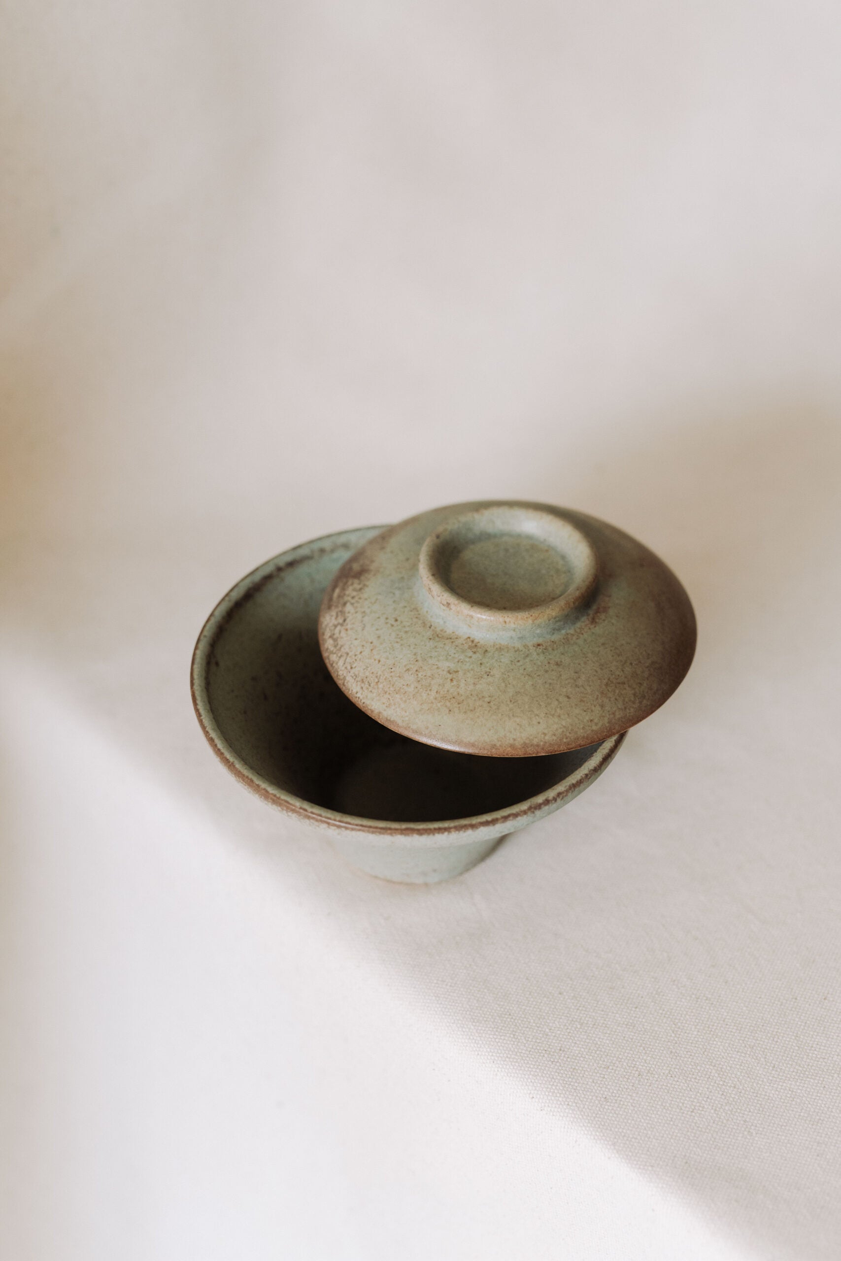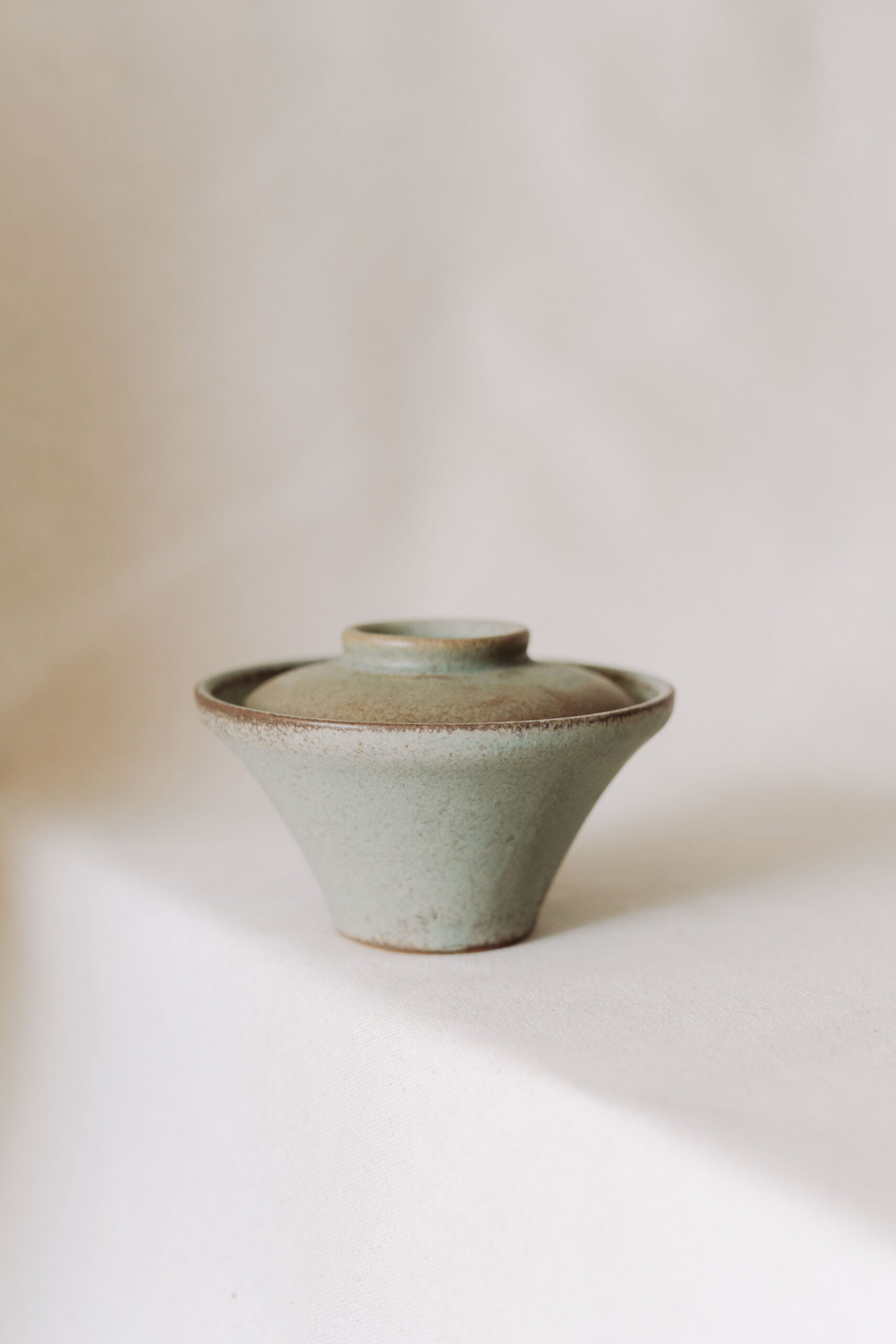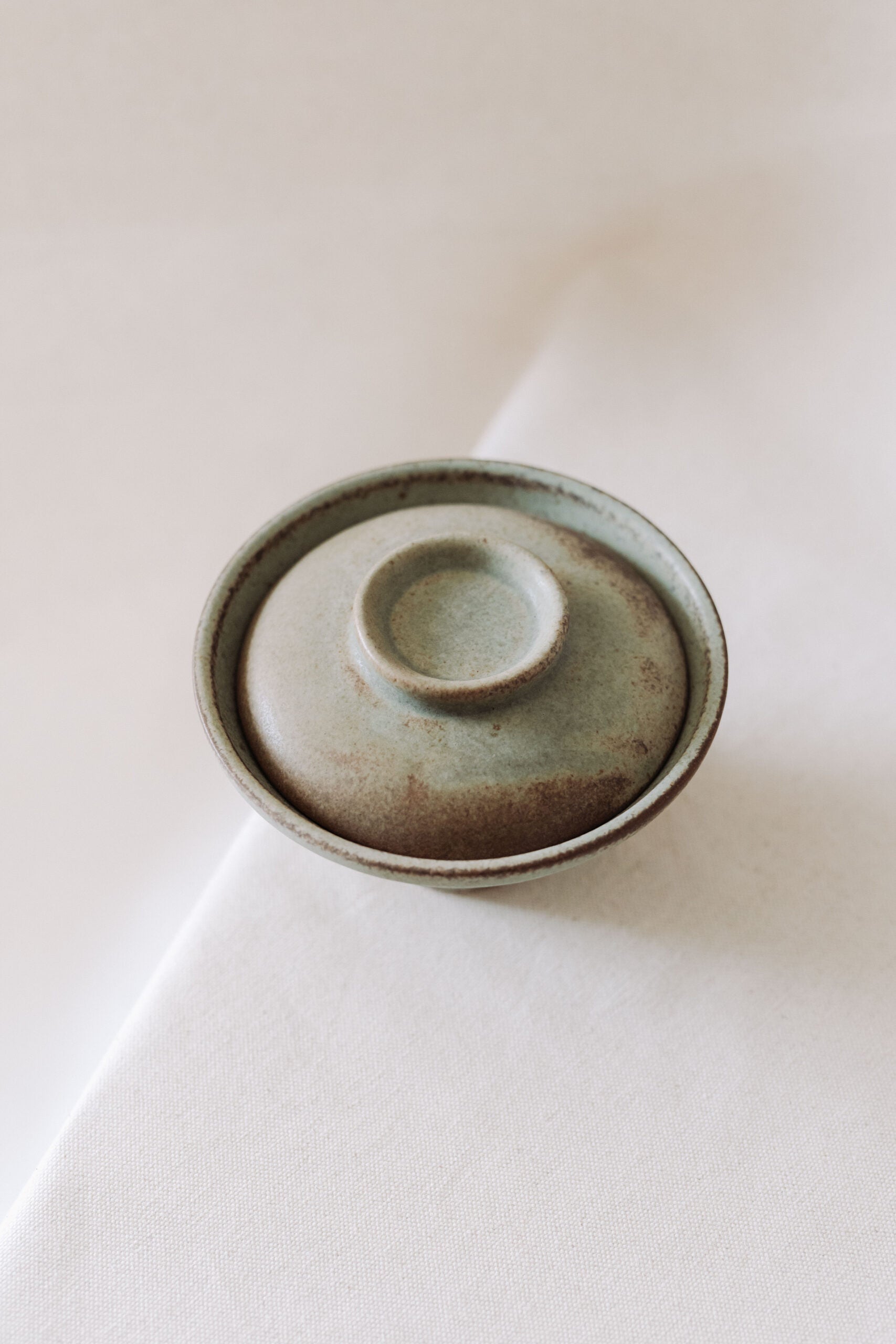 This miso bowl with lid is handcrafted out of stoneware and glazed with an ecological glaze that gives it a sage-green and dark brown appearance. It can be used for individual servings of soup or as a vessel to store various delicious concoctions for sharing. This being a handmade product, dimensions and colors may slightly differ from one item to another.
