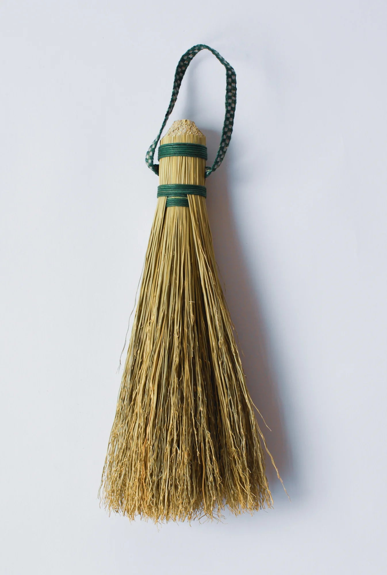 This is a simple small brush that Cynthia designed, based off the start of a hawks tail broom--classic meets modern in a sturdy utilitarian sweep. She made it with natural dyed organic cotton cord and a checkered handwoven organic linen band, and using a non electric process in the Sunhouse Craft studio/storefront. The simple small brush measures approximately 28 x 14 x 5 cm.