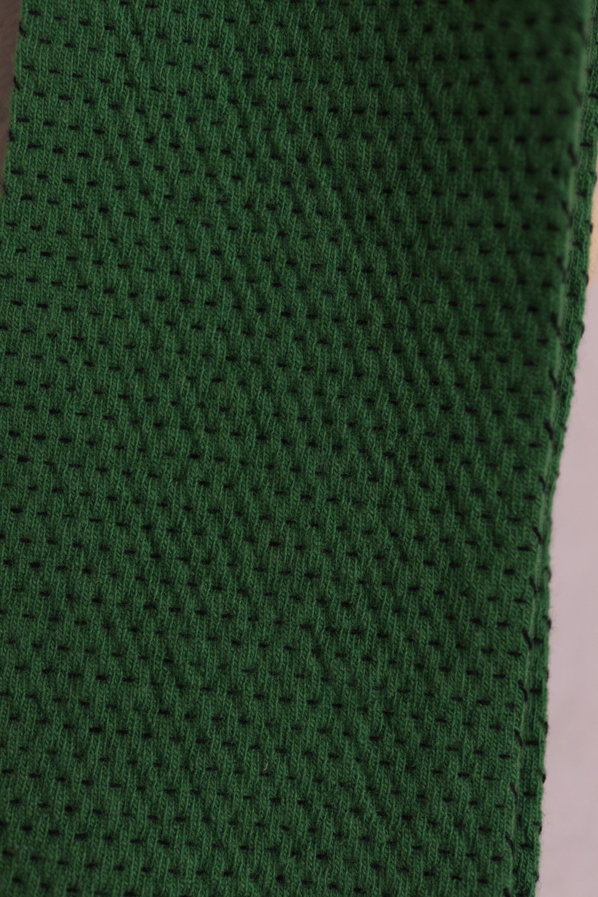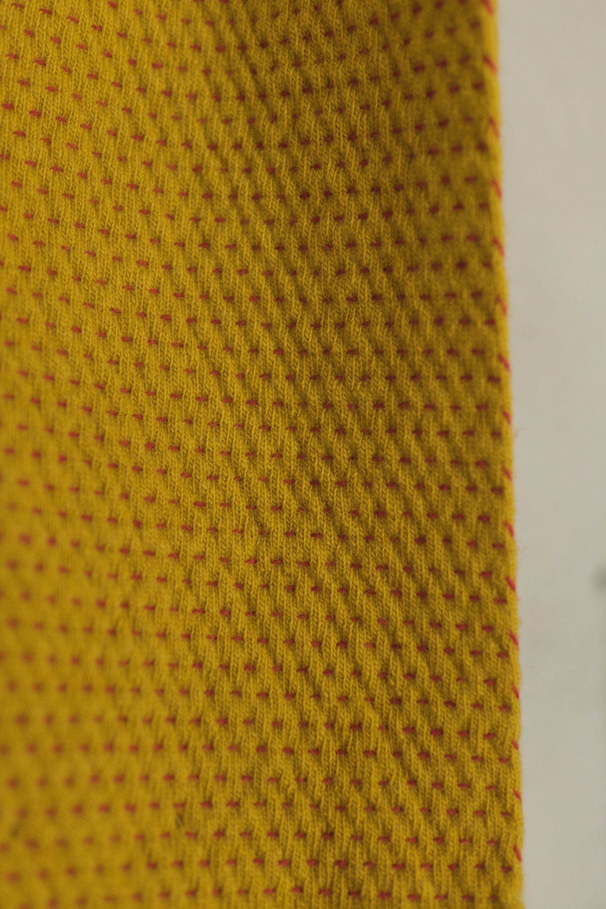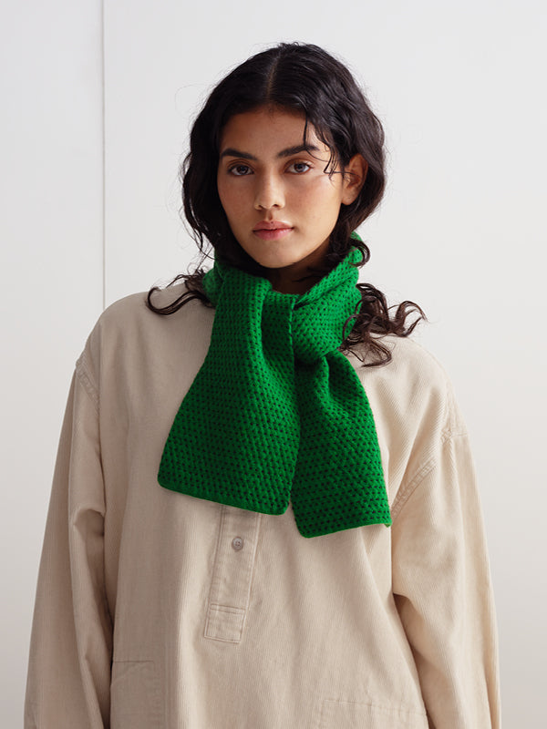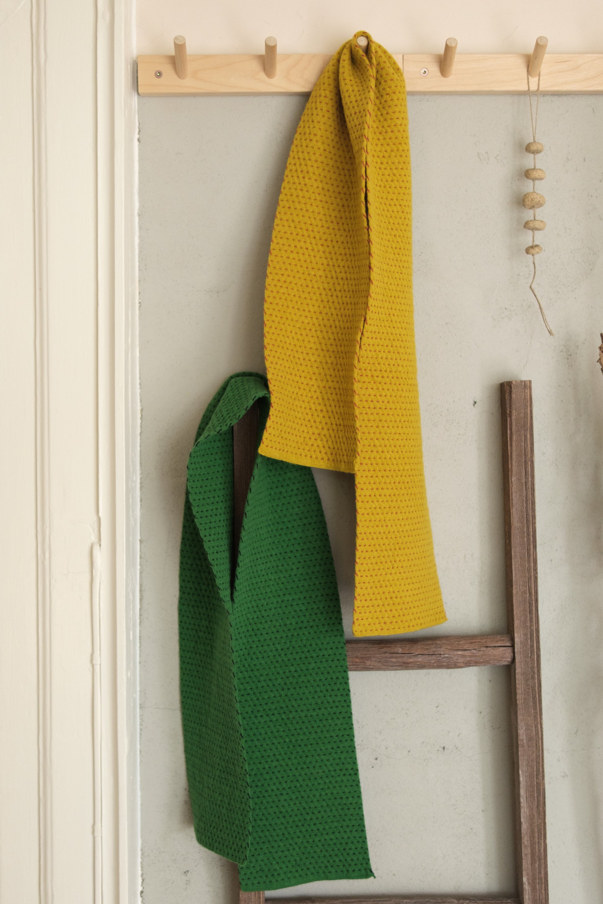 This small stitch scarf is made from the softest lambswool and measures 122 x 14 cm. Knitted in Leicestershire, England, this is a small all-season color block scarf with a contrast stitch in a double layer of fine soft knit lambswool. The pattern is inspired by Japanese ‘Boro’ textiles. Wear tucked into a jacket, shirt, or coat for a pop of color. Small enough to have in your bag for chilly moments.