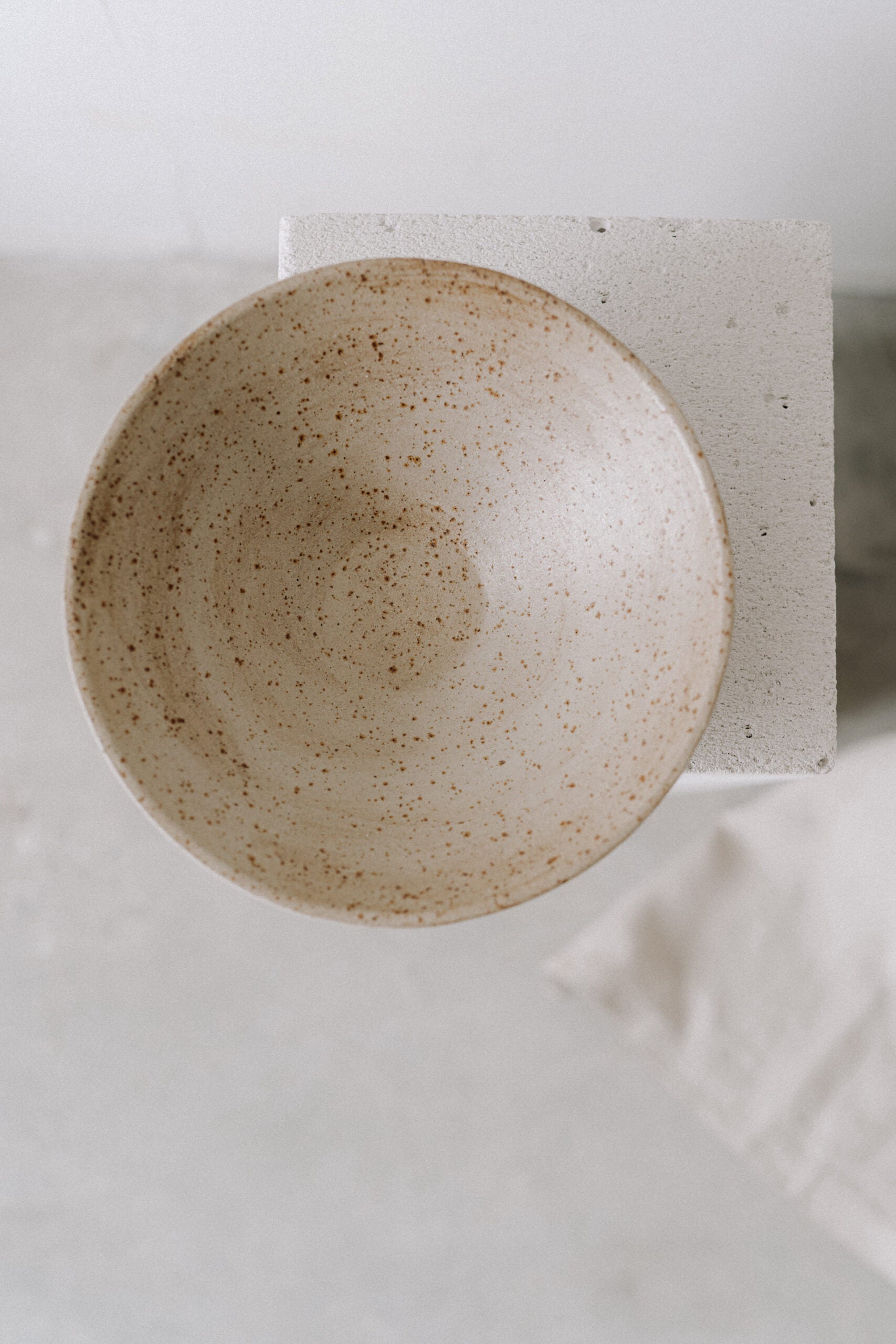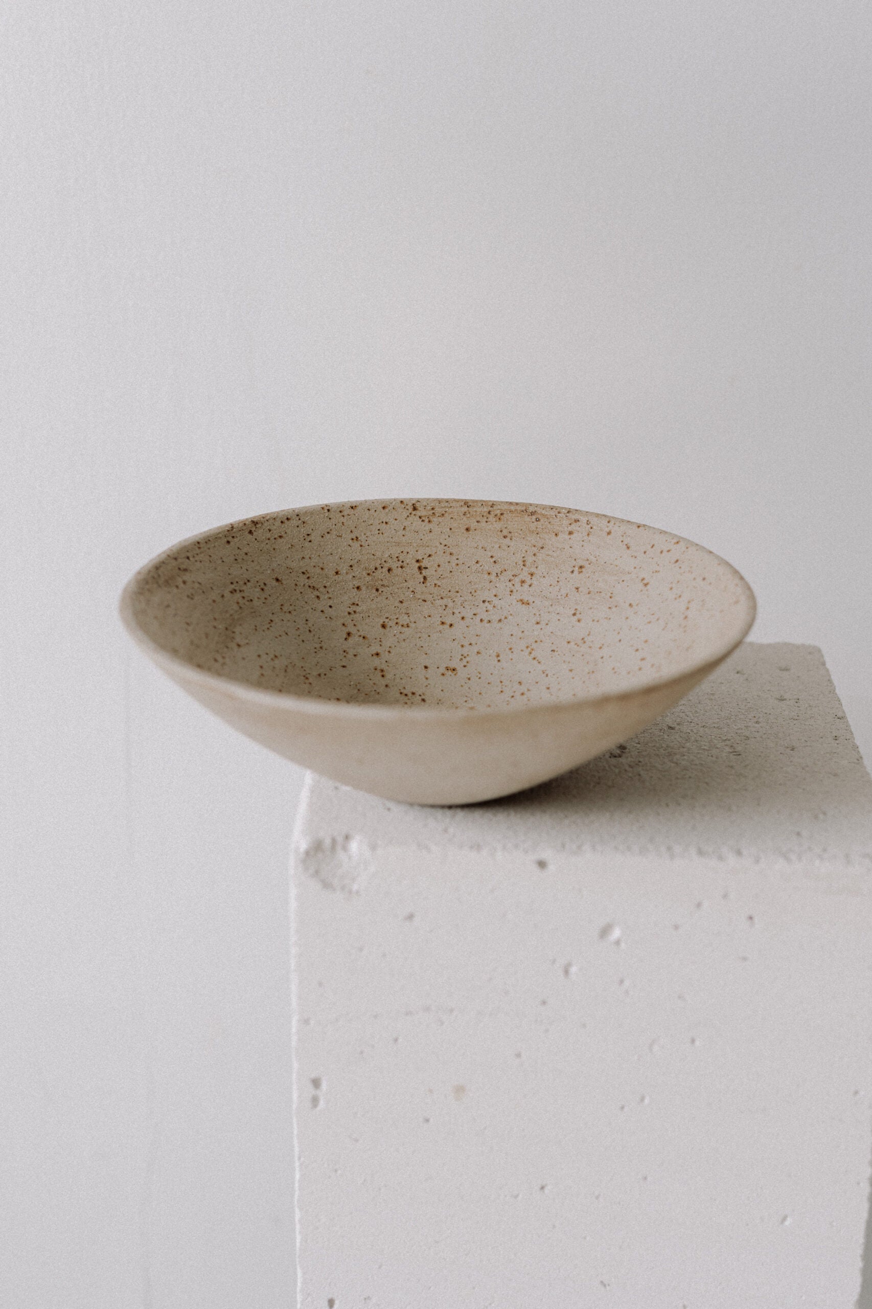 This handcrafted serving bowl is made of recycled stoneware and wood ash. Its beige glaze has a natural, raw appearance. It is also dishwasher safe.