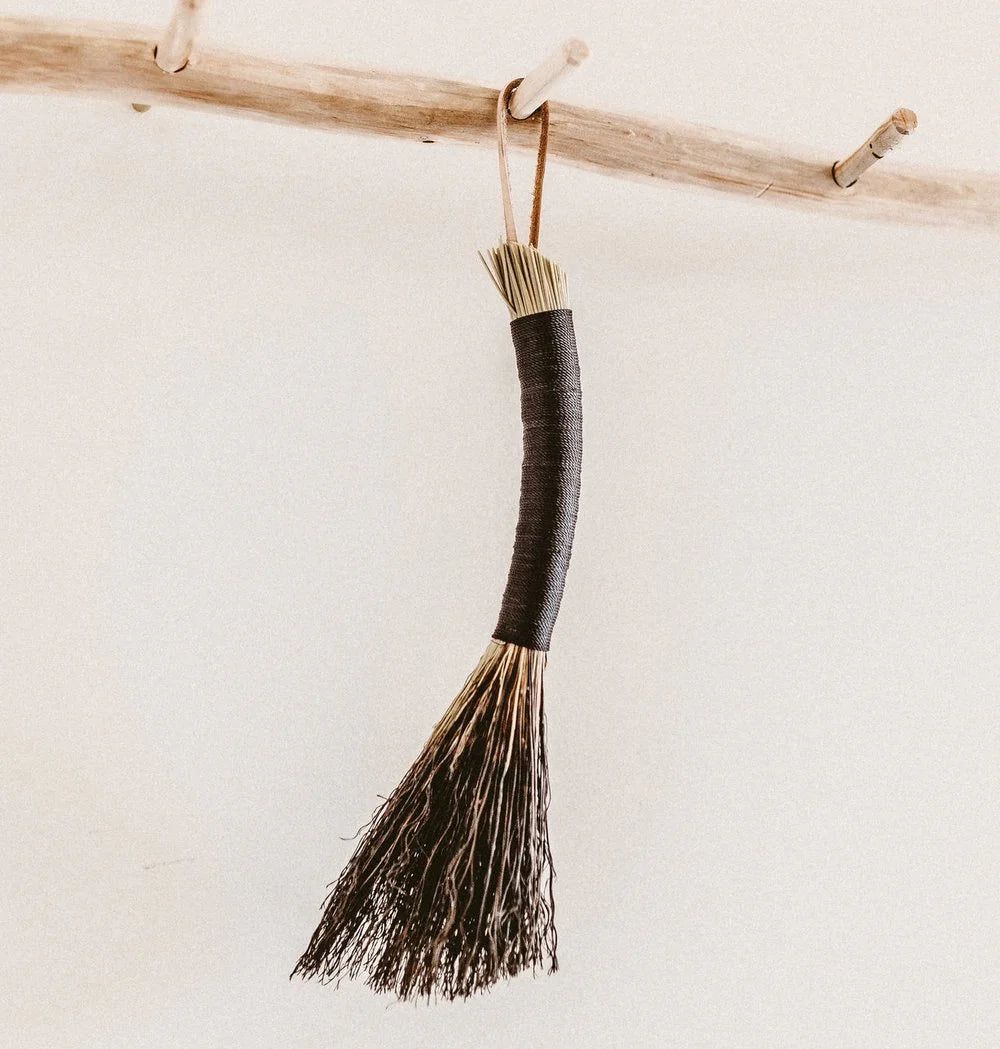 This gibbous broom is inspired by the curve of the crescent moon (and named for a beloved feline!) and made of broomcorn. It is a black cotton wrapped broom, naturally dyed to achieve a dark stable finish at the ends. Raw leather handle comes out of the center. Expect some variations in color. It measures approximately 35.6 x 7.6 x 3.8 cm.