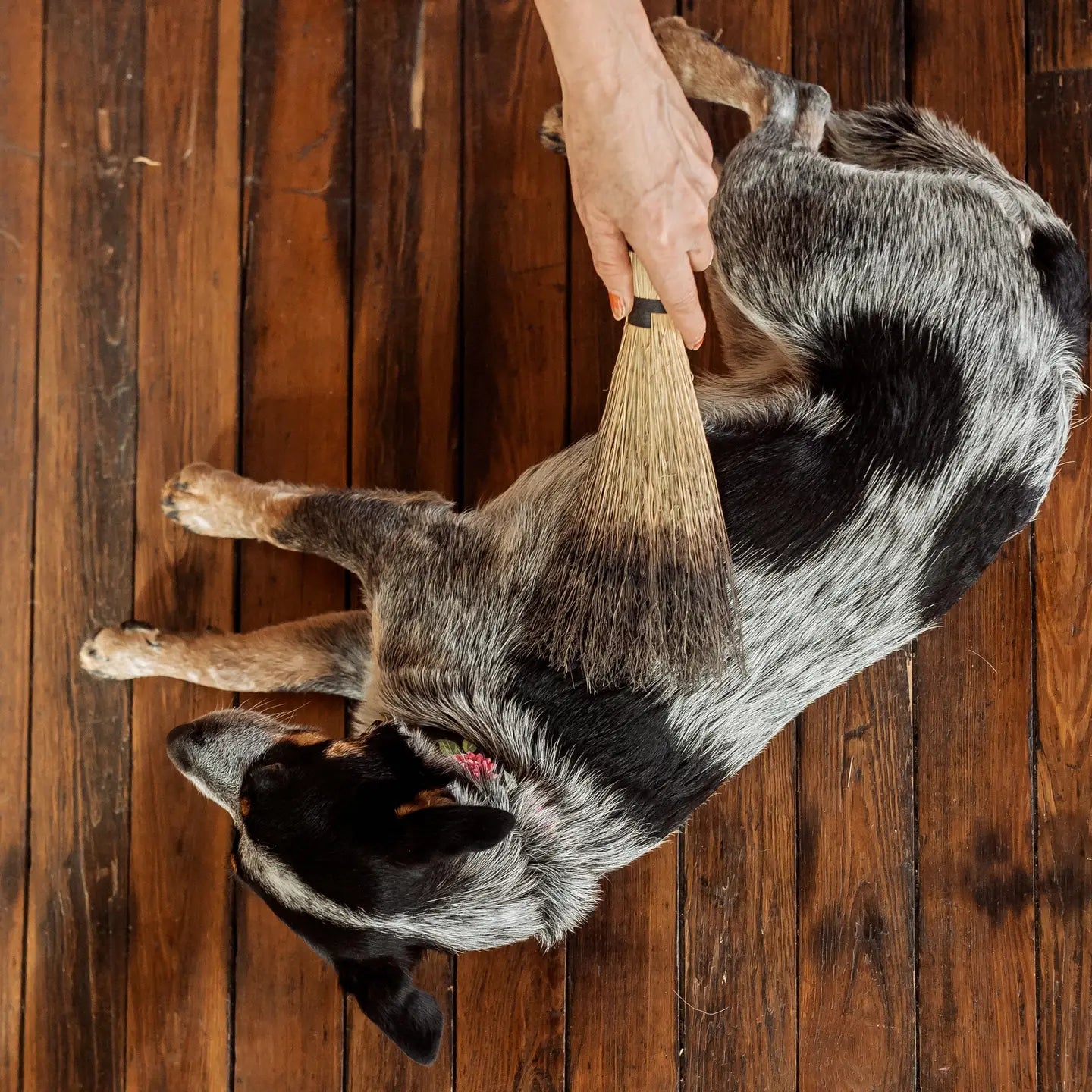 This tiger tail brush is a naturally dyed small brush with black hemp wrap and leather tie. Please note, because this is a naturally dyed product some variation in coloring is to be expected. The tiger tail brush measures approximately 28 x 14 x 5 cm.