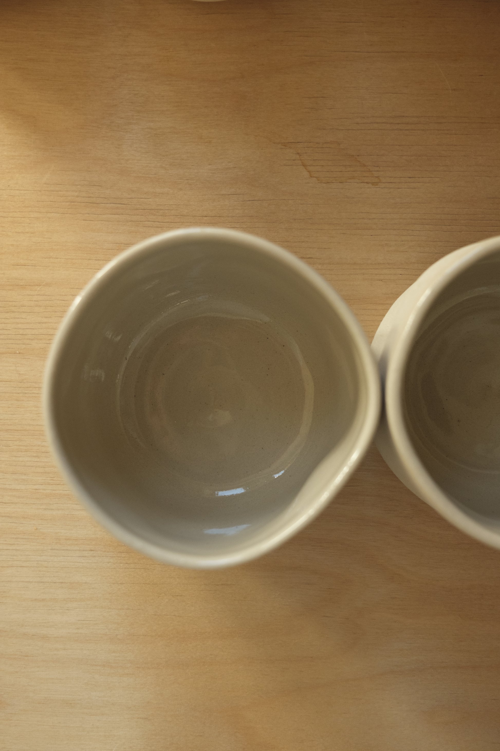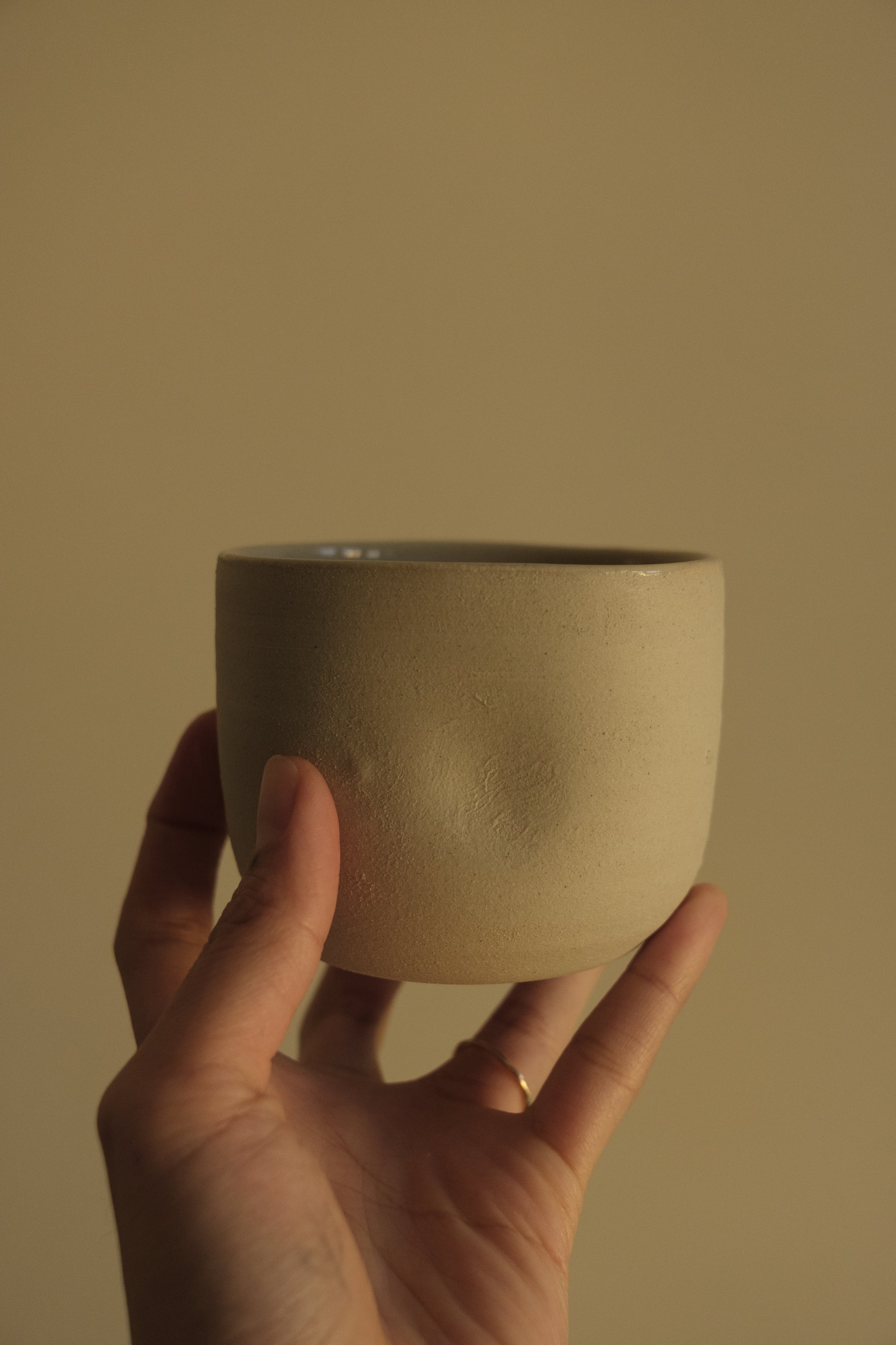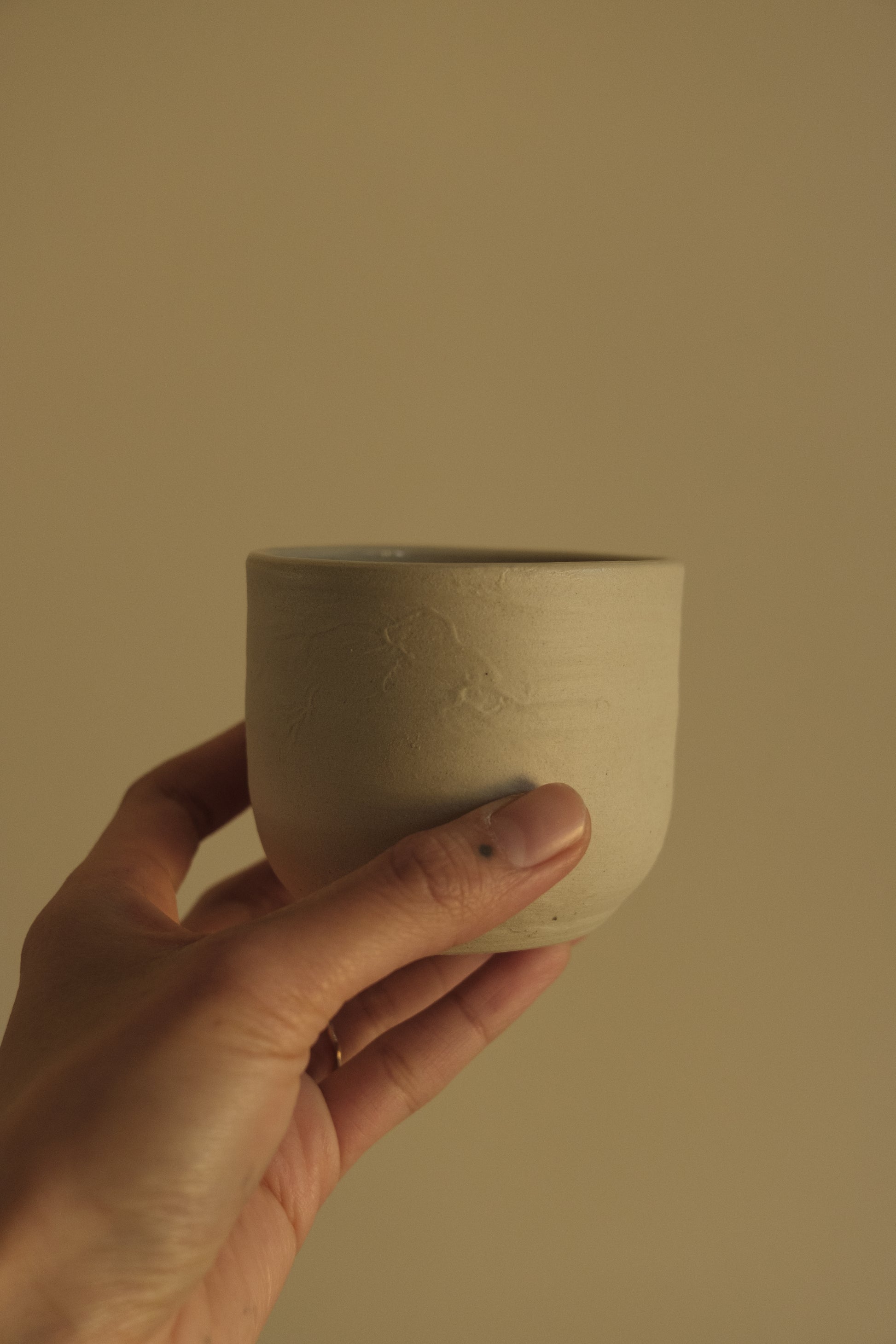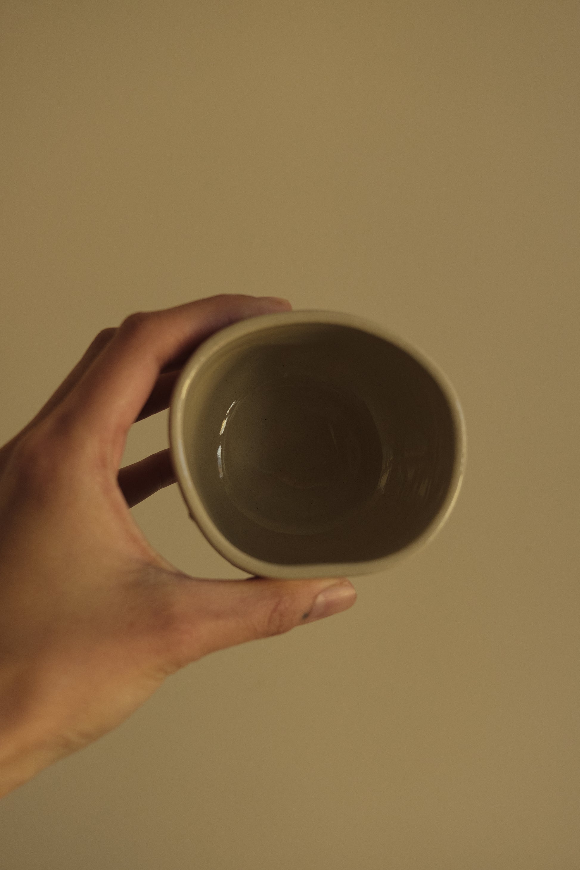 This uneven cup carries the thumb "prints" of its creator. Its raw outside surface, glazed smooth inside, and its curves, make it a unique experience. It comes in three sizes, from a cute small (but not too small) to a more generous hold.