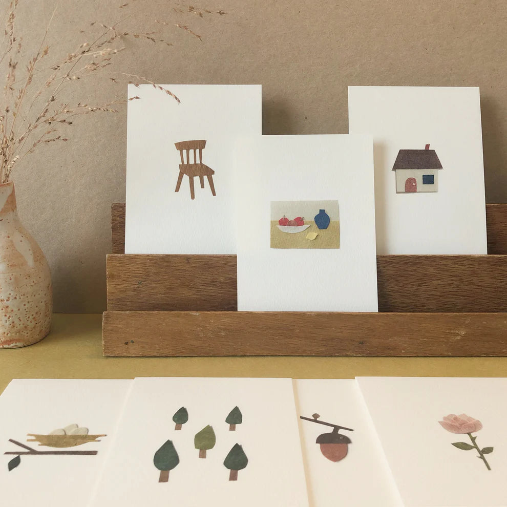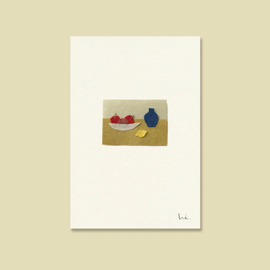 This postcard contains pigment ink prints of paper cut illustrations of an unframed painting of nature mort.