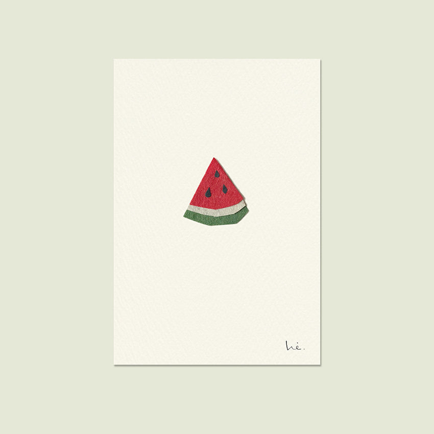 Each postcard contains pigment ink prints of paper cut illustrations of a watermelon slice, an expression of "natsu" (summer).