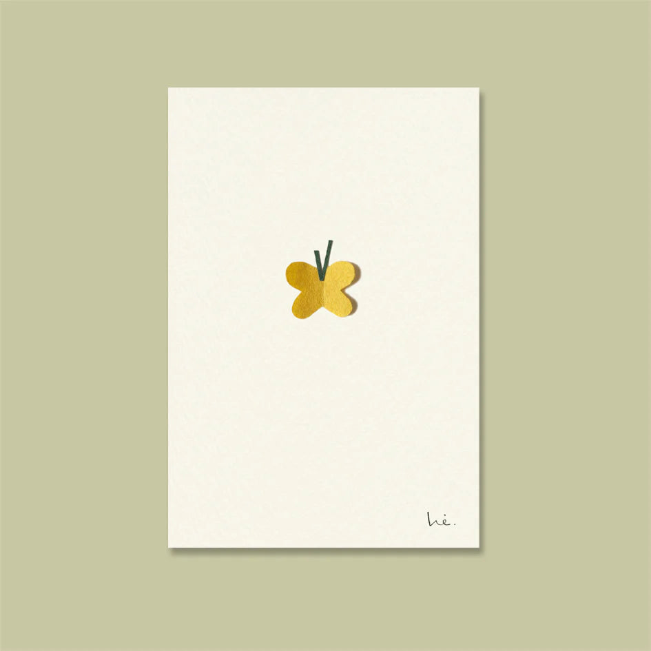 This postcard contains pigment ink prints of paper cut illustrations of a yellow butterfly, an expression of "natsu" (summer).